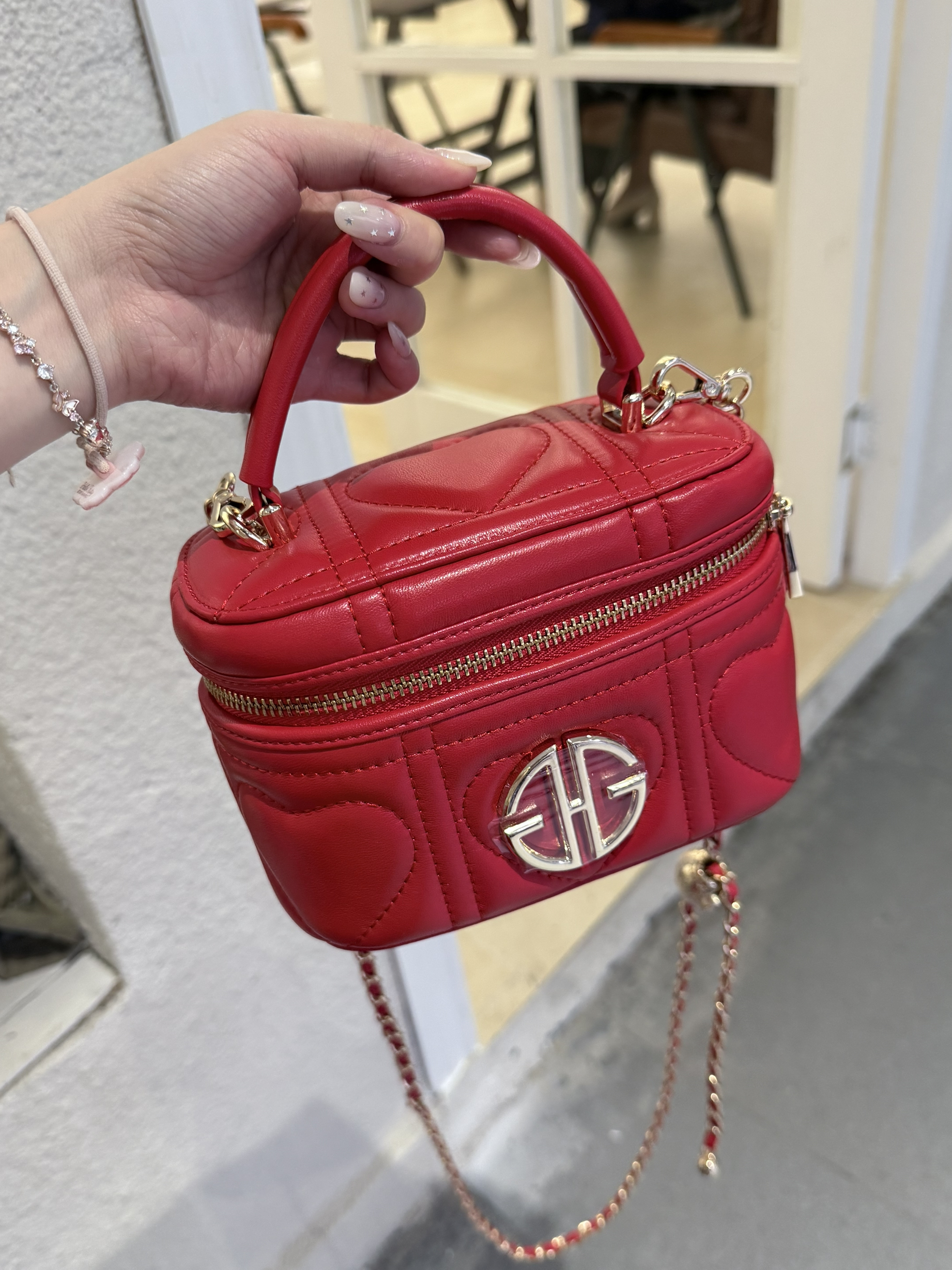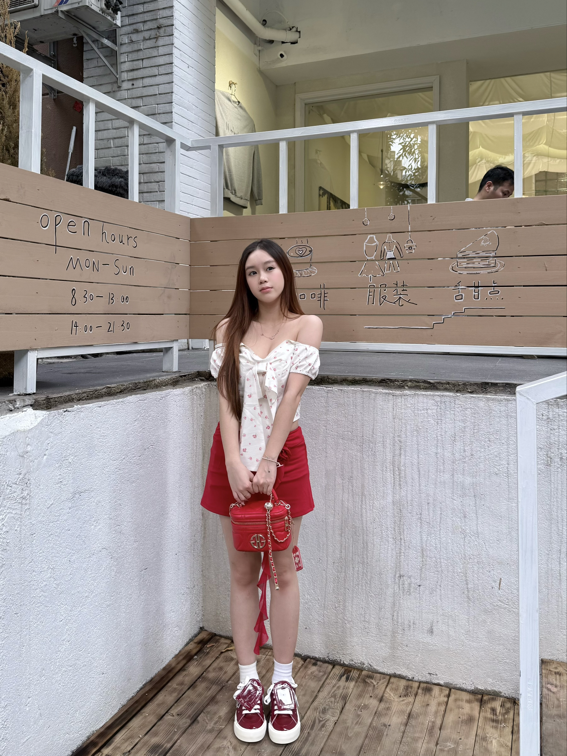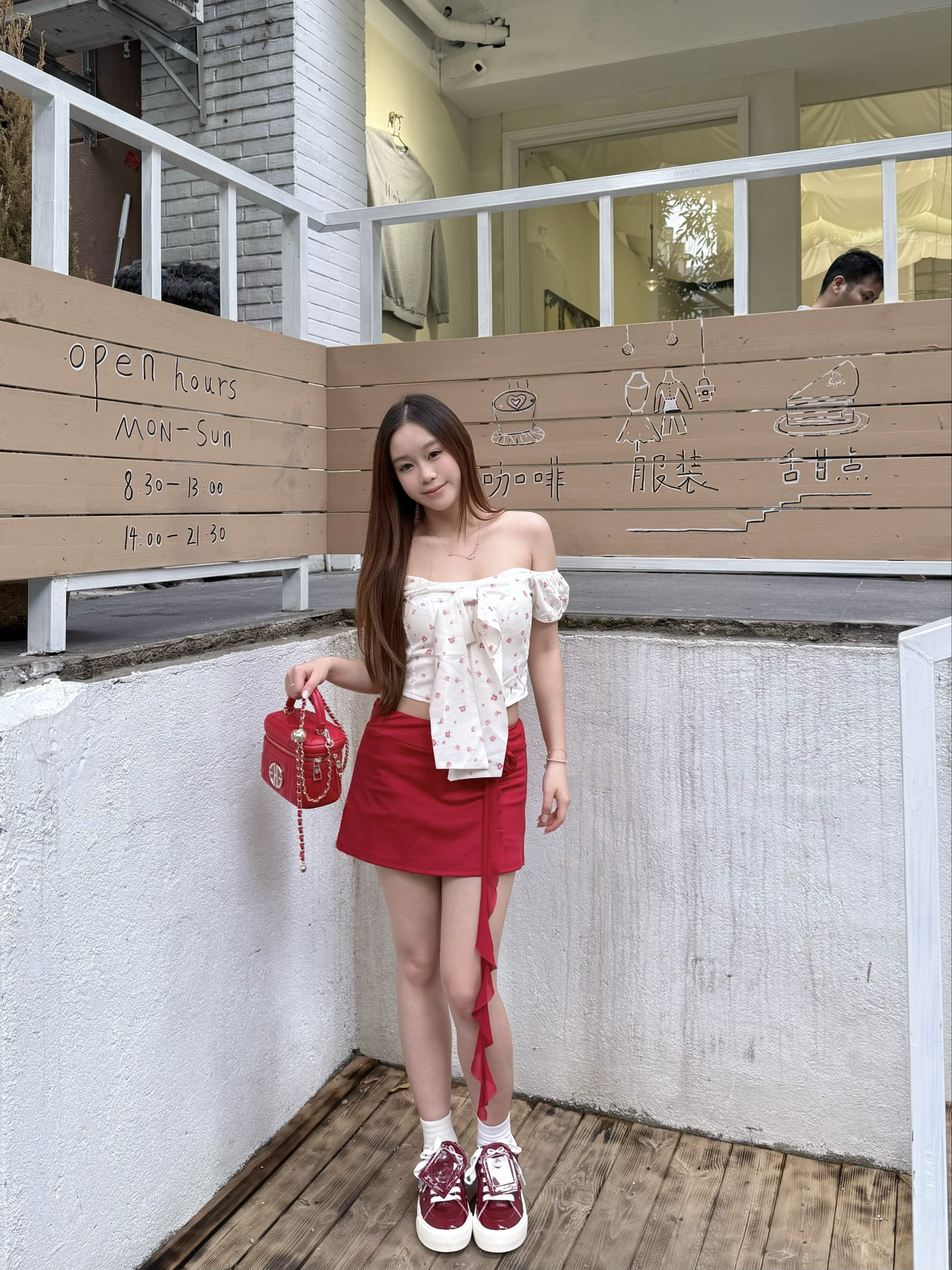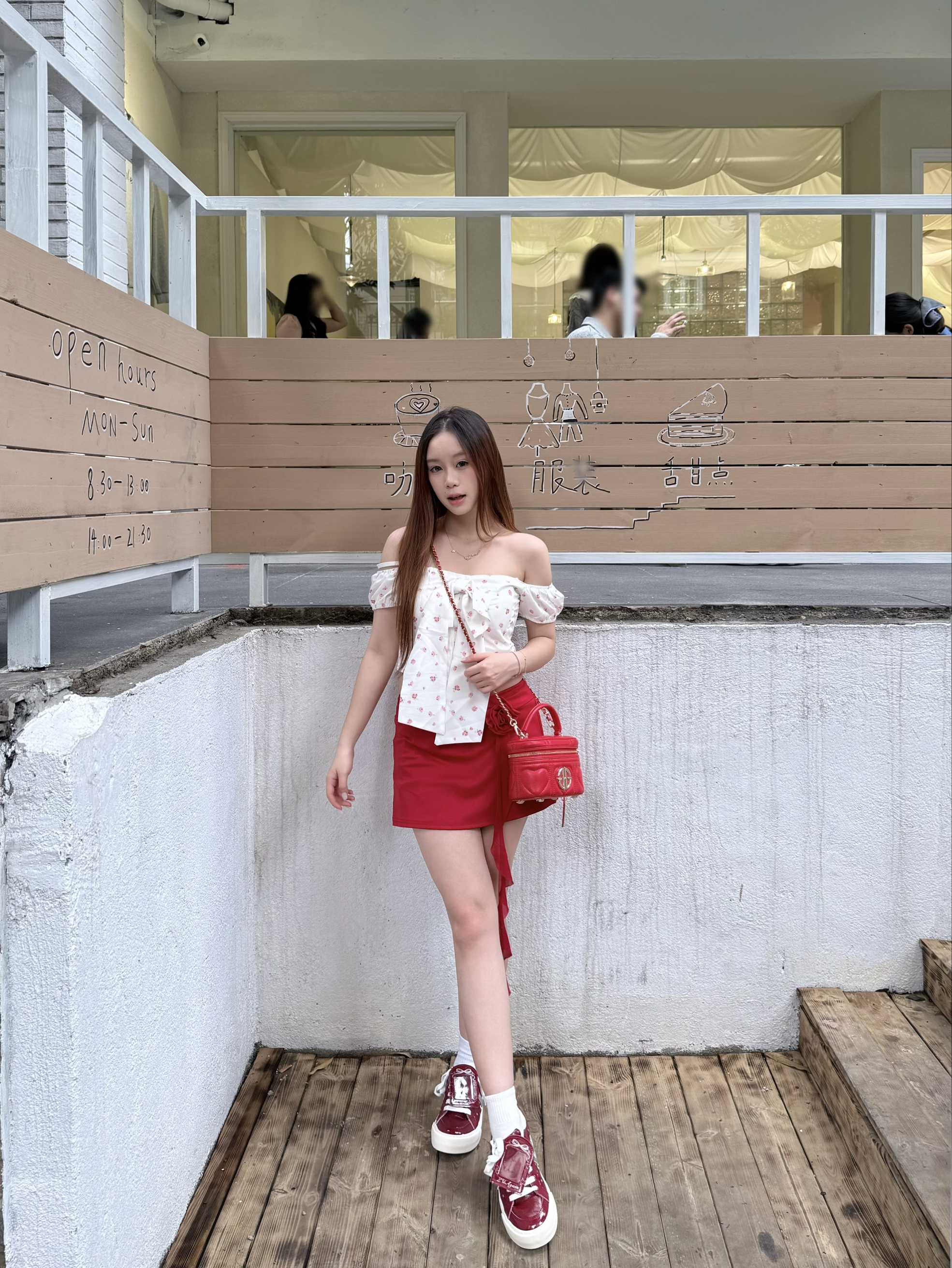 这套红白穿搭的灵魂就是这个红色菱格包包👜 亮红色超显白 和我今天穿的红裙、红鞋完美呼应 包包小巧精致又能装,甜酷感拉满 平时出门带个充电宝、口红都没问题滴👌 一字肩碎花上衣+红裙的搭配温柔又性感 探店这么穿 氛围感直接封神啦📸