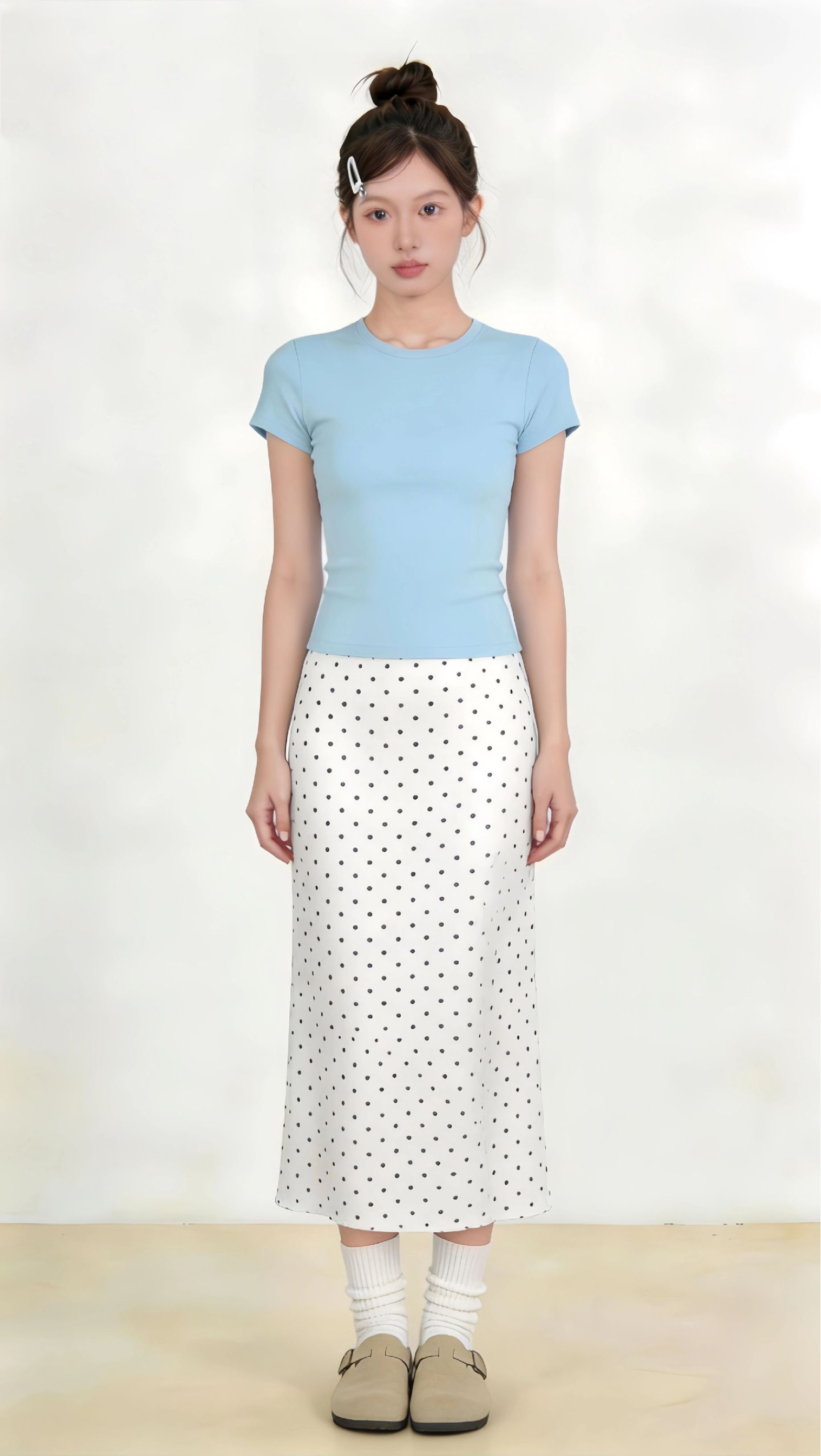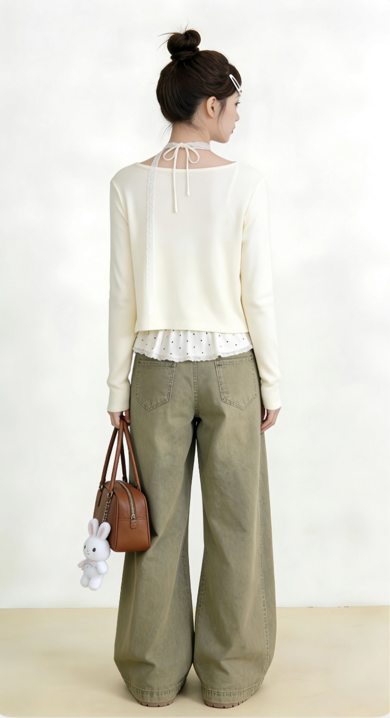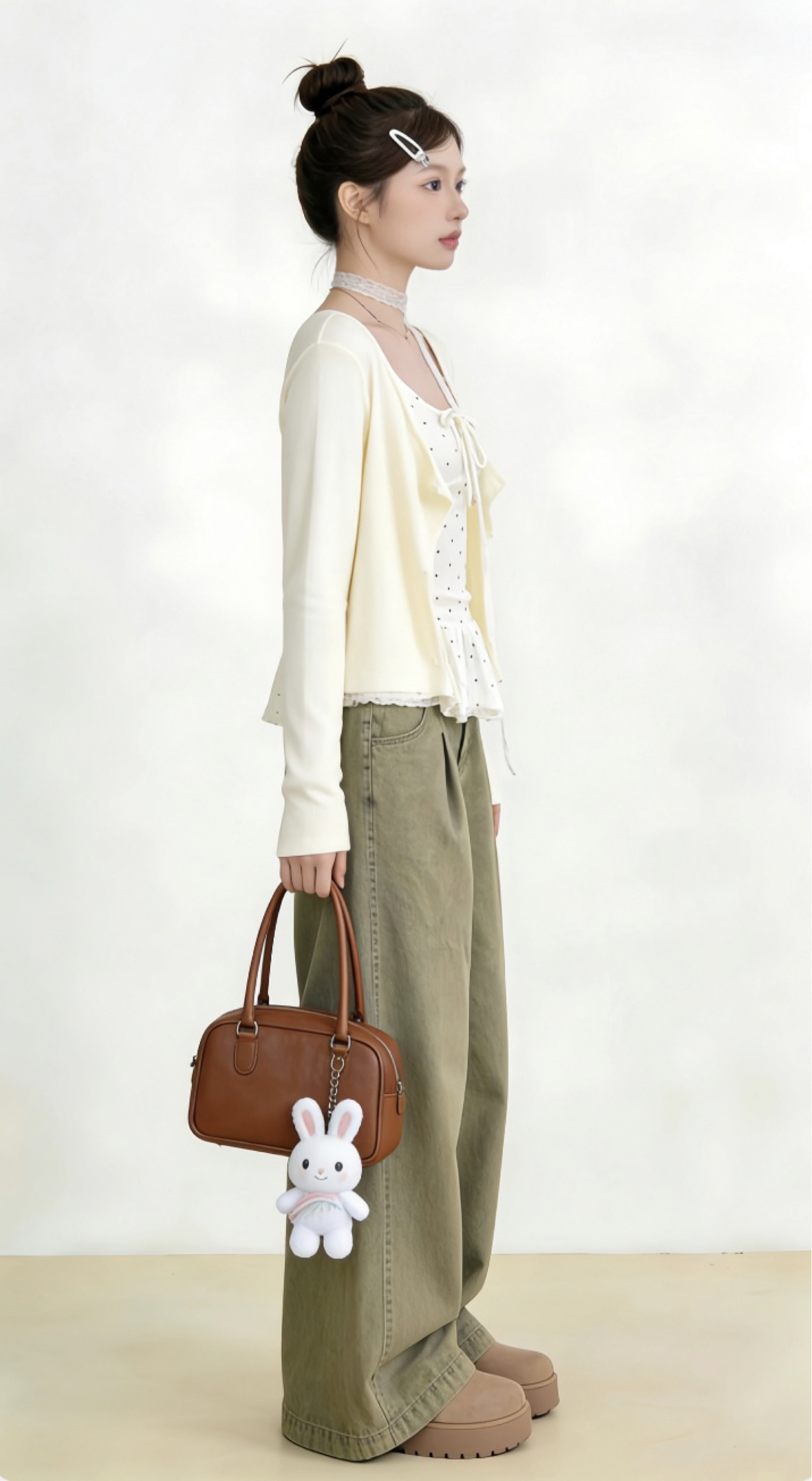 软乎乎的奶白开衫叠穿波点吊带, 蕾丝颈带和荷叶边悄悄藏住少女感, 搭配橄榄绿阔腿裤,慵懒又显腿长~