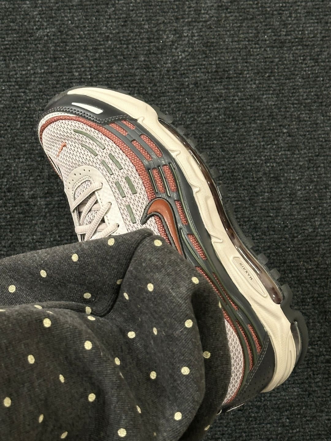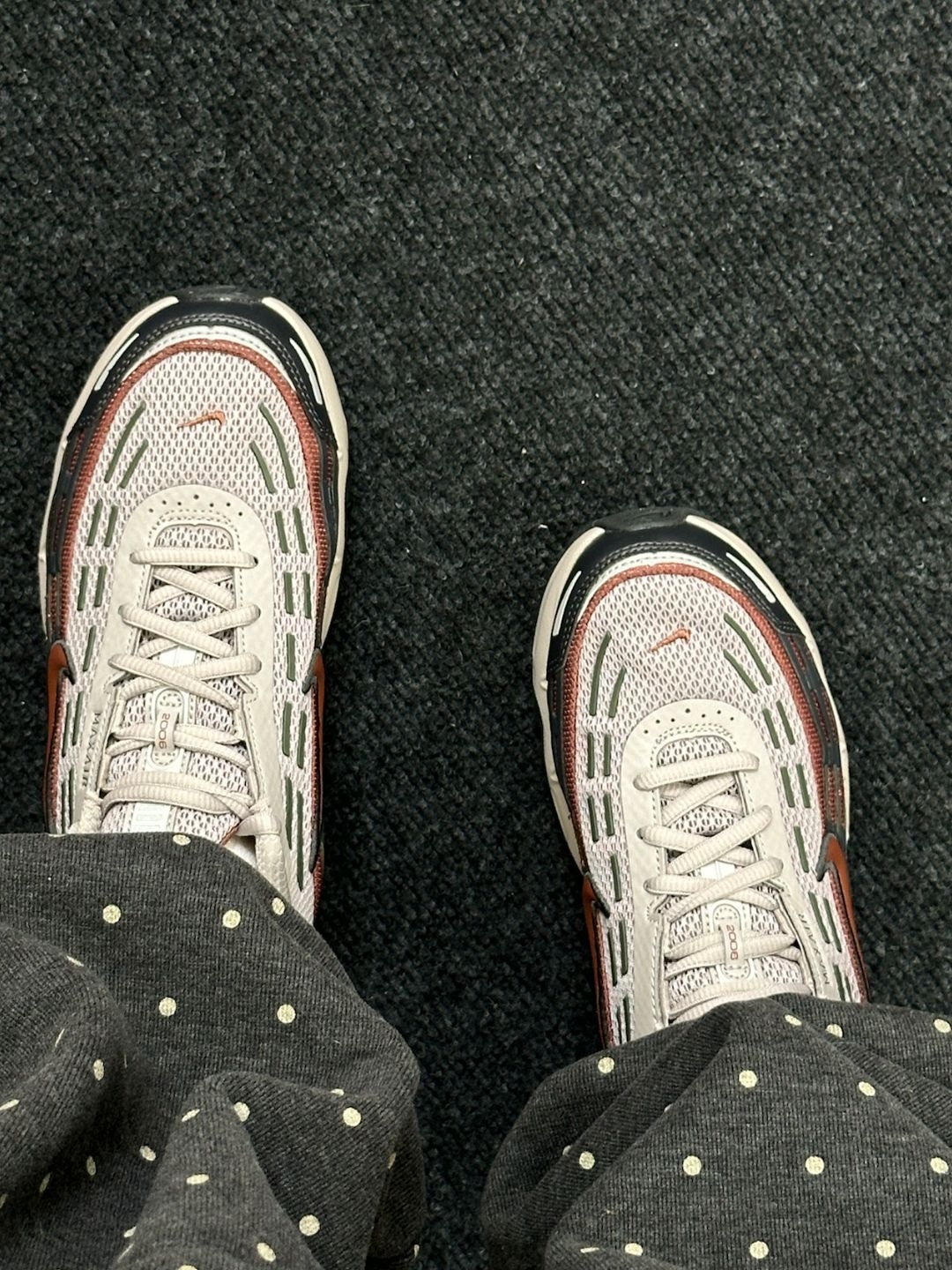 Nike这双的配色真的长在了我的审美点上。 米白、水泥灰与酒红色的组合,既有复古跑鞋的运动感,又带着一丝老钱风的克制。鞋身的网眼材质自带呼吸感,拼接的皮革手感也挺细腻的 上脚属于“显瘦型”的复古鞋,不会显得脚很大鞋底气垫设计又软又弹,还防滑 日常搭配深棕色的工装裤,就是妥妥的山系复古风;换一条黑色微喇运动裤,又能穿出利落的街头感;再换一条波点裤又很随性🫠是属于“越穿越软”的类型