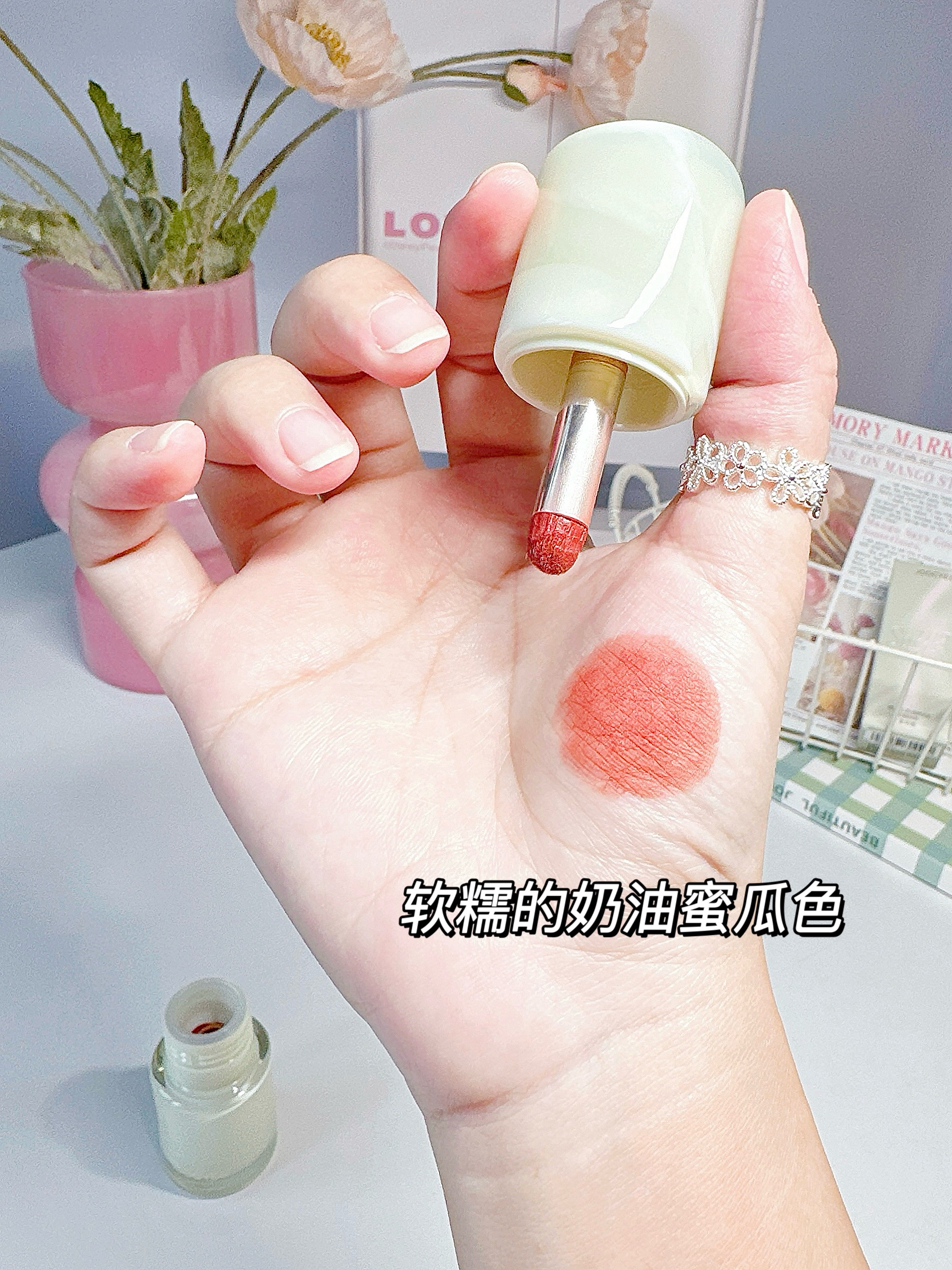 挖到一支春日宝藏单品 酵色的多用霜C33奶蜜瓜 薄荷绿壳子好春日呀~ 颜色是软糯的奶油蜜瓜色 质地细腻丝滑,上唇抹两下就化开 可以很好地覆盖唇纹~ 不是油润感,是那种柔雾的丝绒感 惊喜的是它还能全脸用! 唇上当口红,用指腹点涂就是温柔唇妆 用小粉扑蘸取拍在脸颊就是元气腮红啦 和唇妆蛮搭的,整个妆容色调统一喔 小巧一支放包里随时补妆 春日奶油色系对黄皮挺友好 我素颜涂它也提气色呢!