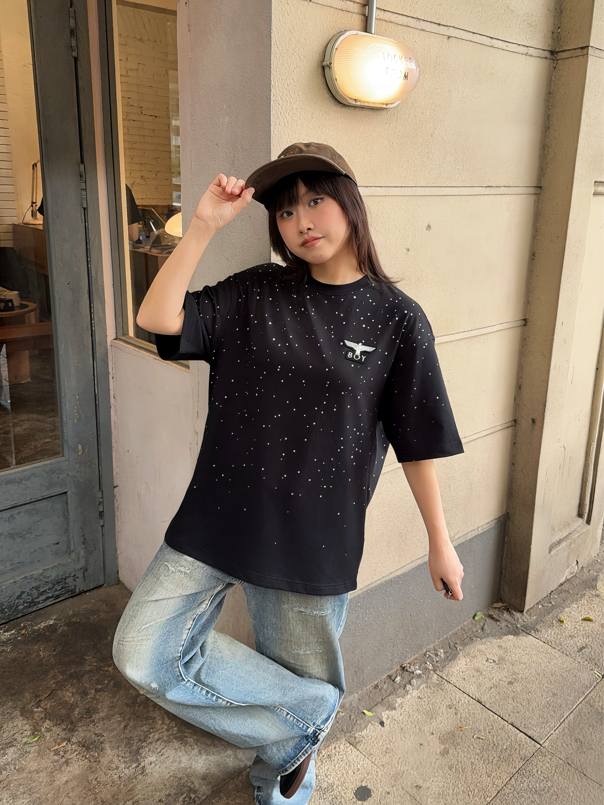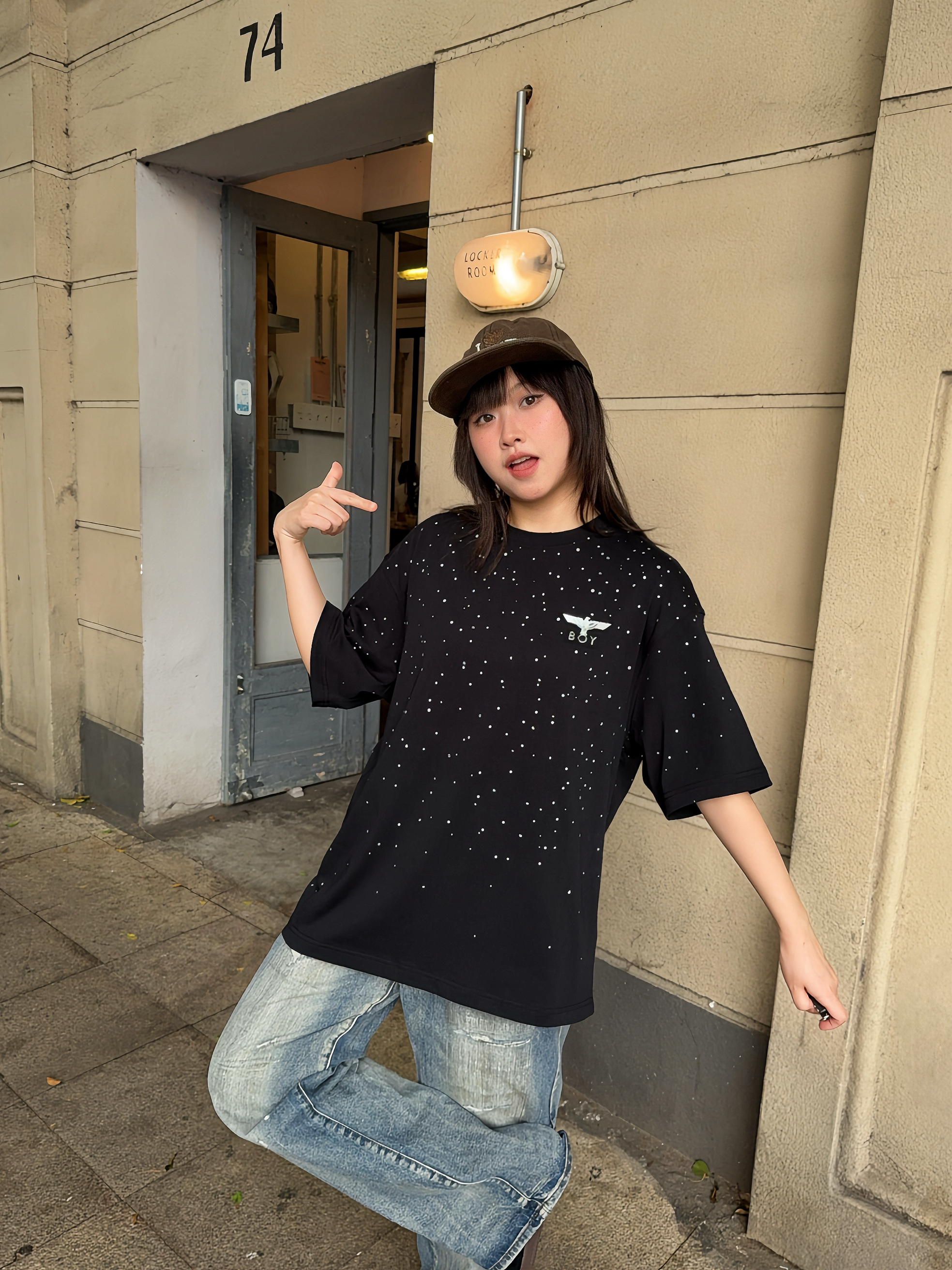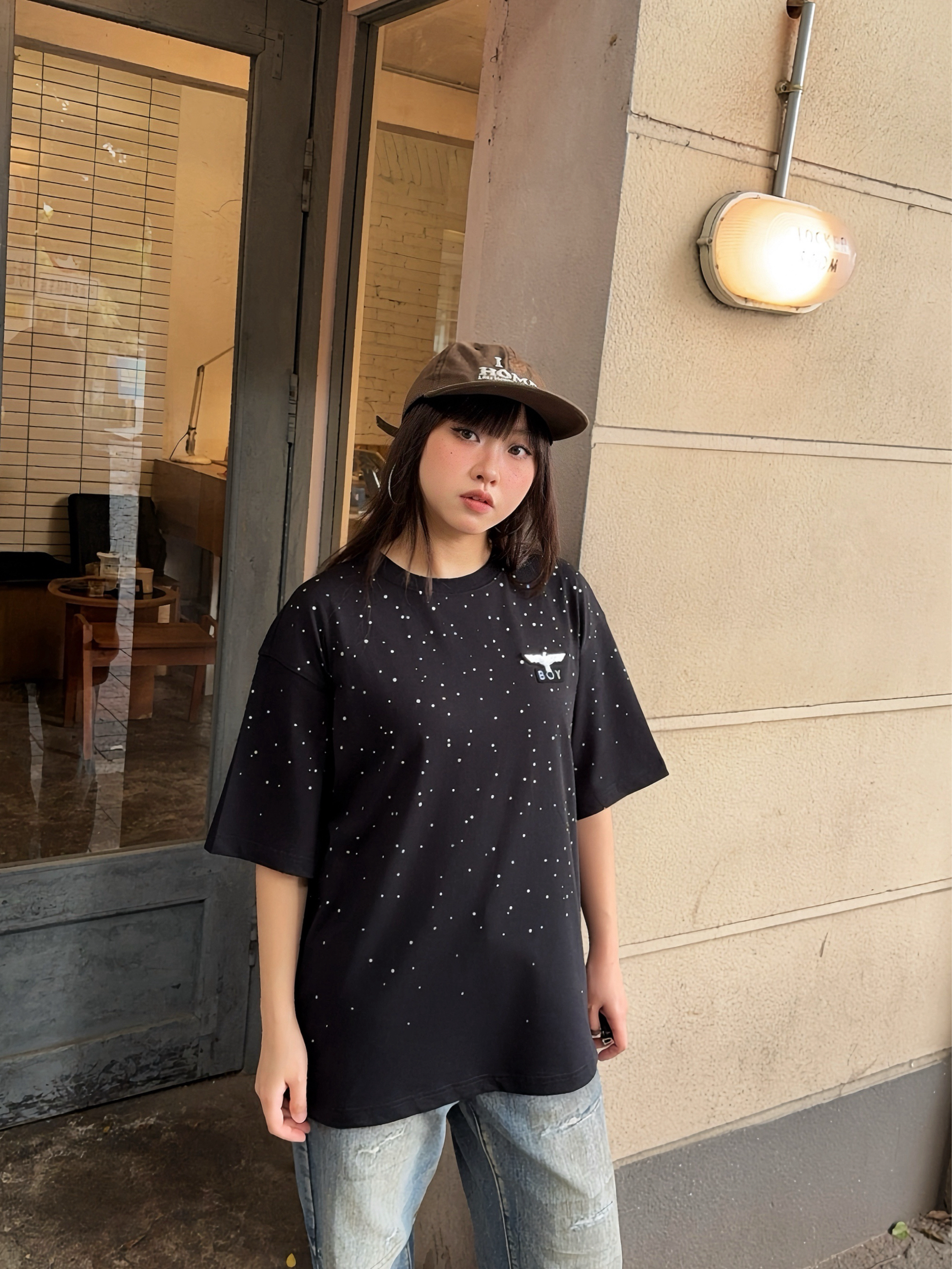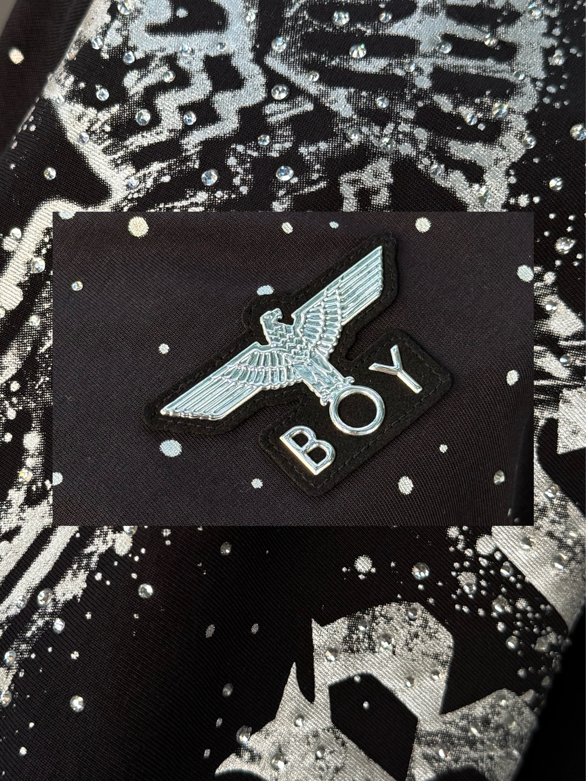 今日份潮酷girl驾到,ootd高街一下~ Boy London 满天星短袖,这件前后的🦅老鹰LOGO巨闪巨有潮酷感✨ T恤的版型也比较正,上身很有街头范~日常搭配牛仔裤就能出门啦🆒
