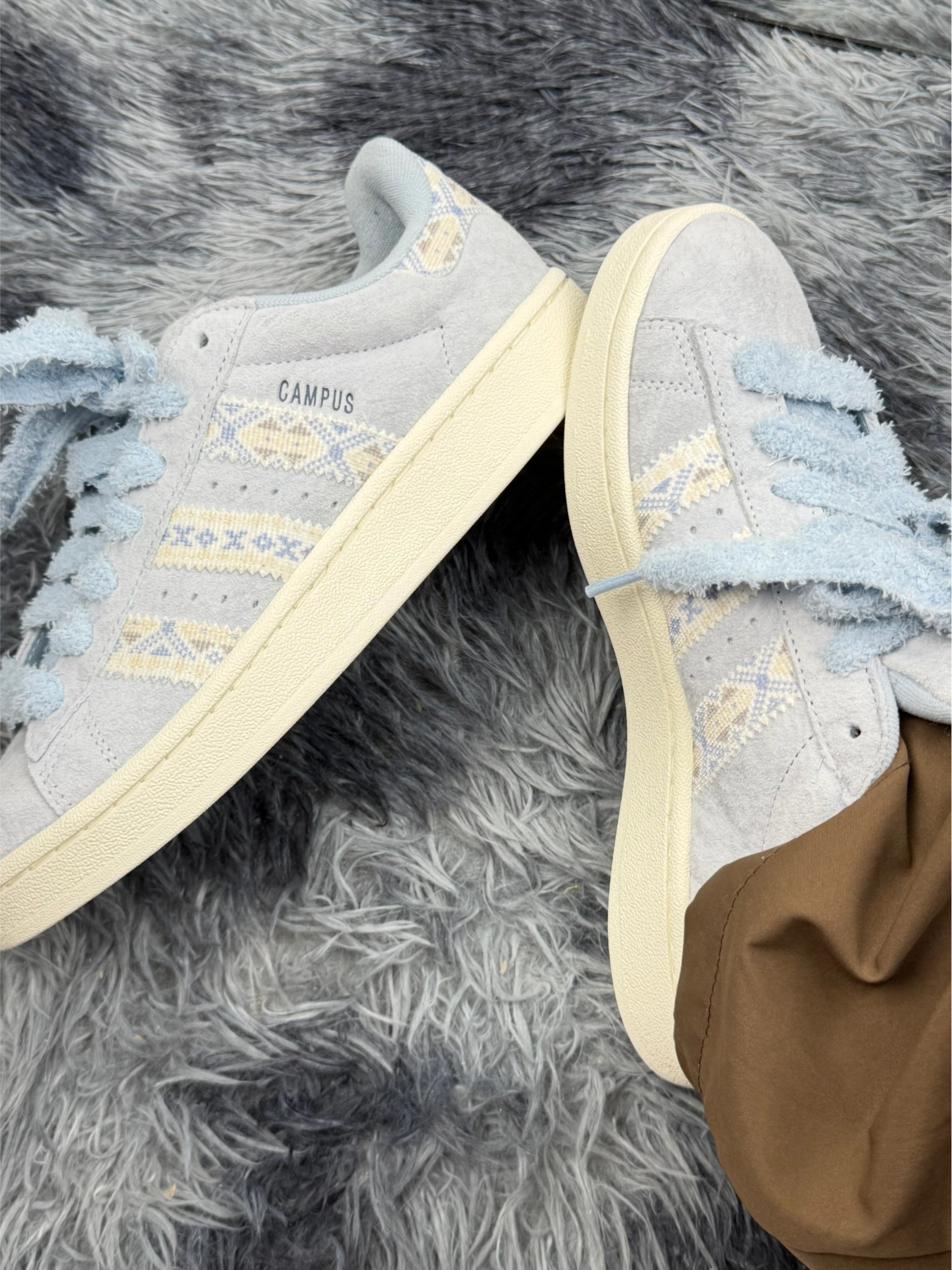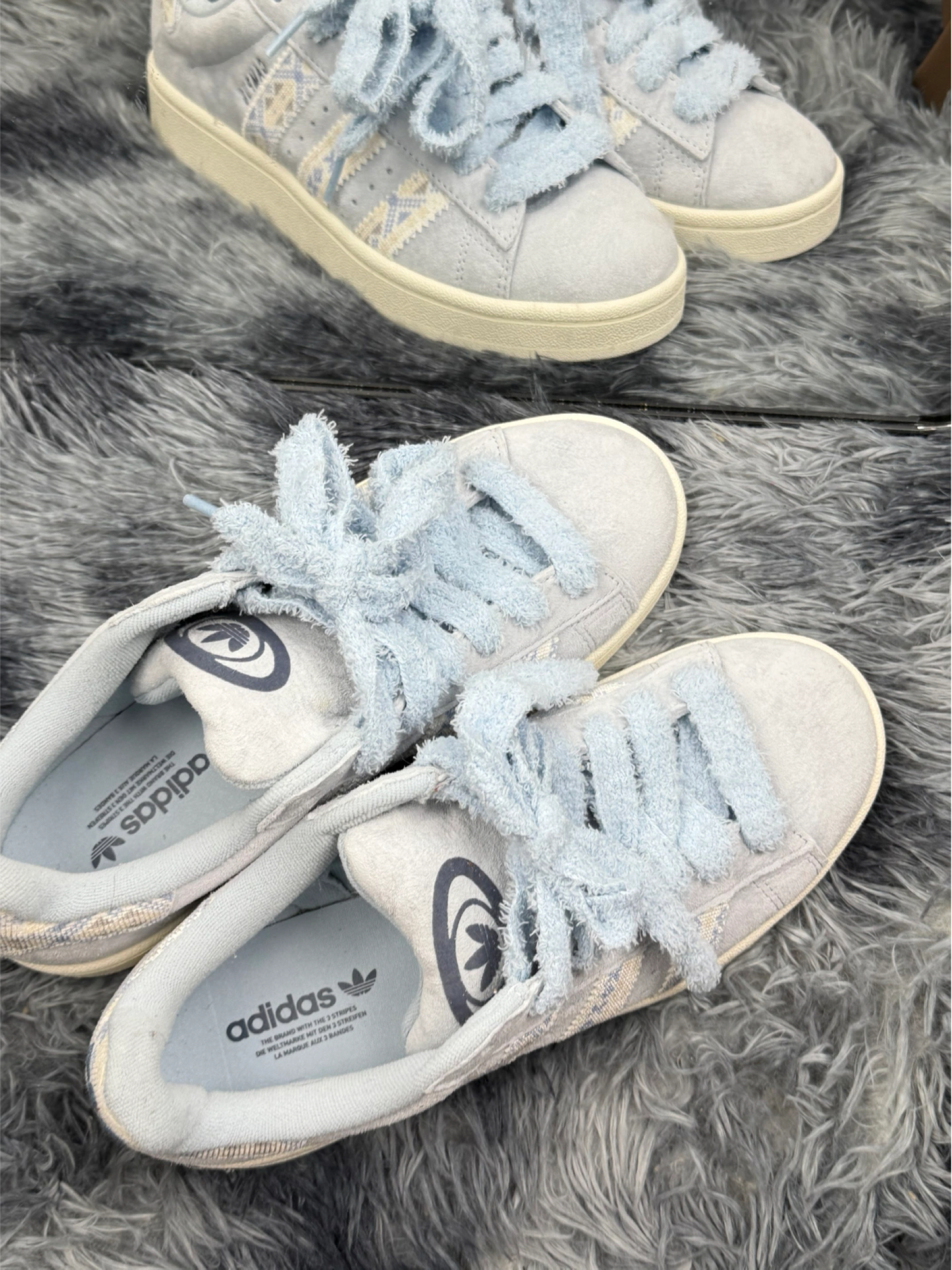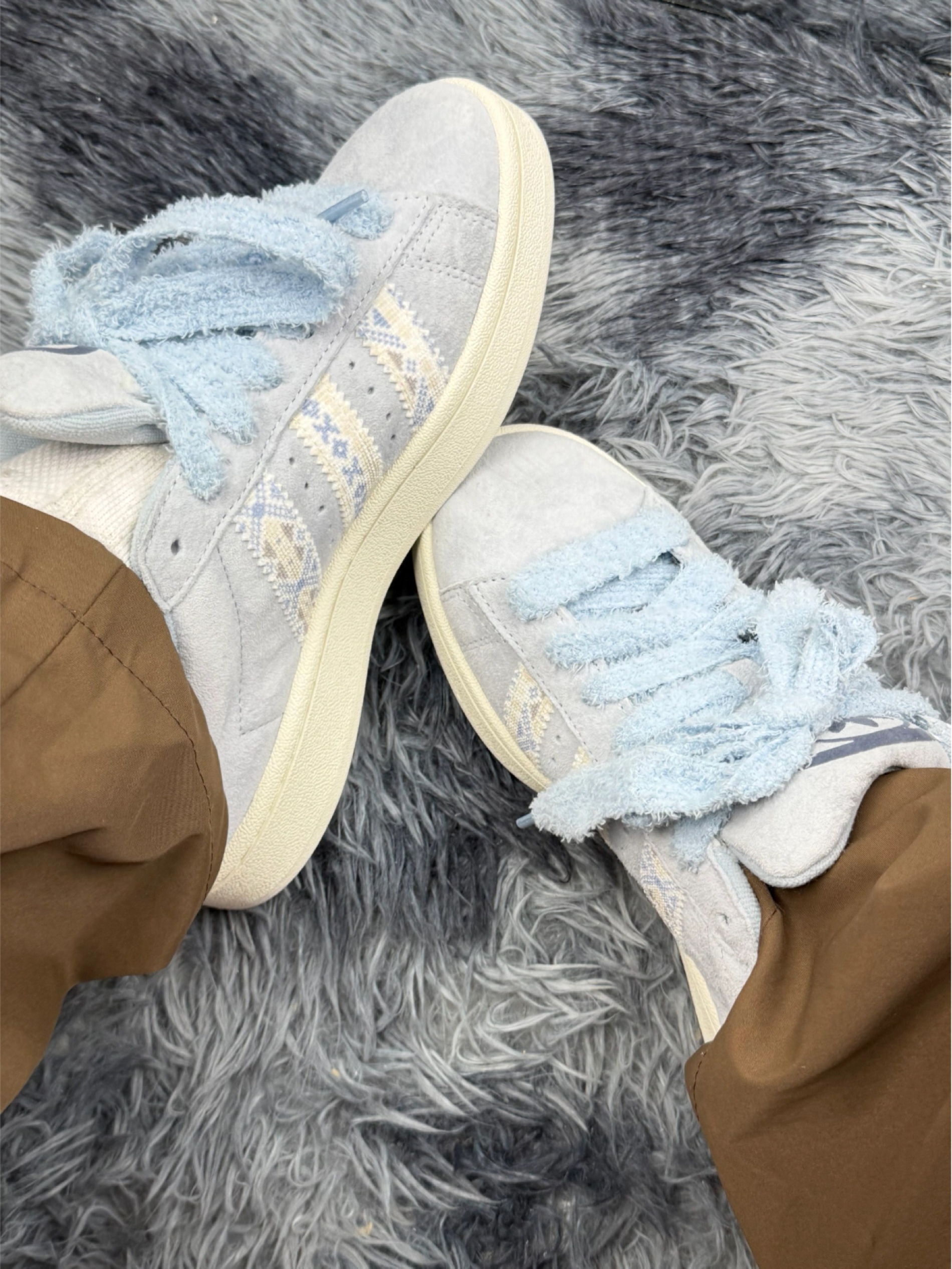 刚拿到手就被这双Campus的浅蓝格纹戳中了,软乎乎的鞋带摸着像撸猫,上脚第一感觉是轻,走路没什么负担。 但穿了三天就发现,鞋头的麂皮太娇贵,蹭到路边的绿化带就留了印子,用湿巾擦不掉 不过不得不说,鞋型是真的百搭,配运动裤和阔腿裤都不违和,走路久了也没磨脚。 缺点是真的有,但架不住它颜值对我胃口,适合和我一样,愿意为了好看稍微妥协一下的人