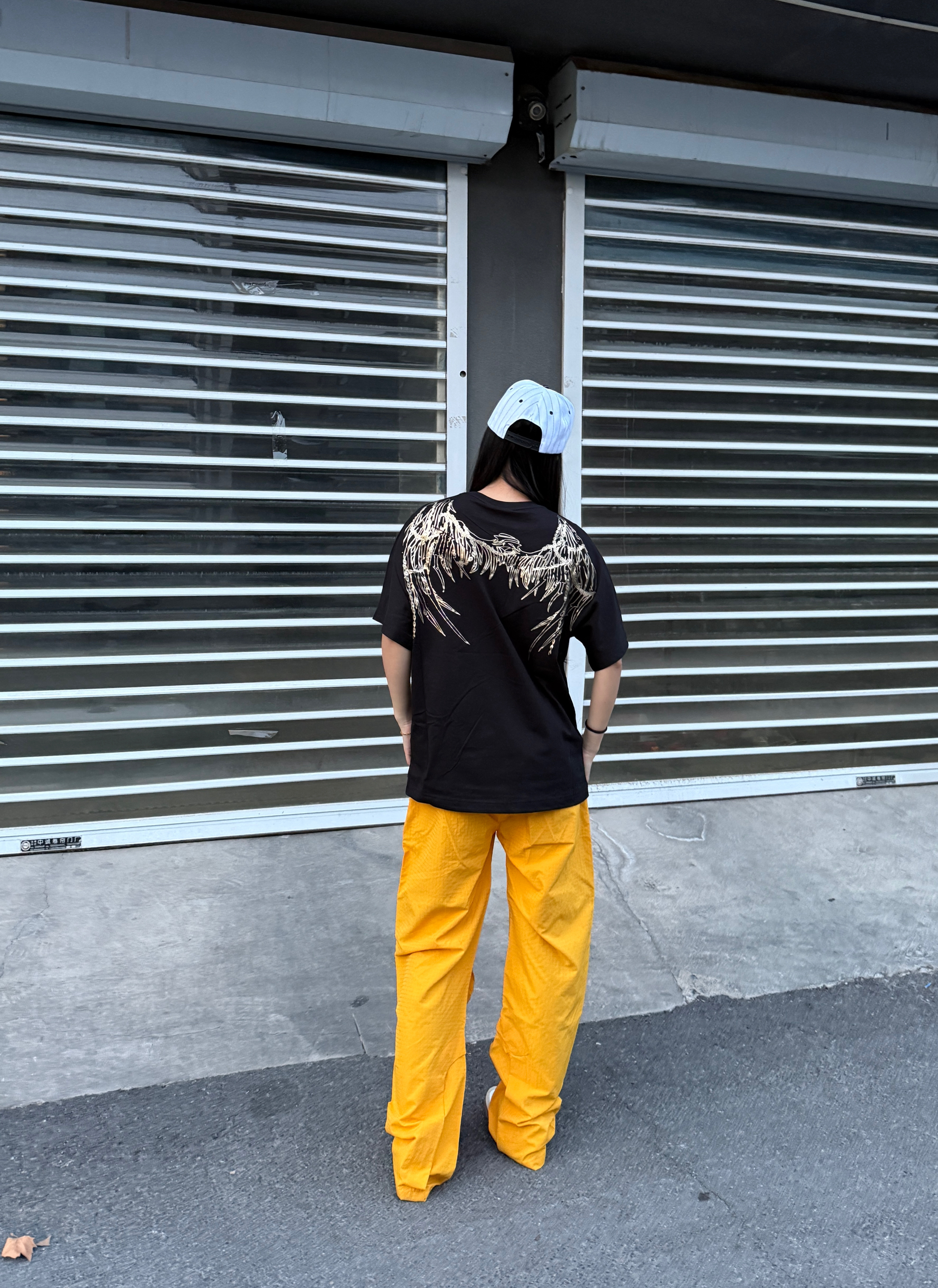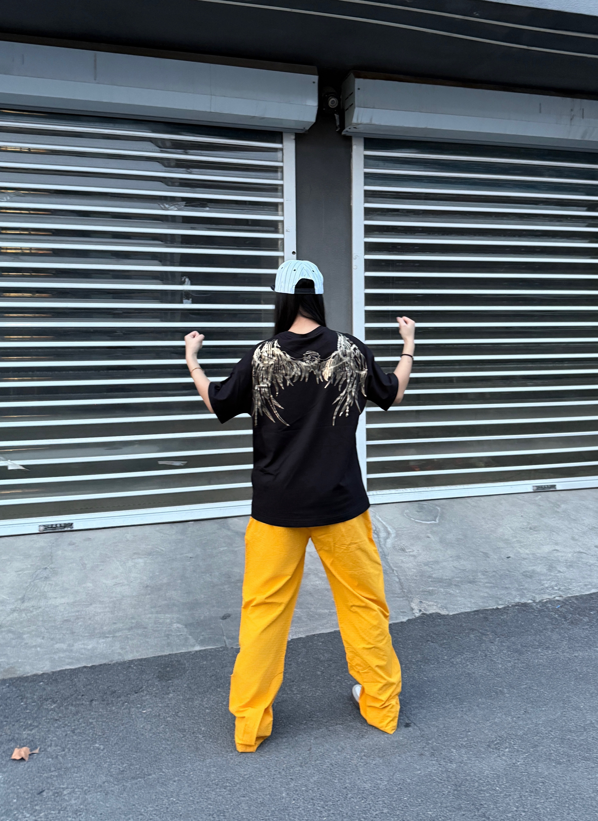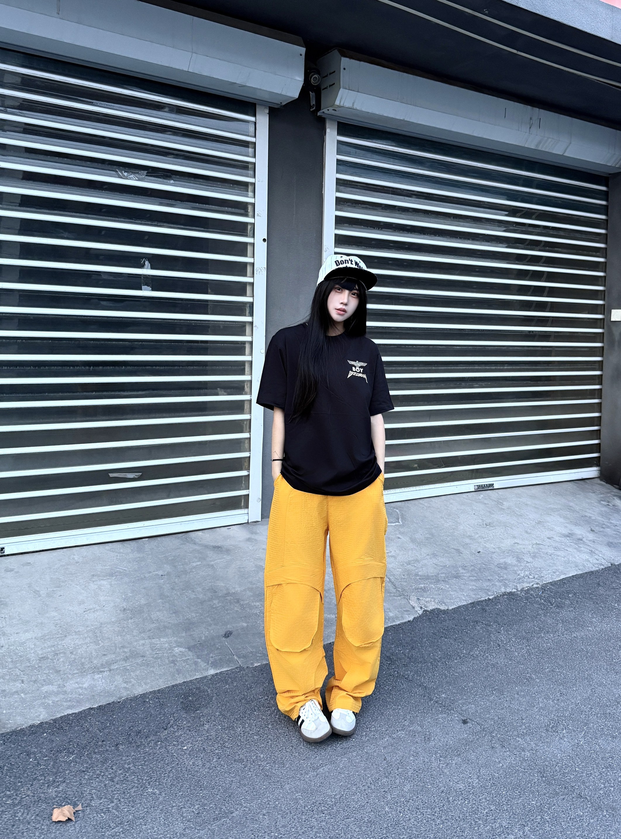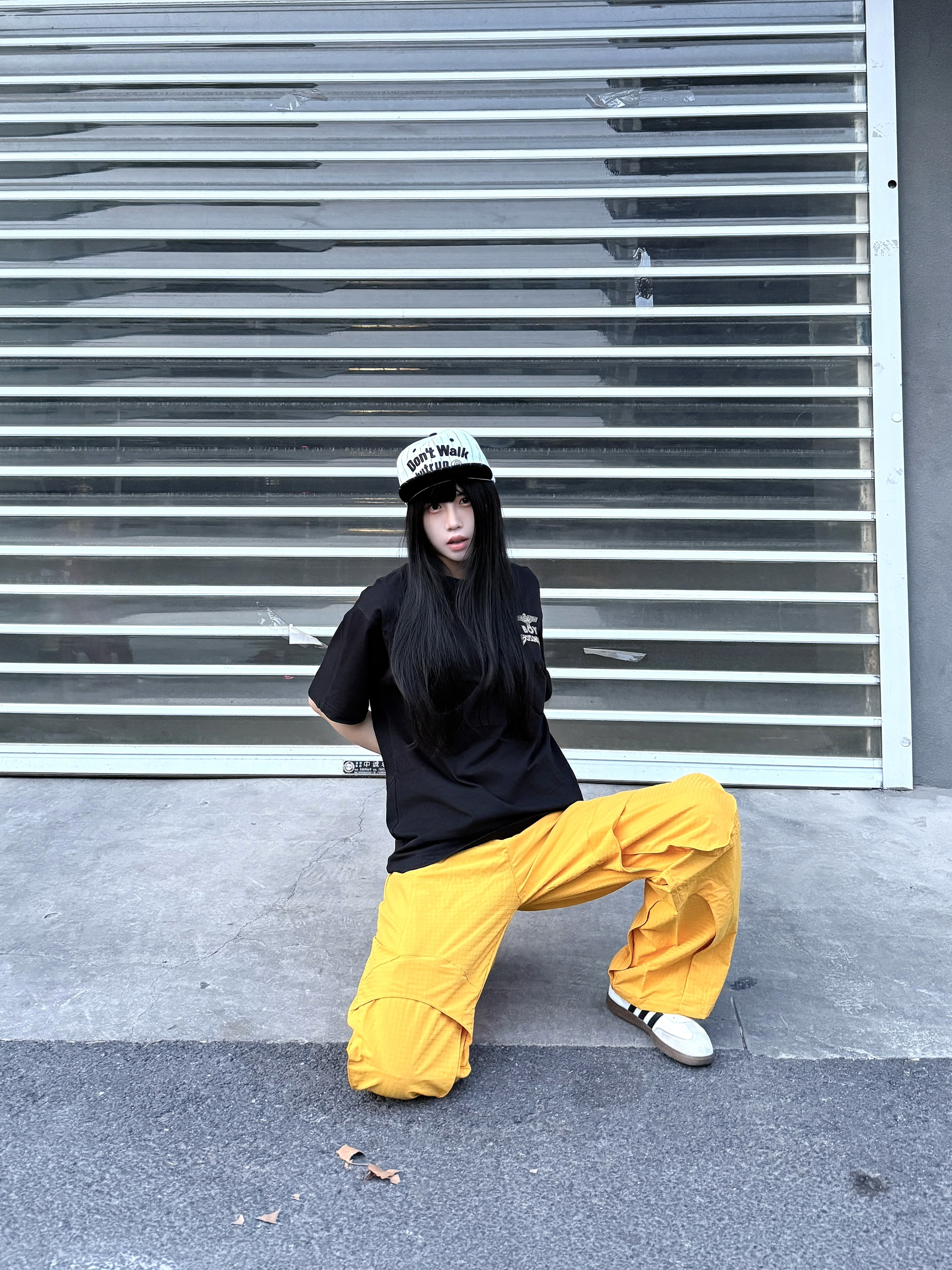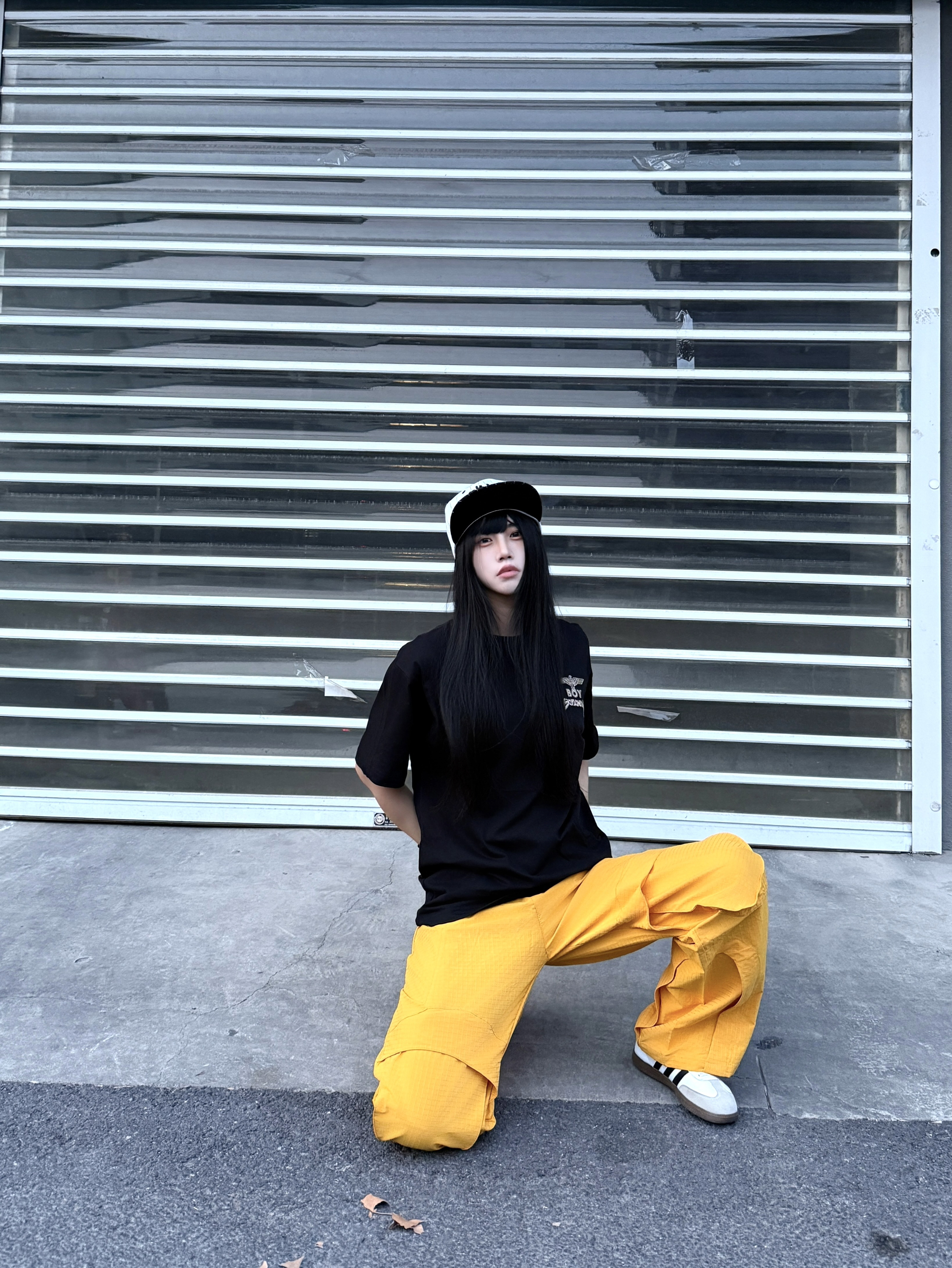 宽松黑T+亮黄工装裤街头感直接拉满 黑色老鹰🦅logo刺绣高级感满满 亮黄裤子随便搭双小白鞋就很有少年感 不用费心搭配出门直接炸街 日常出街、逛潮店都超合适 慵懒又不失个性甜酷女孩直接抄作业