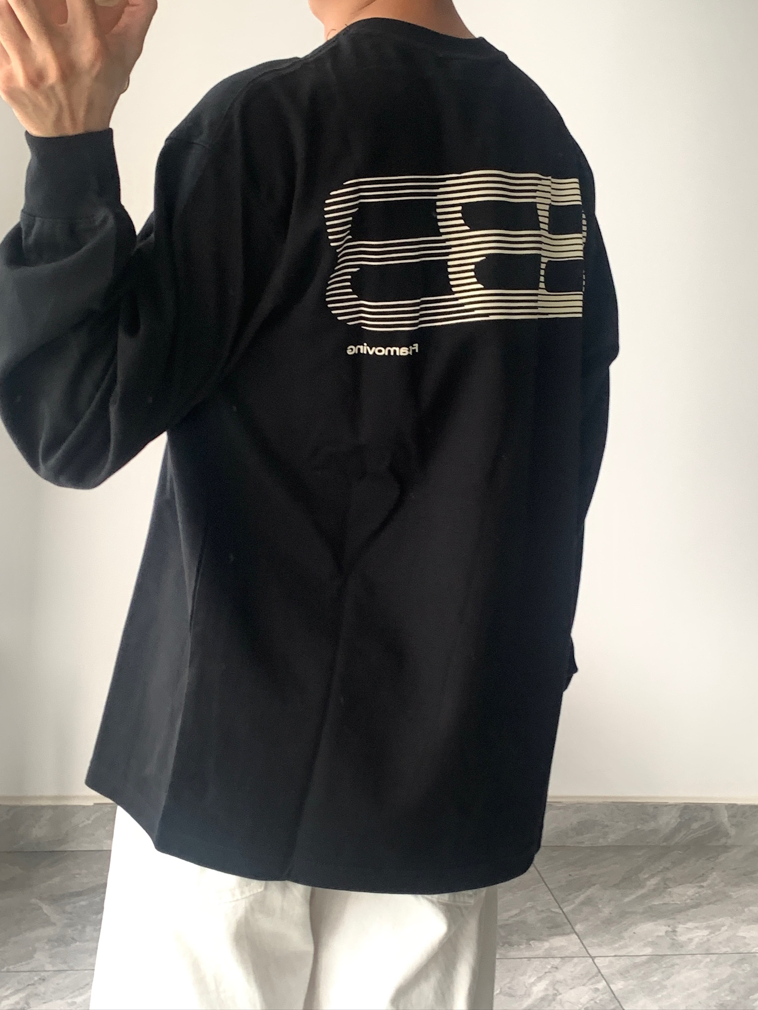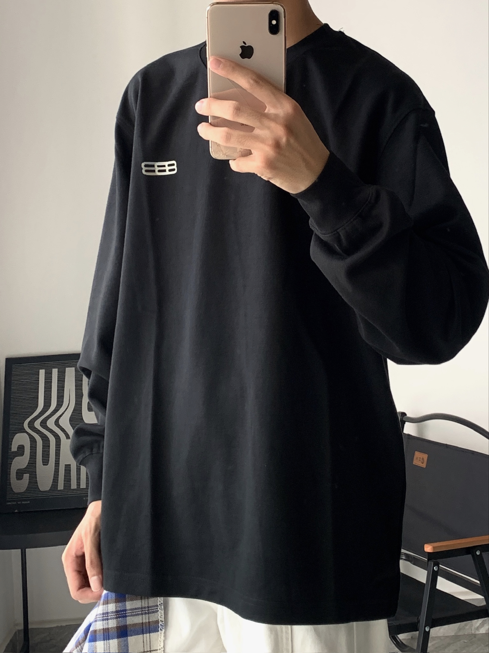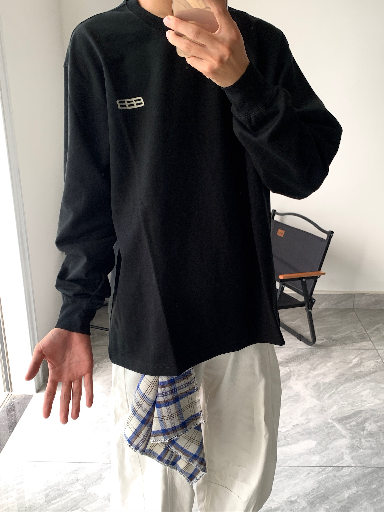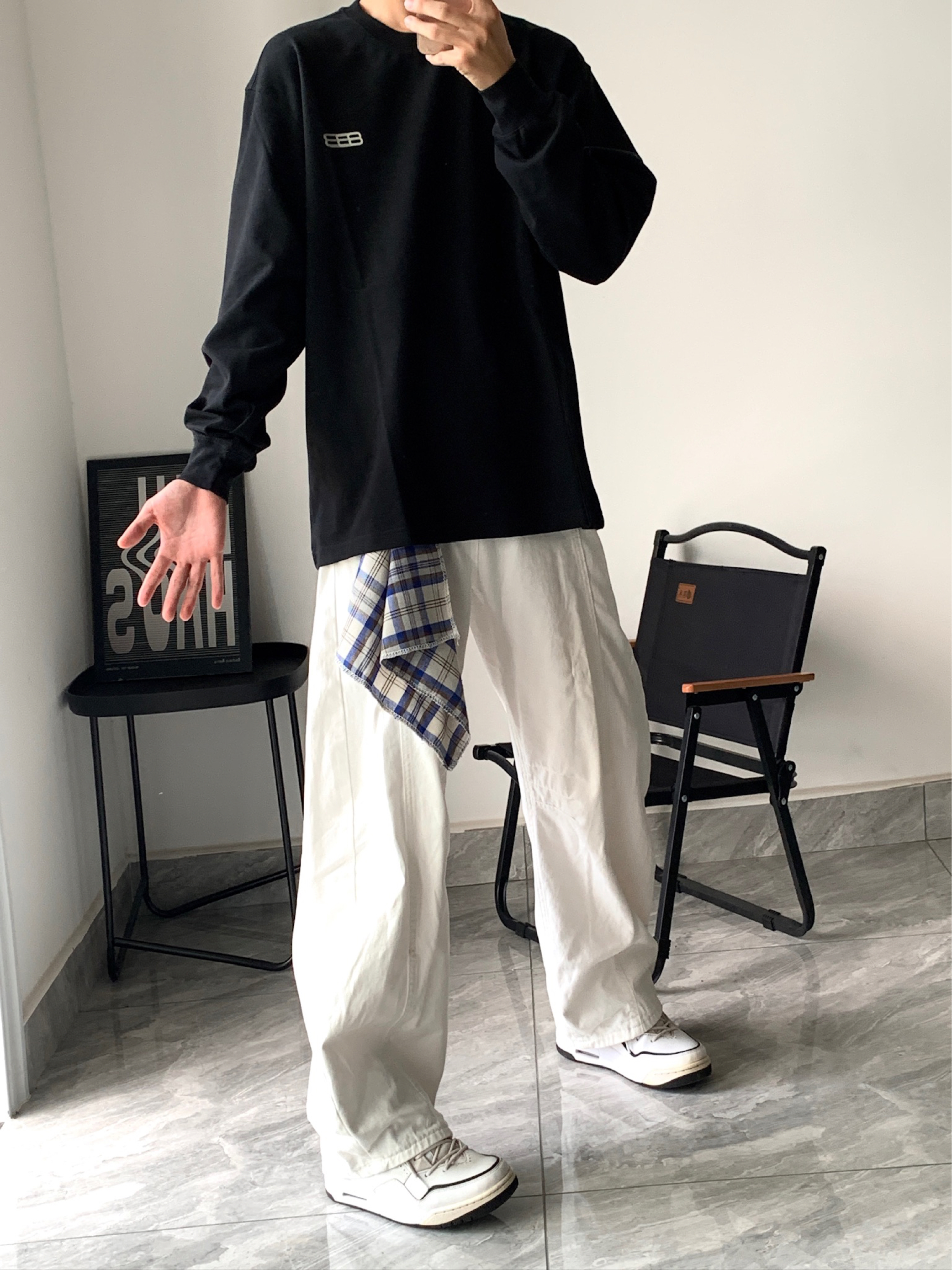 这件黑长袖我真的爱惨了😭 摸起来是那种偏厚实的棉,不会软塌塌没型,也不会透。领口做了加固,穿久了也不会松垮变形。我喜欢把下摆塞一点进裤子里,显高又利落,配个格子方巾当配饰,氛围感直接拉满,出门被要链接好几次了