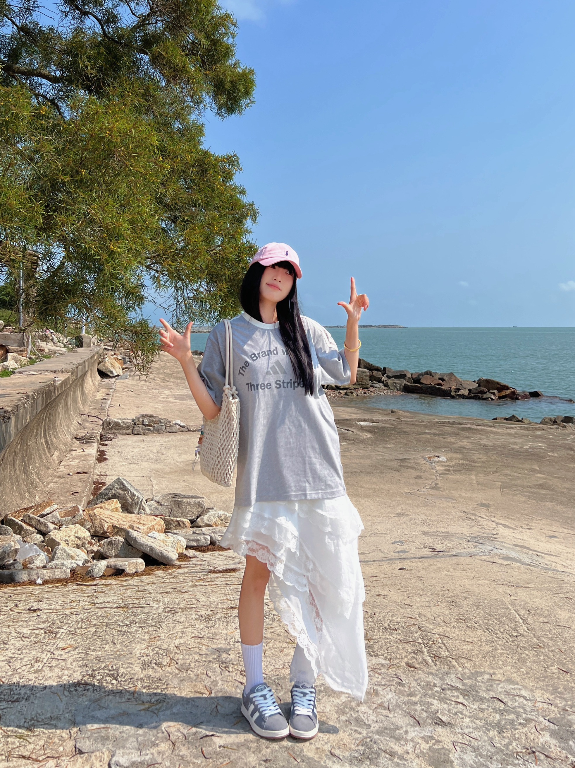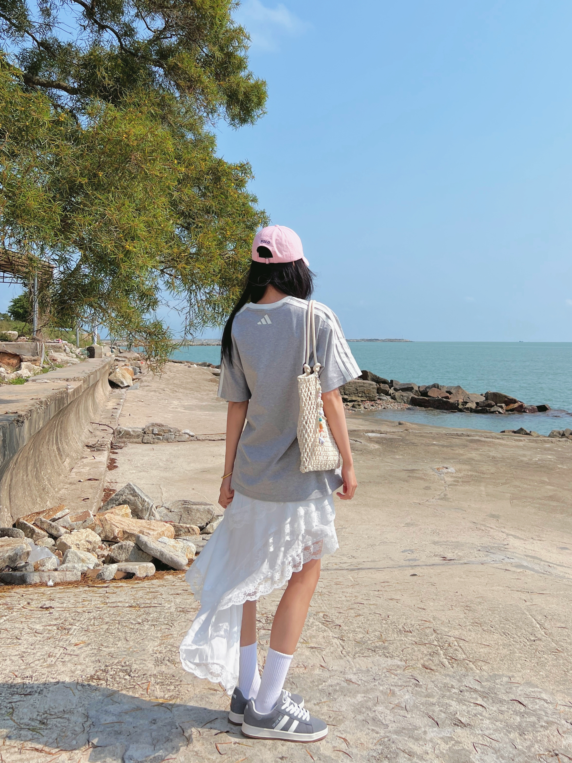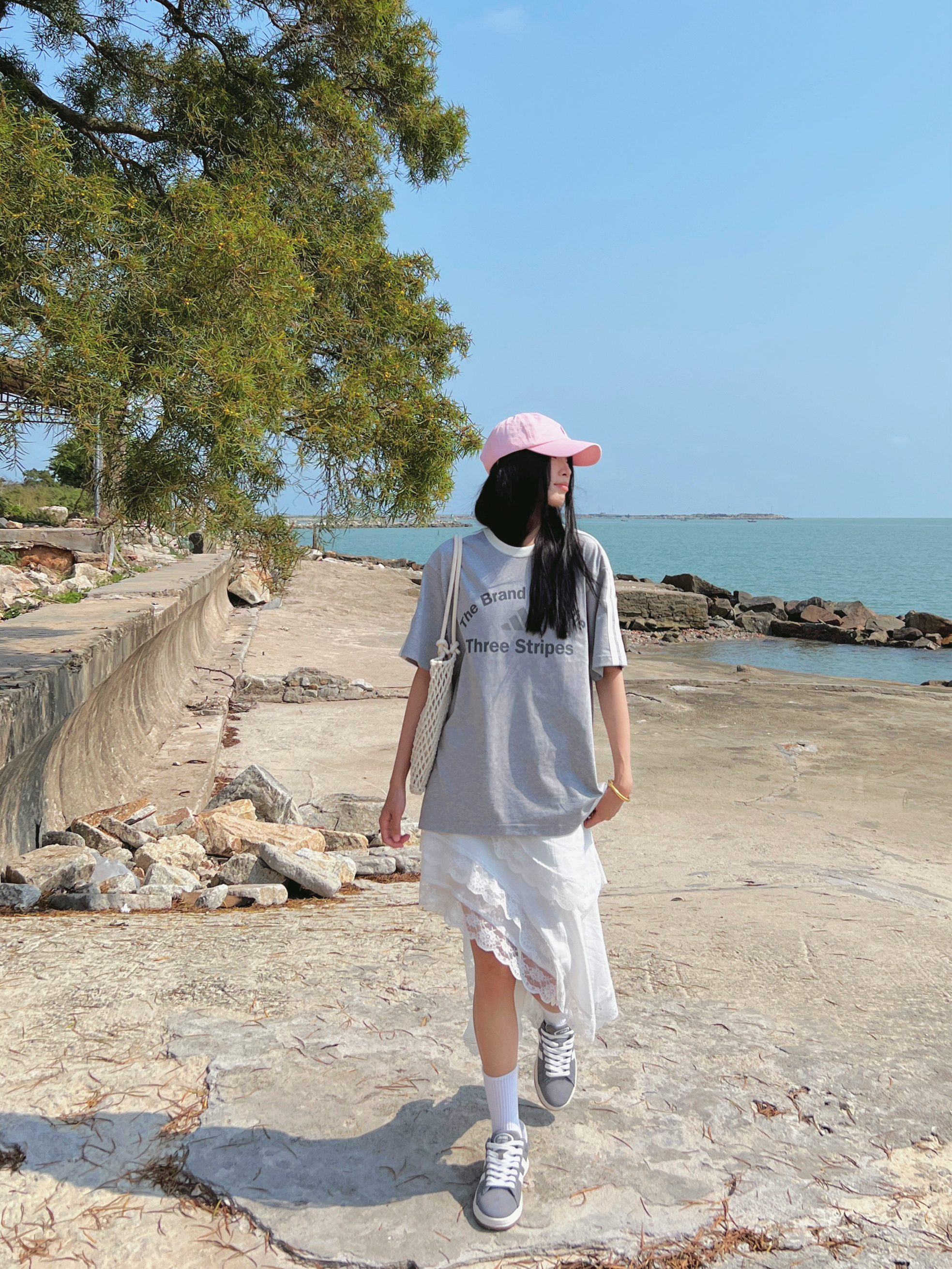 春季海边穿搭分享 今天穿阿迪灰色t搭配蛋糕裙 鞋子选择休闲板鞋 灰色系就挺休闲的 搭配裙子也挺好看 日常通勤搭配休闲裤也ok 是很实穿的单品了~