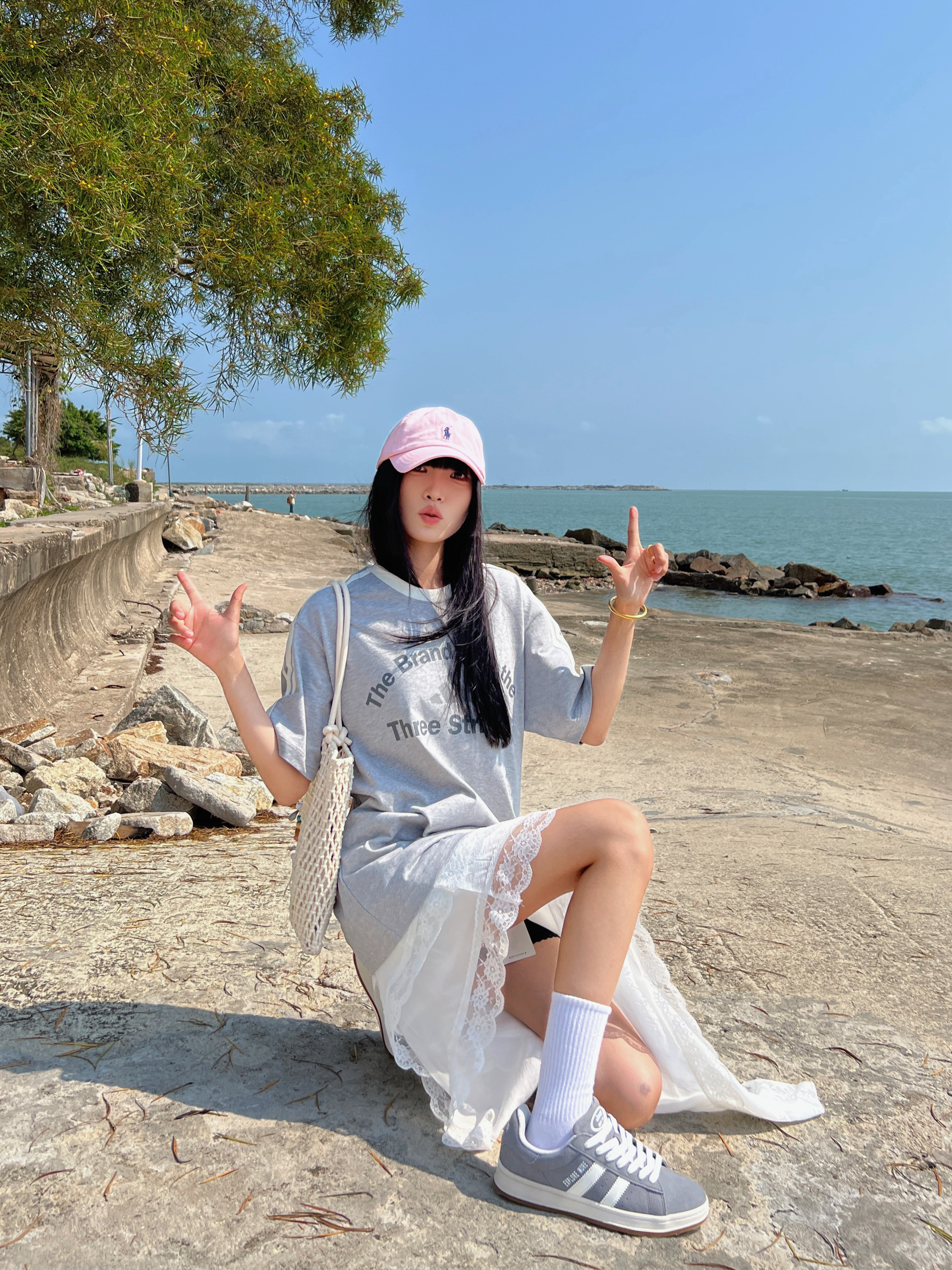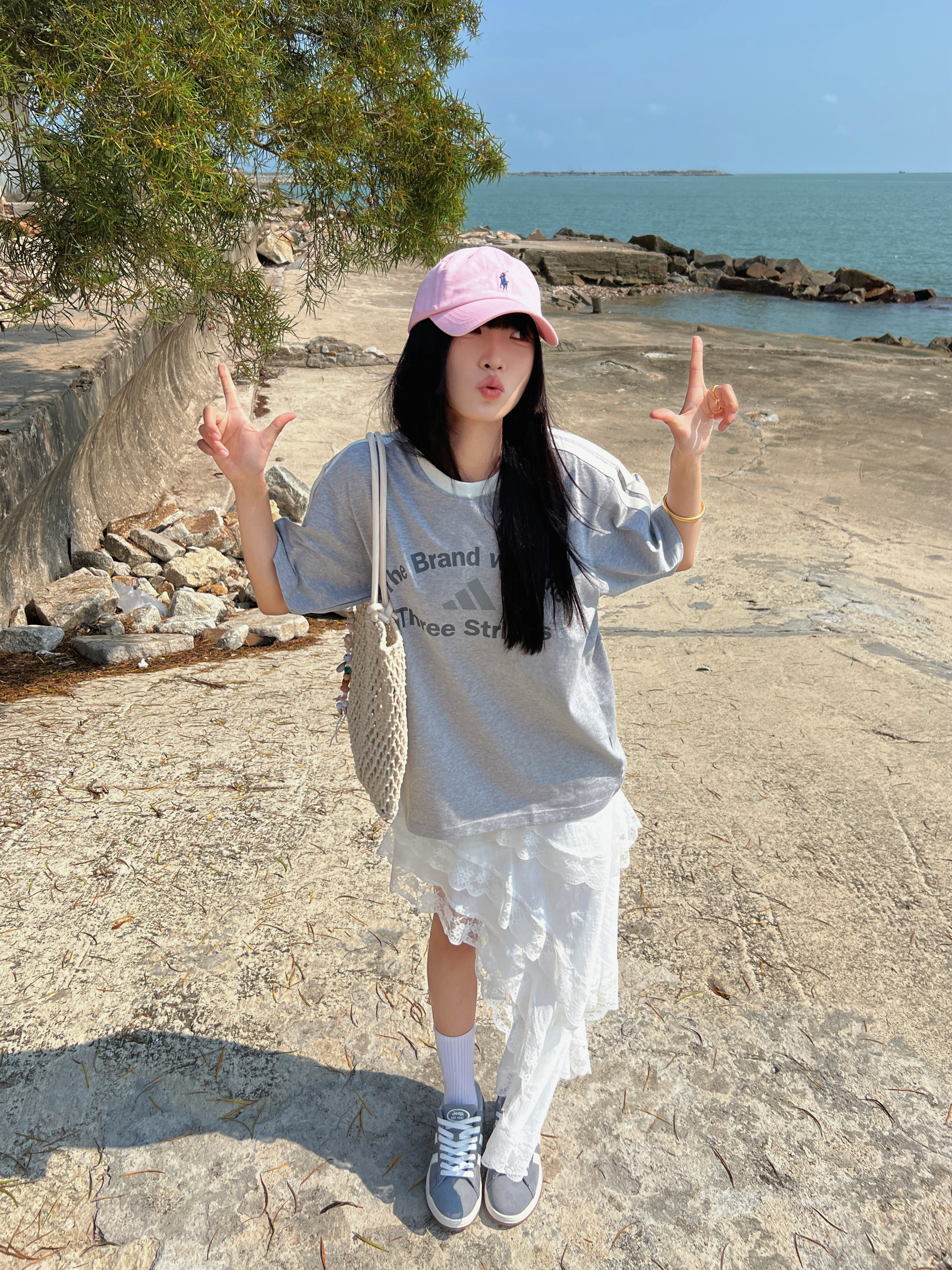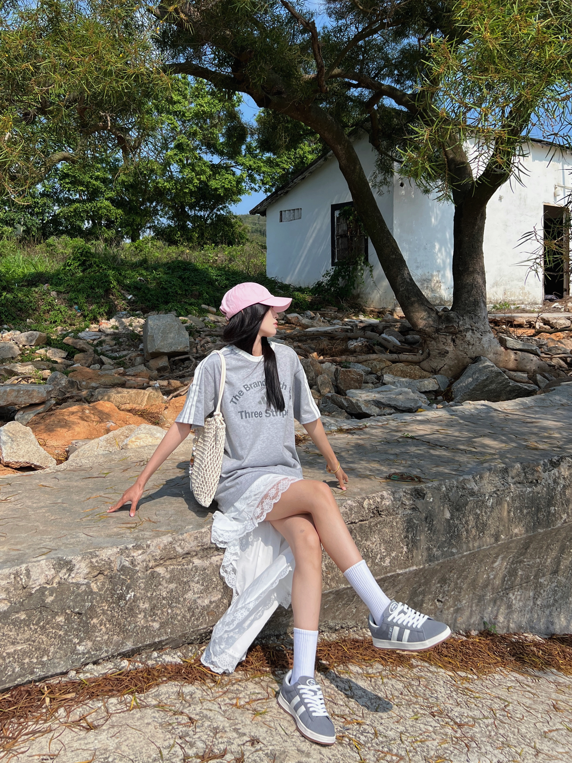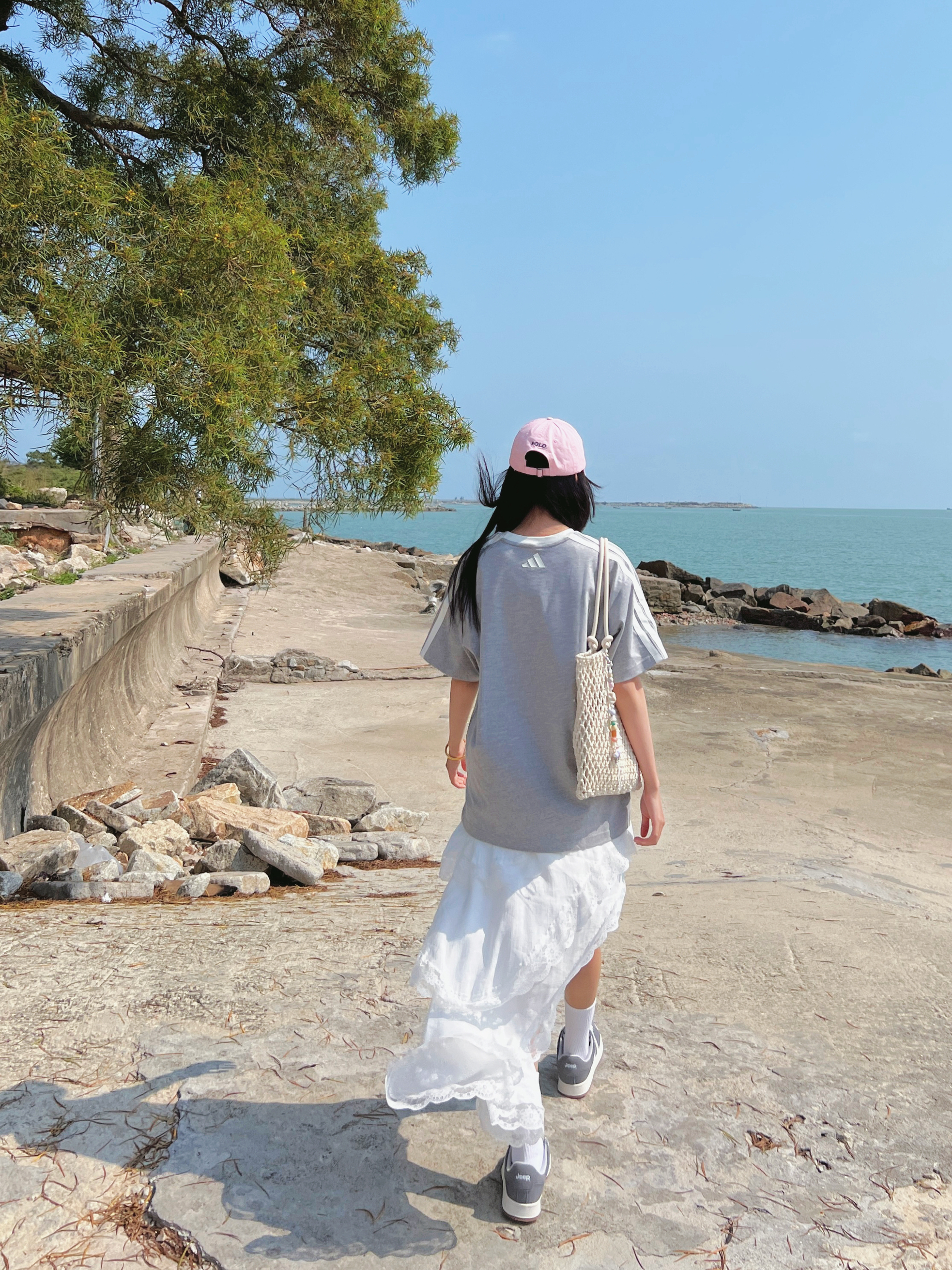 春季海边穿搭分享 今天穿阿迪灰色t搭配蛋糕裙 鞋子选择休闲板鞋 灰色系就挺休闲的 搭配裙子也挺好看 日常通勤搭配休闲裤也ok 是很实穿的单品了~