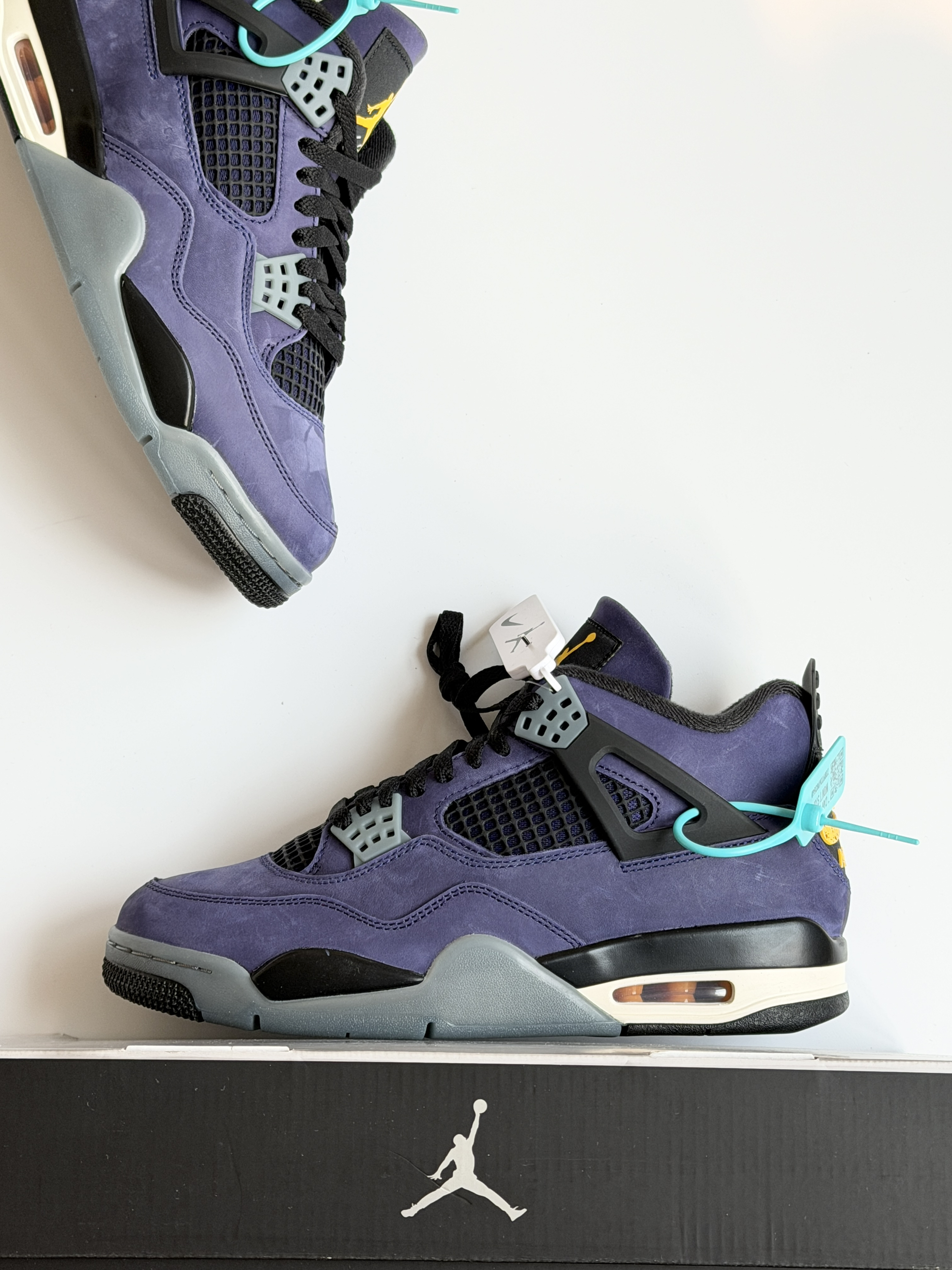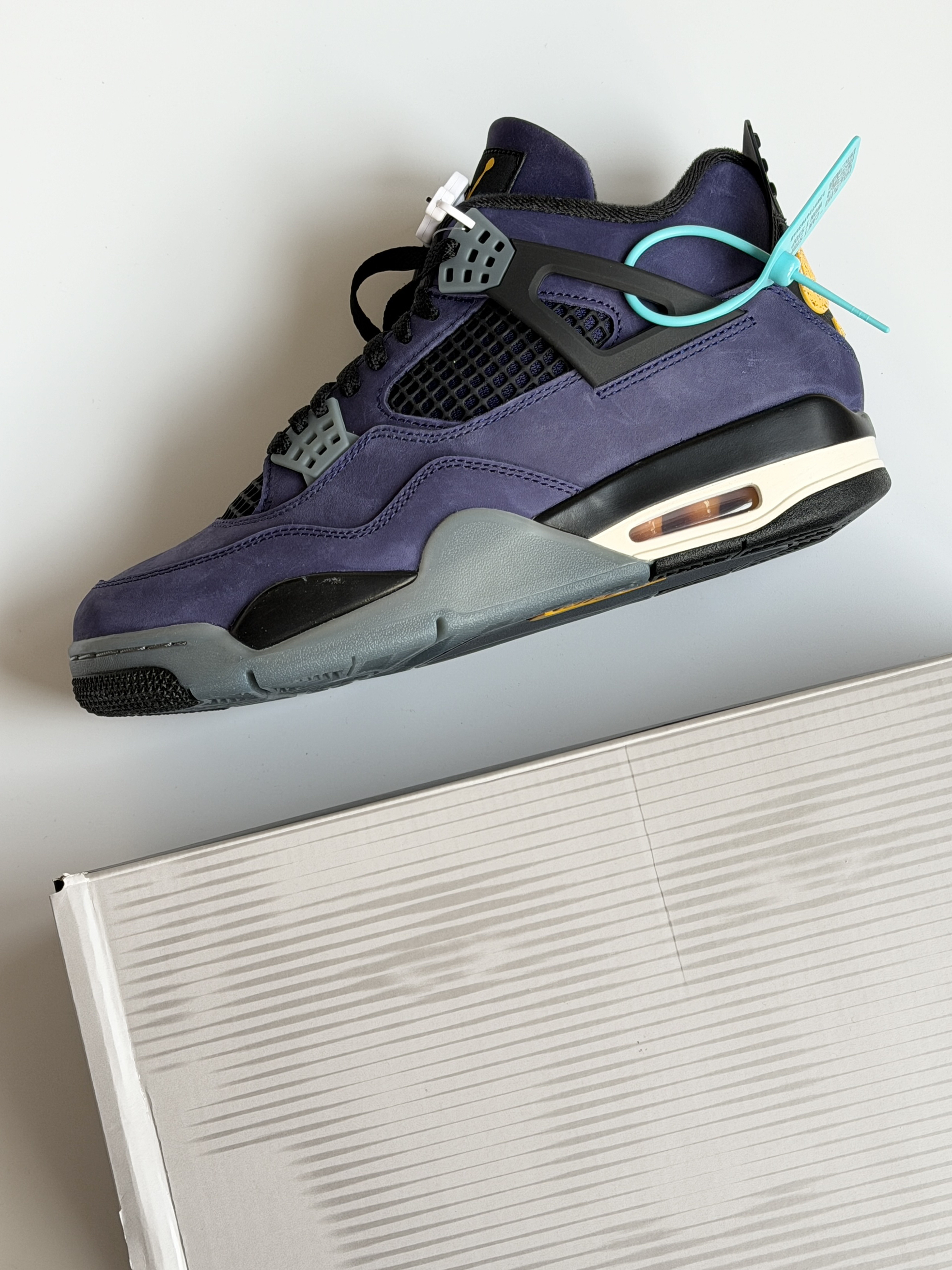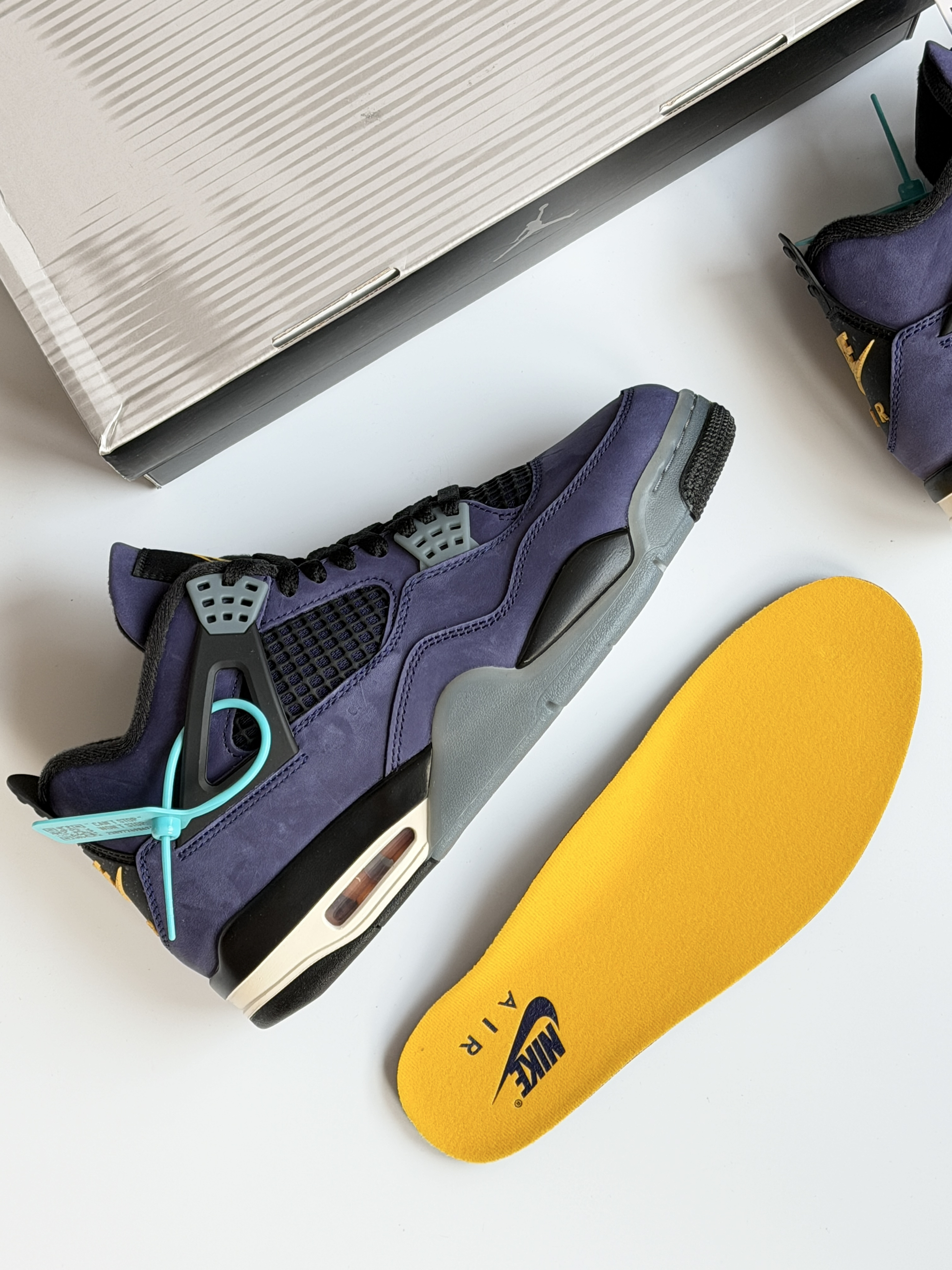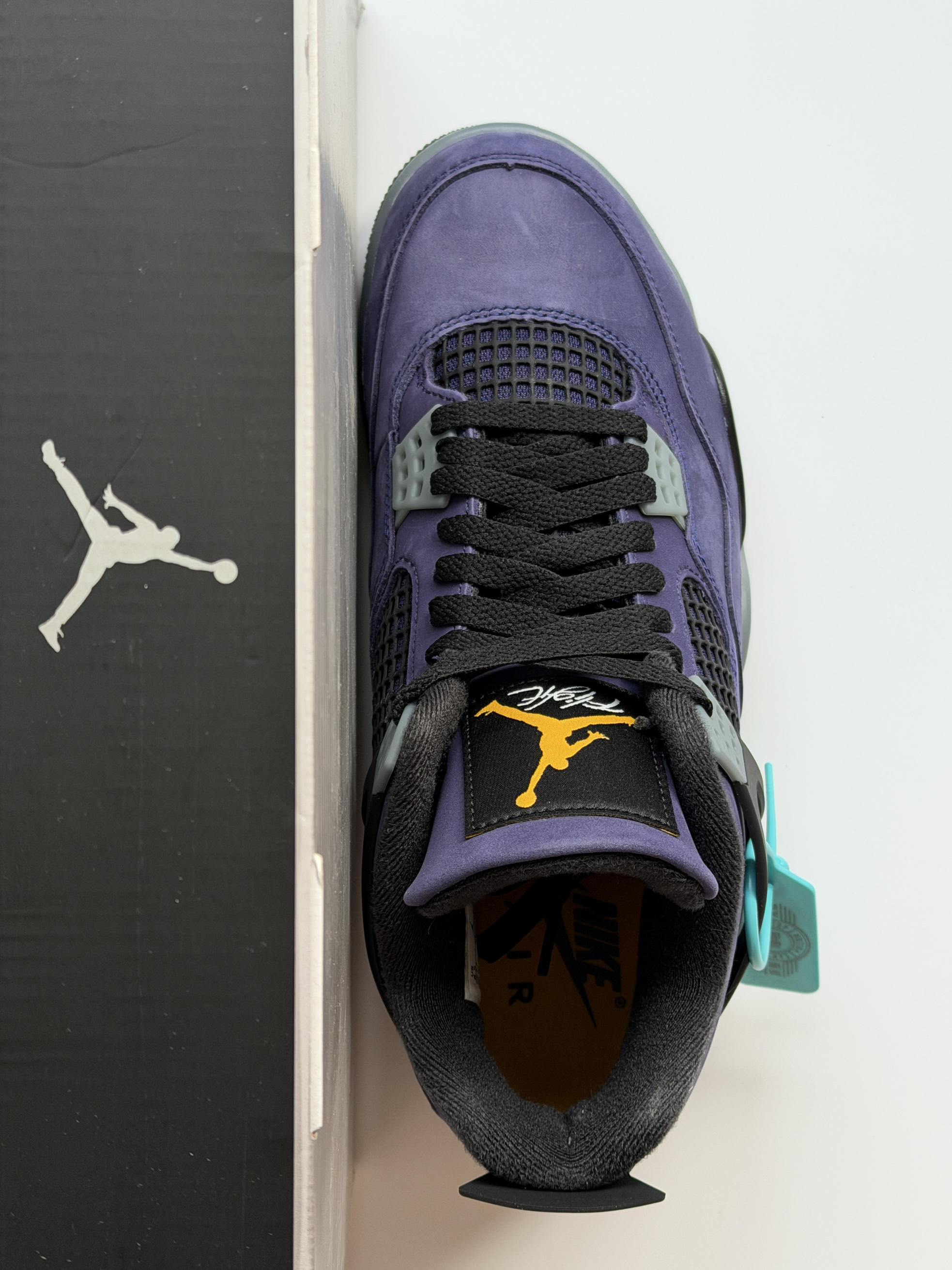 当时印象比较深刻的是那双初号机aj4!全鞋身翻毛皮质感真的拉满!而这双全鞋身牛巴革材质整体更佳优秀!特别是鞋后跟的喷墨黄老nike更有味道!