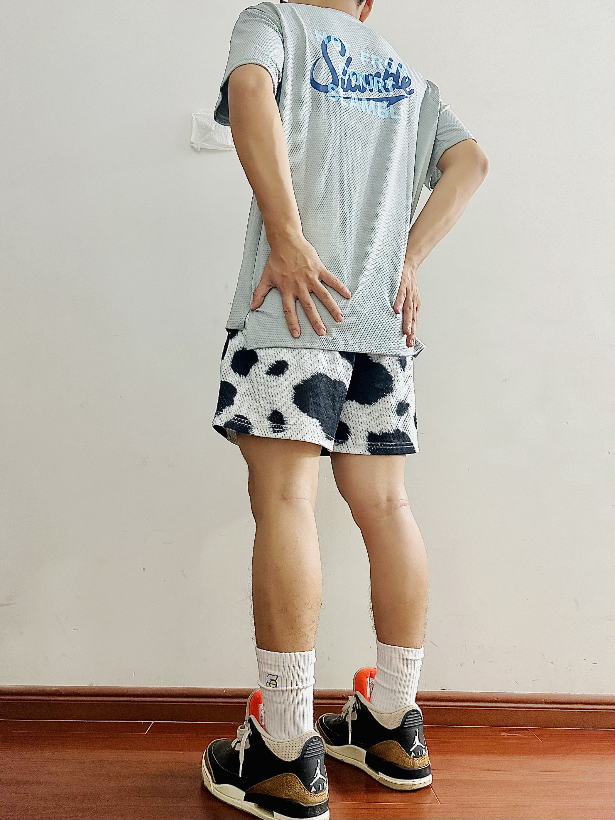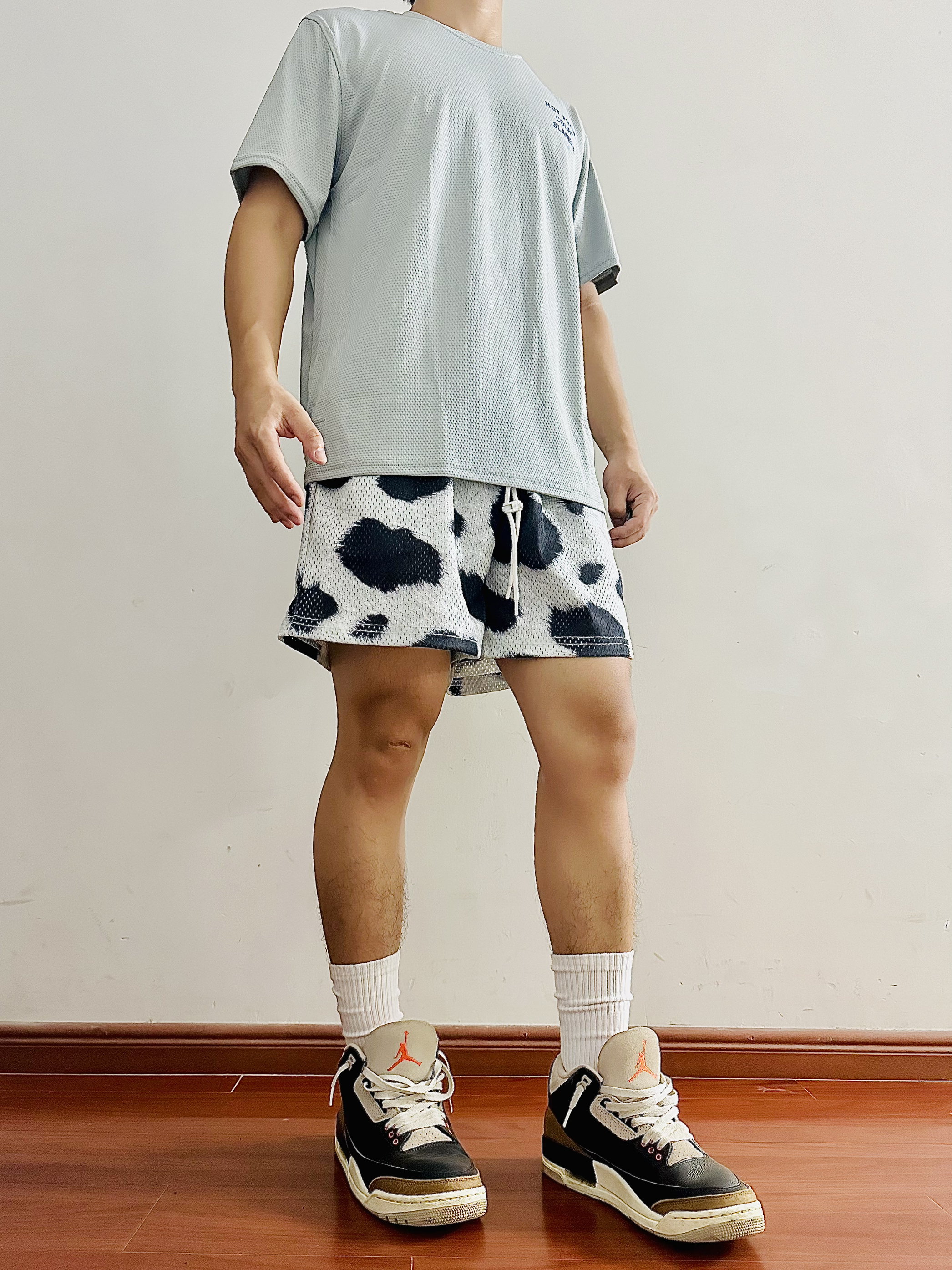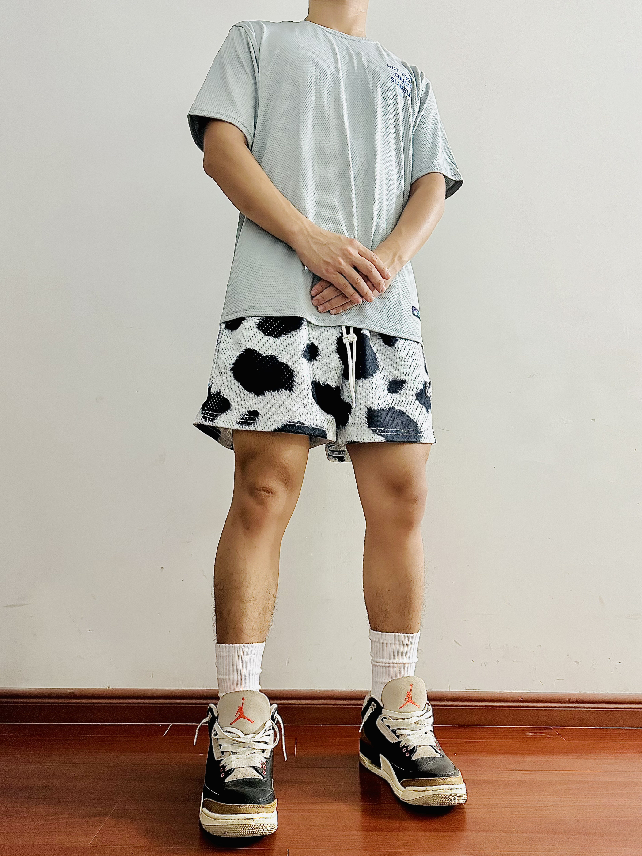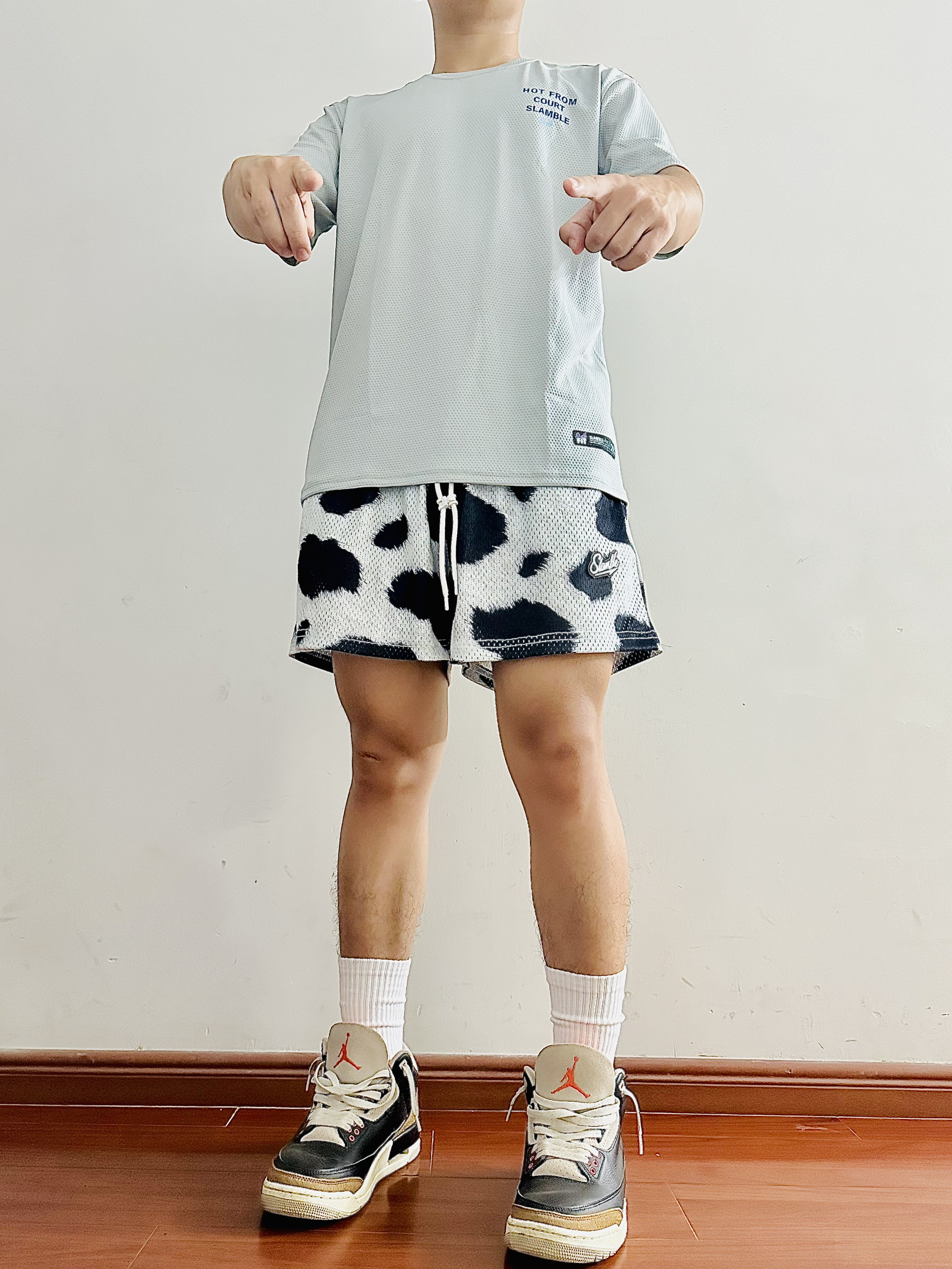 灰色投篮服➕奶牛短裤➕AJ3篮球鞋 👕: slamble 投篮服短袖 银灰的配色高级低调 加上背后的亮眼的LOGO 让整体看起来不在单调 😙 高弹涤纶面料 上身很舒适 透气不闷汗 日常穿还是打球穿都相当nice💯