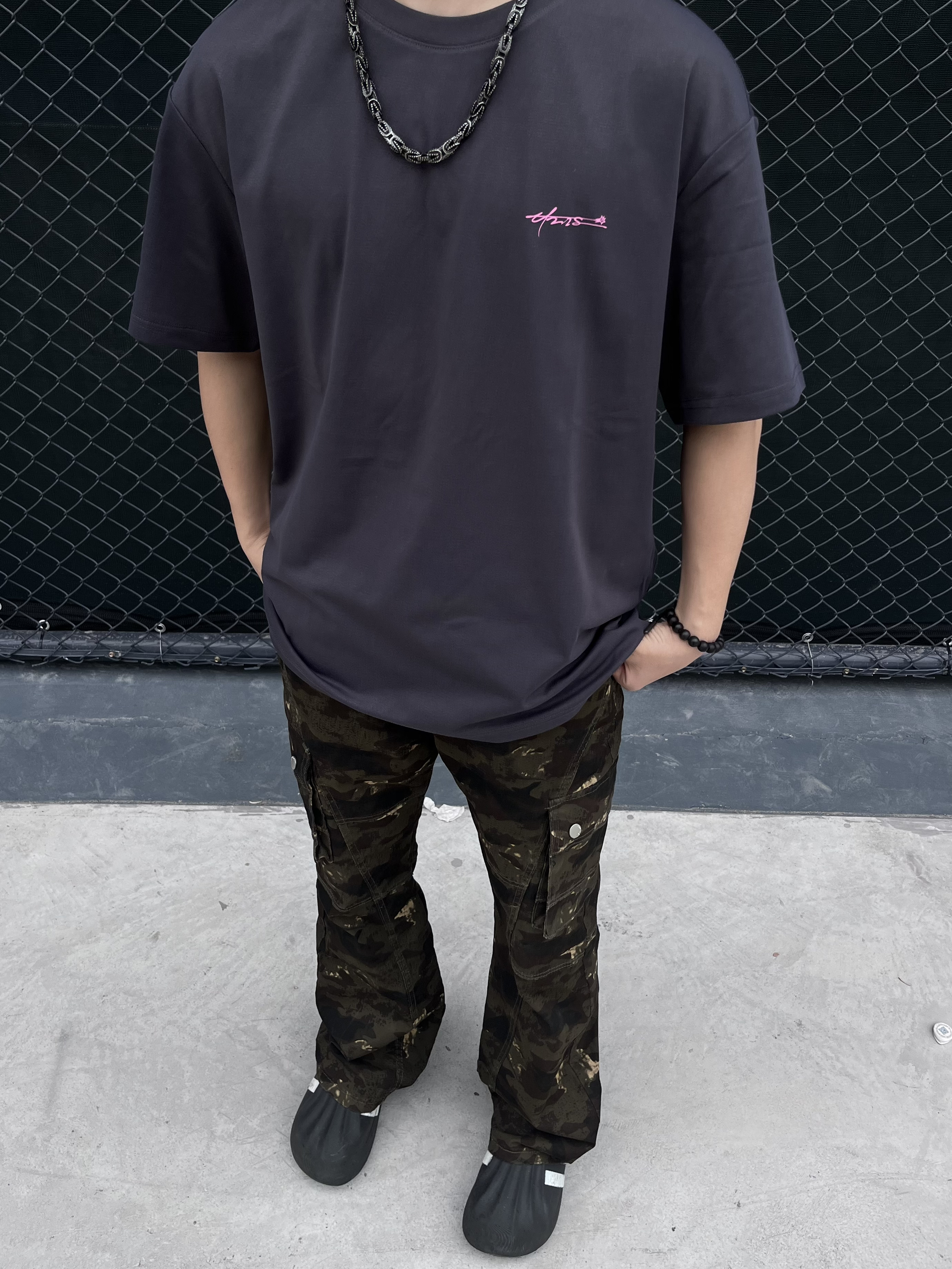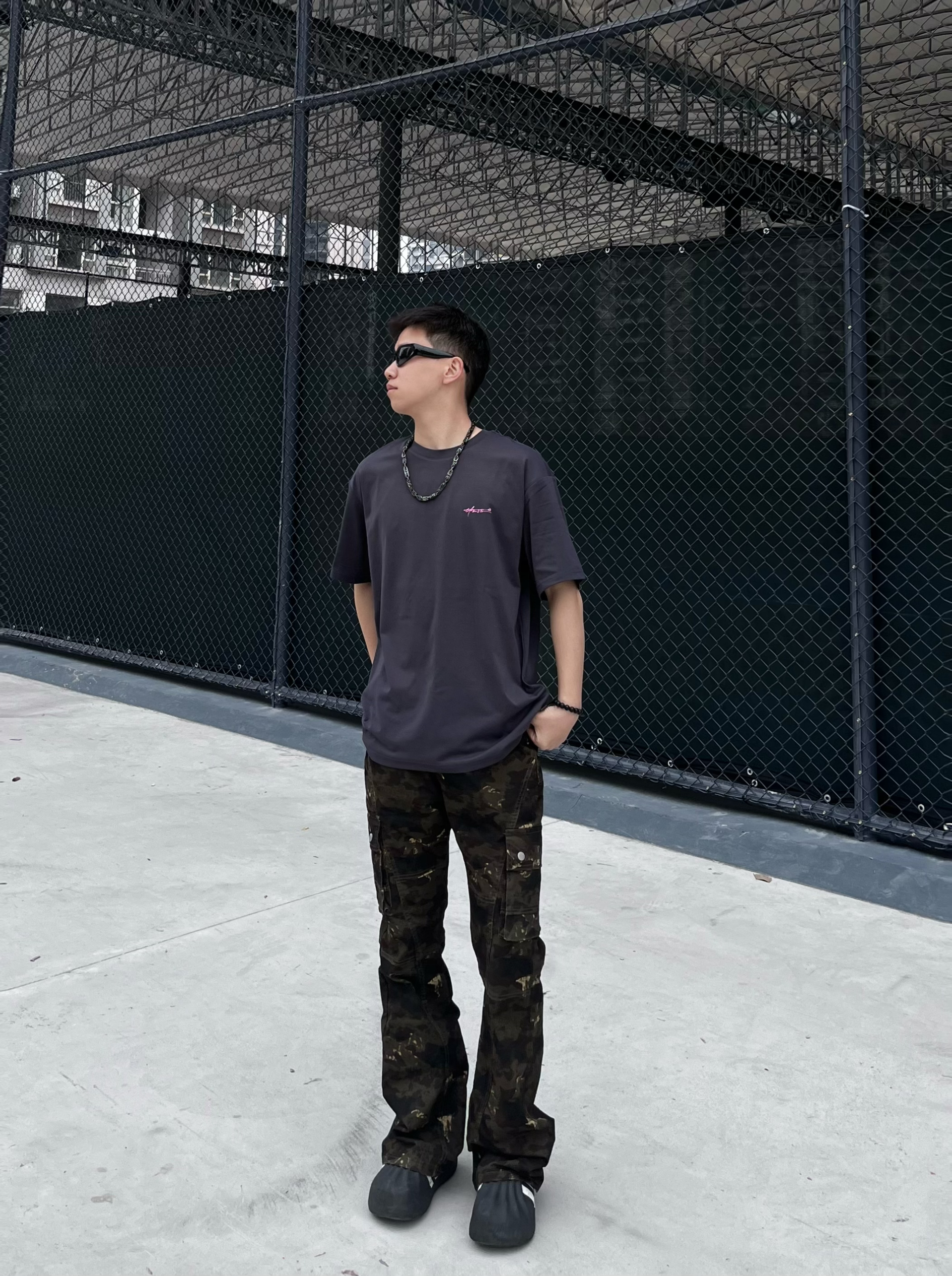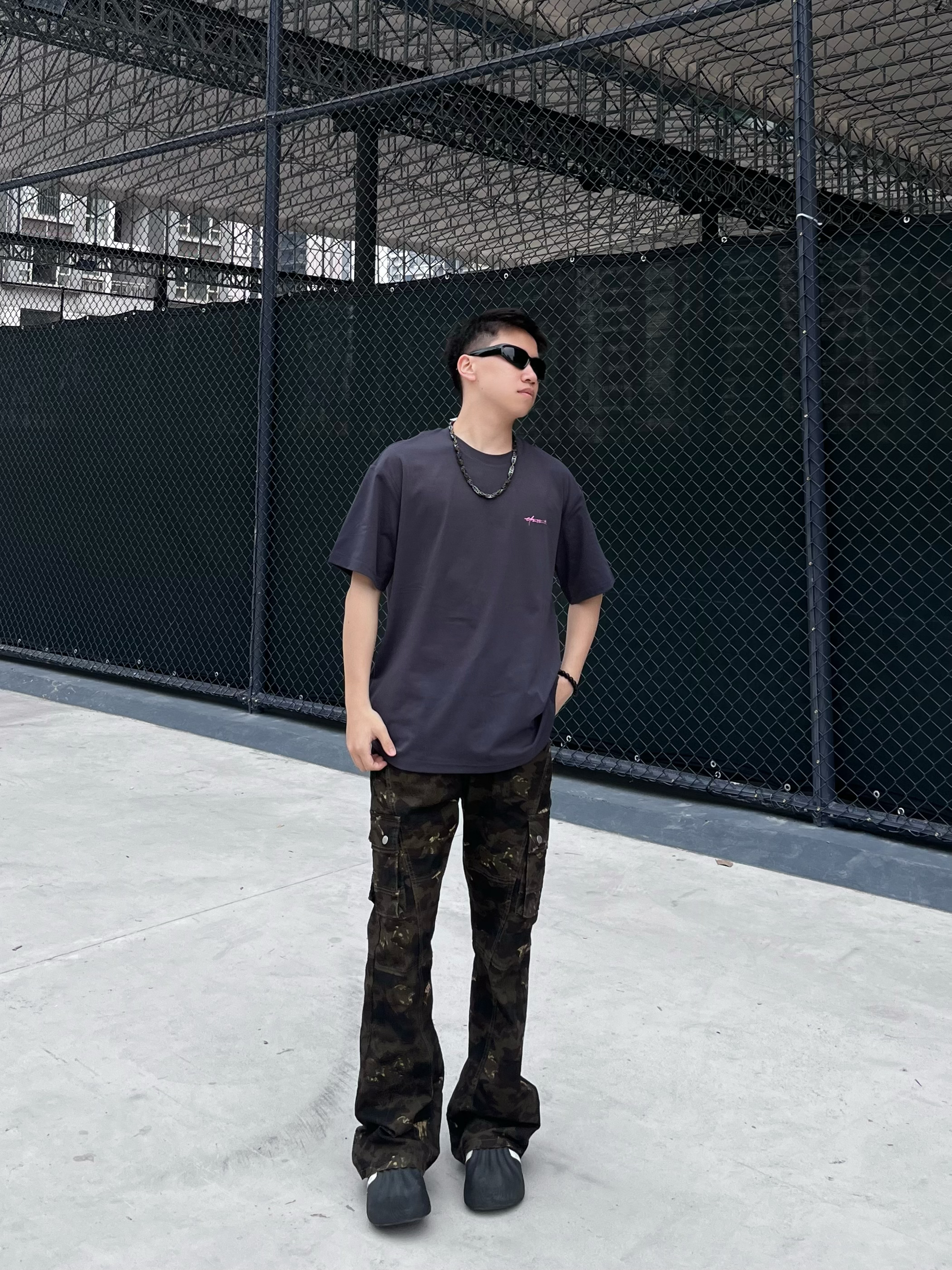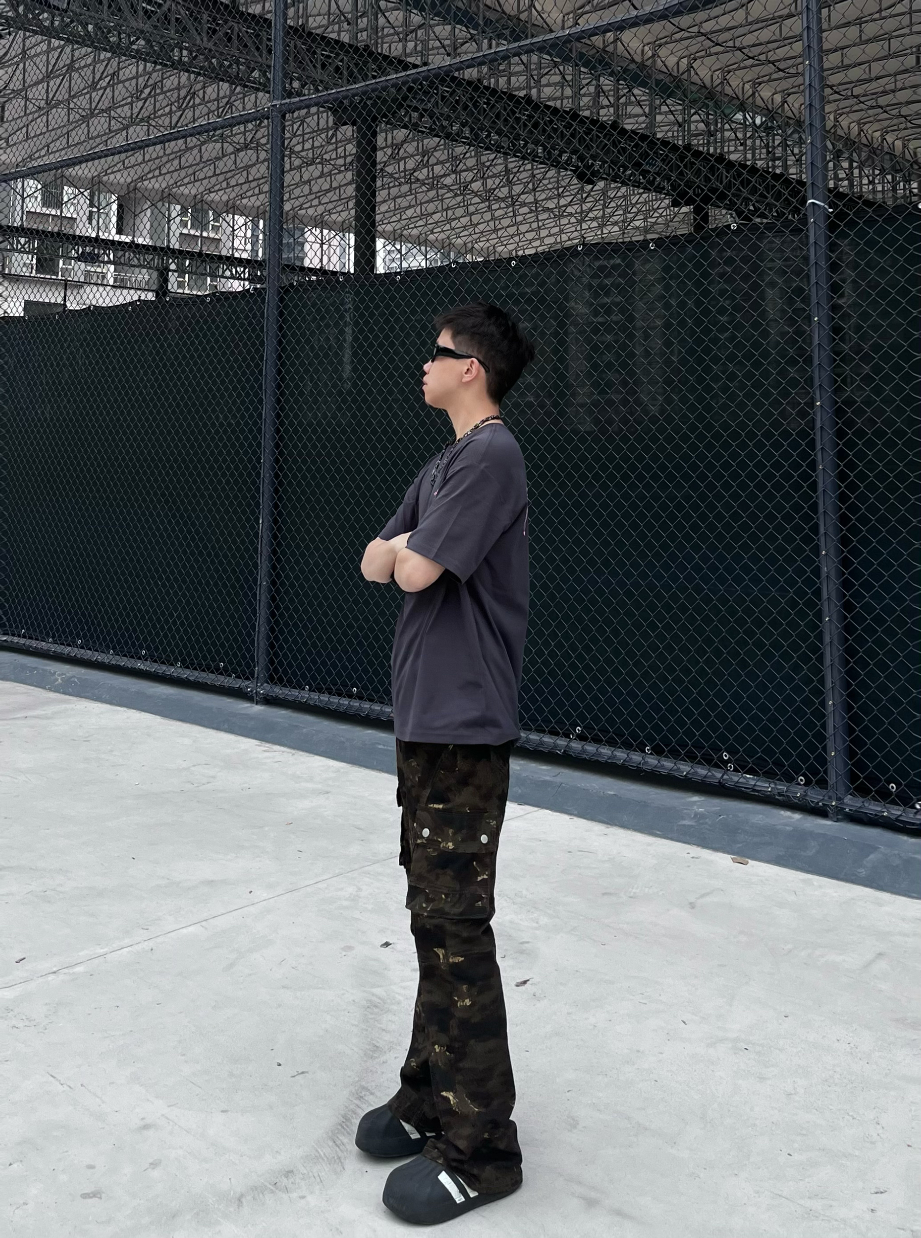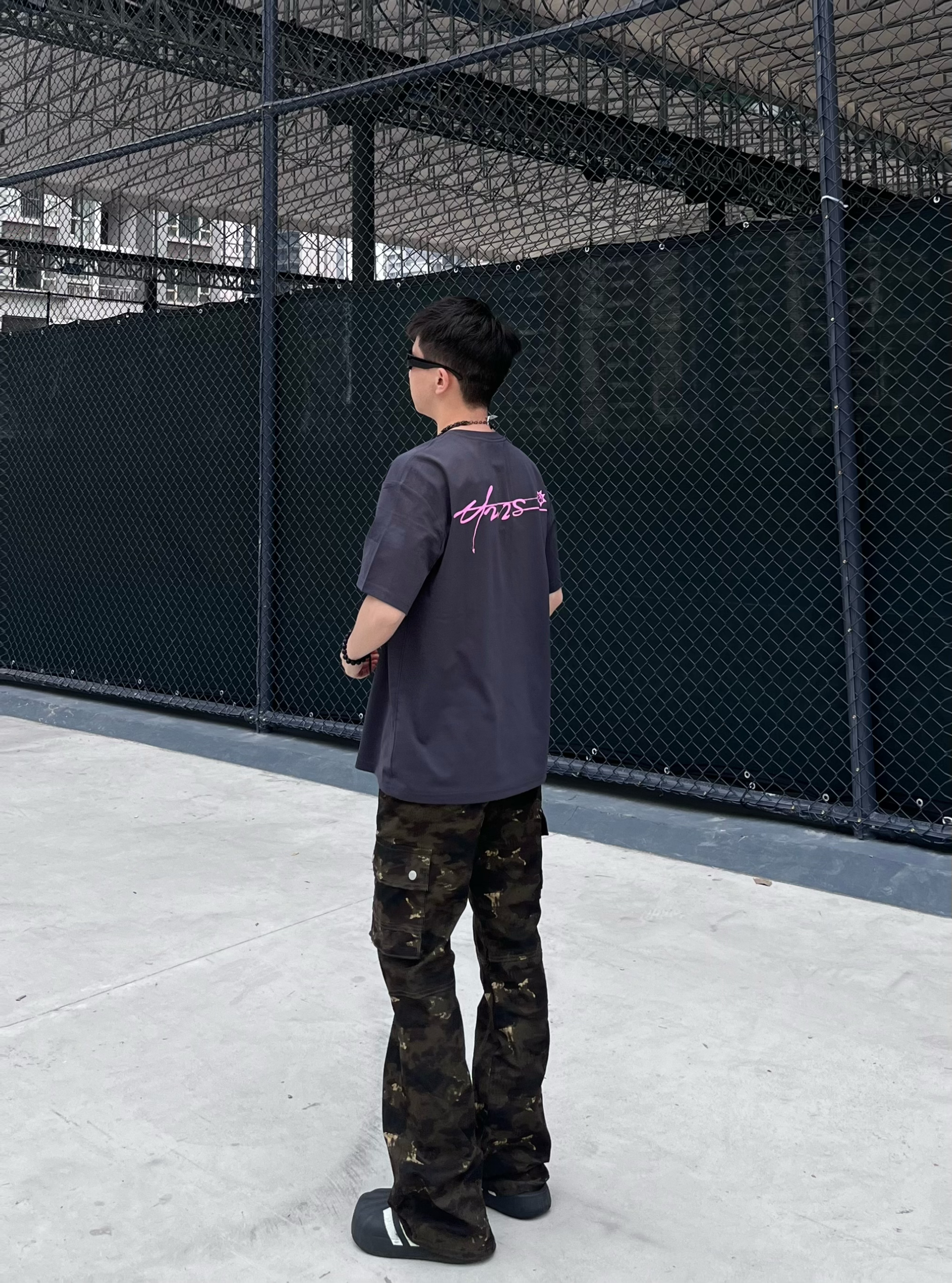 美式复古运动风休闲穿搭,主打街头酷感+户外实用性,完美适配球场、citywalk和轻户外场景。 • 上衣:深灰暗紫短袖T恤,前后粉色流星印花点缀,宽松版型慵懒随性,透气面料应对运动出汗也不闷,美式街头感拉满。 • 下装:暗纹迷彩微喇工装裤,多口袋设计满足户外收纳需求,做旧迷彩自带复古滤镜,微喇裤型修饰腿型,耐磨面料适配球场和户外行走。 • 鞋子:黑色条纹包头拖+中筒袜,懒人友好,软弹脚感走路...