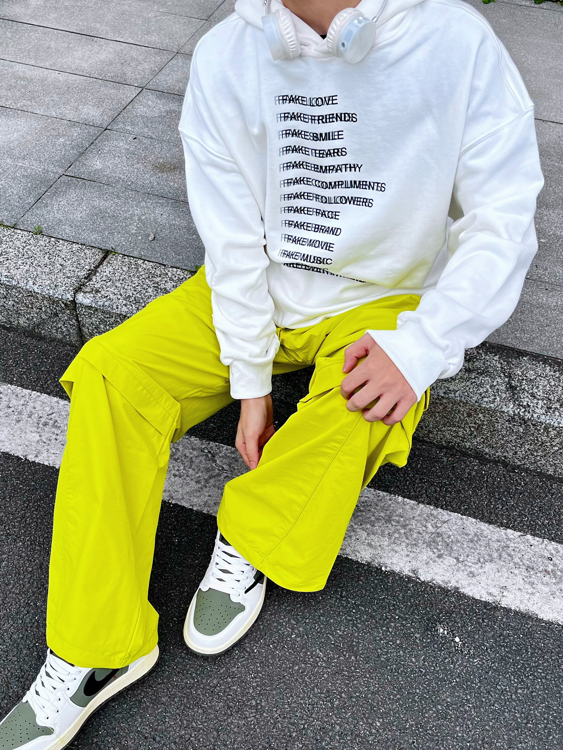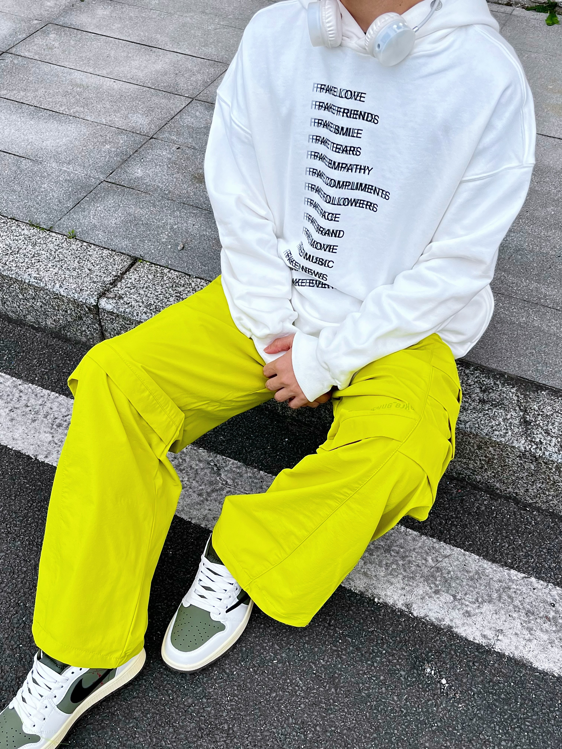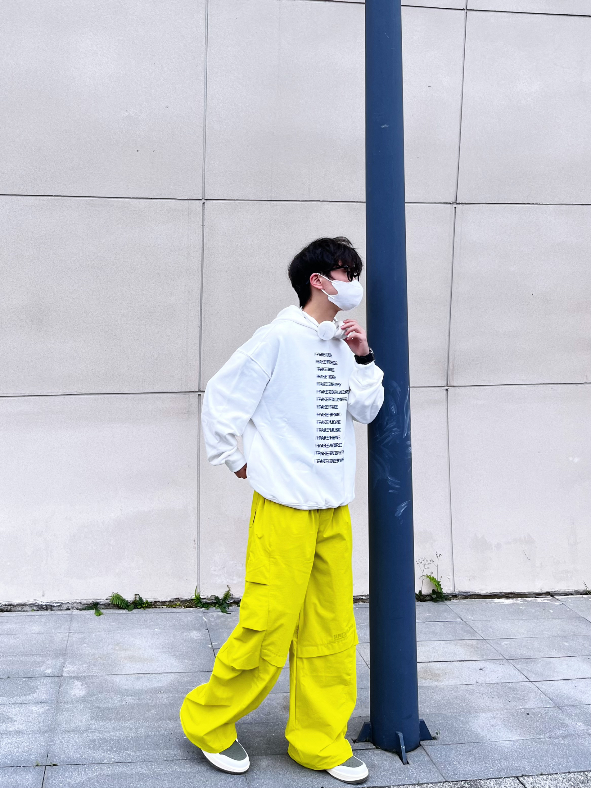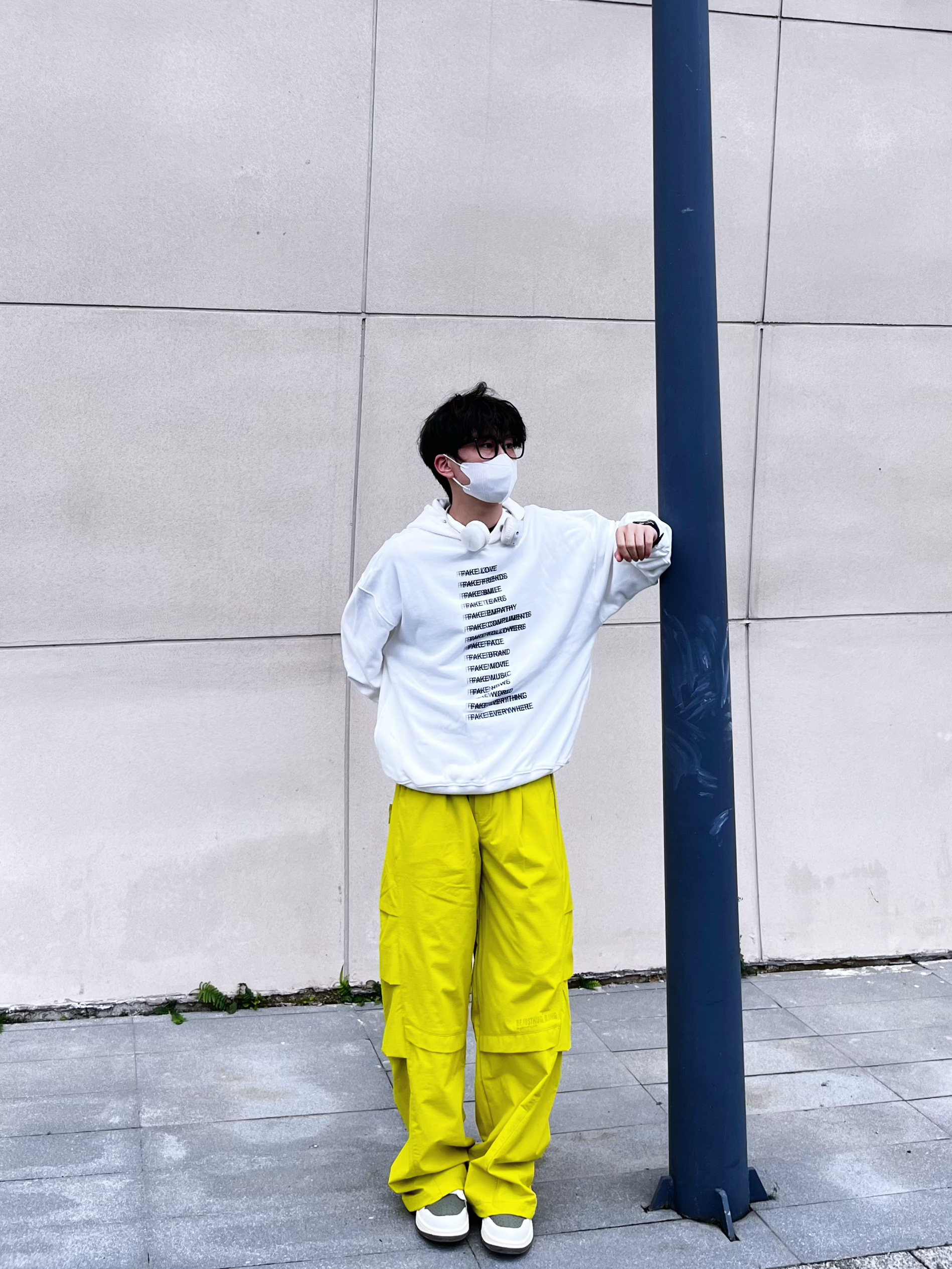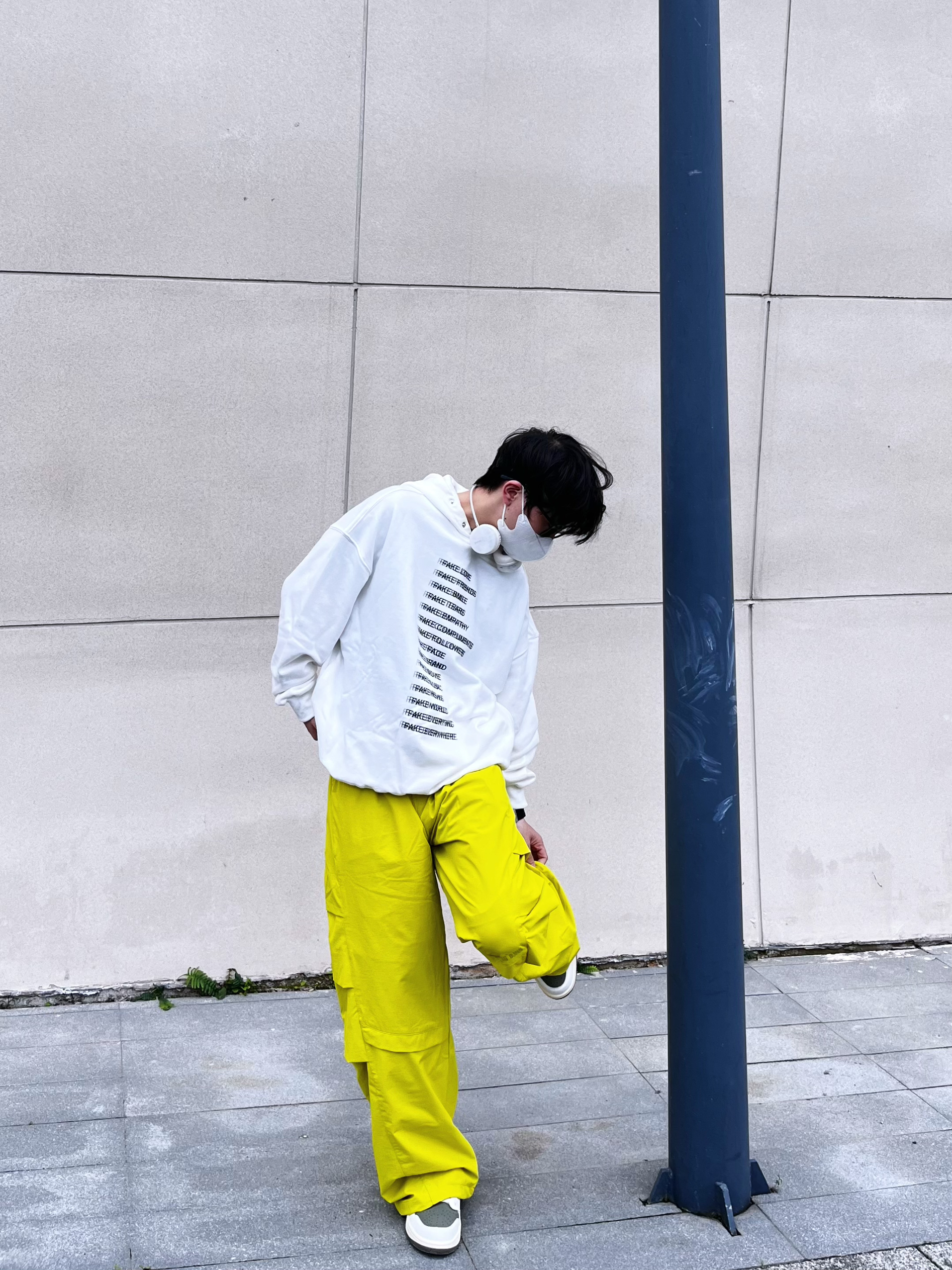 今日份运动户外时髦派上线🍋用高饱和色彩打破沉闷,打造活力满满的彩色运动套装风。 核心单品解析: • 上衣:oversize白色字母连帽卫衣,宽松版型适配户外场景,叠戴白色耳机更添街头感。 • 下装:亮黄色机能风工装阔腿裤,多口袋设计兼顾实用性与潮流感,垂坠感满分。 • 鞋履:白绿拼色板鞋,中和亮色的跳脱,让整体搭配更协调。 穿搭思路: 以「白+亮黄」撞色为核心,用基础色平衡高饱和色彩,既满...
