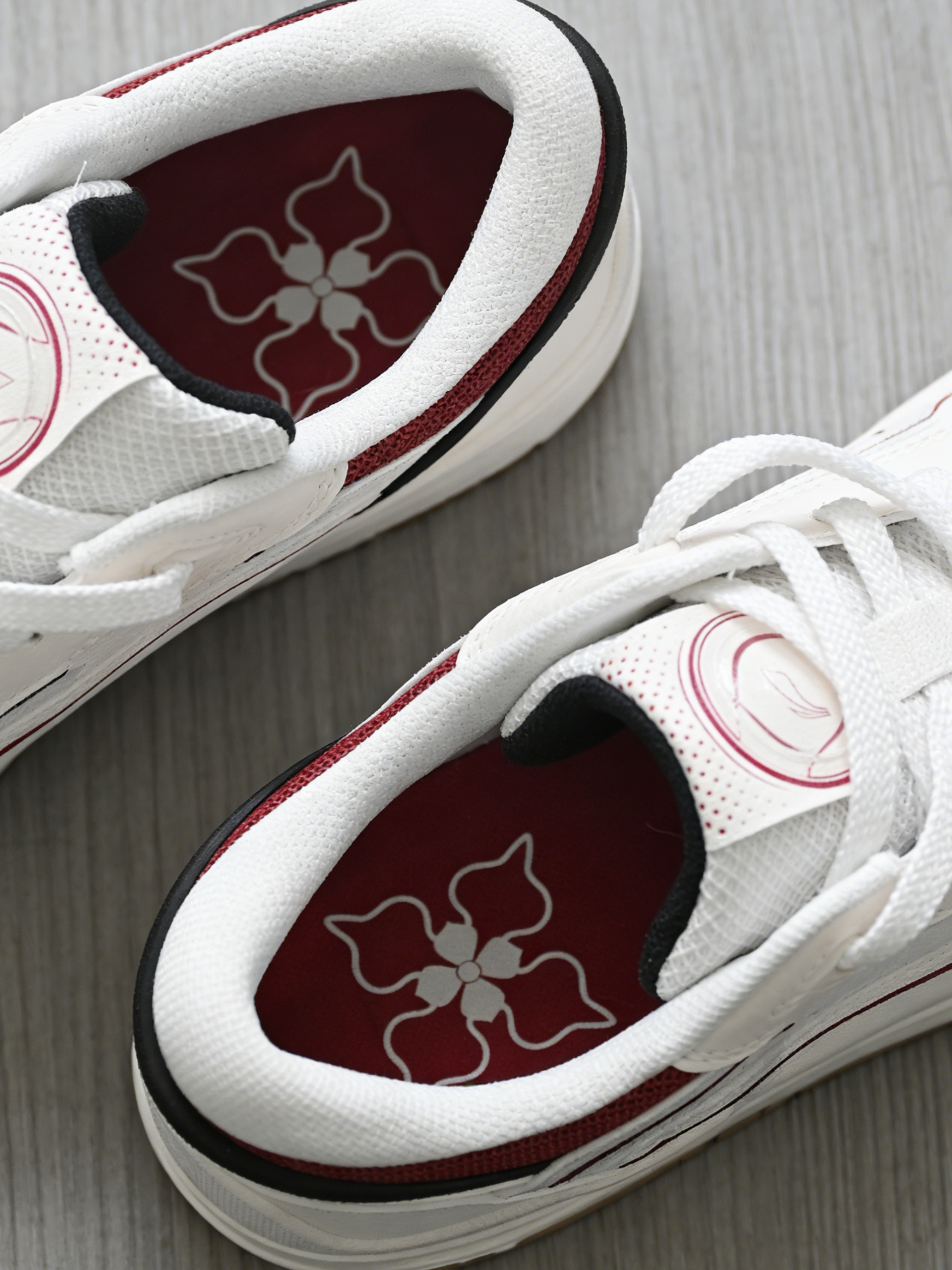 纯净的白色打底,搭配上红色线条点缀,就像冬日里的红梅绽放在雪地上,既经典又亮眼,细节处的花纹点缀,时尚感拉满。日常出街搭牛仔裤、运动裤都超好看。 合成革搭配网眼织物,既有皮革的挺括质感,又保证了良好的透气性。穿了几天下来,完全不会觉得闷脚,而且打理起来也方便。 上脚的感觉不错!鞋垫软弹,中底的科技带来明显的缓震效果,走路、运动都很舒服。