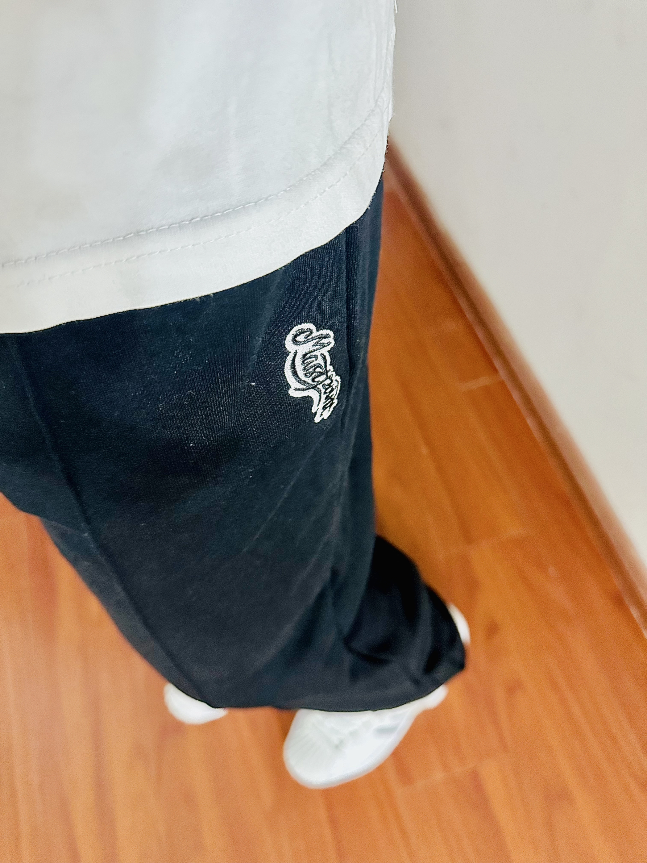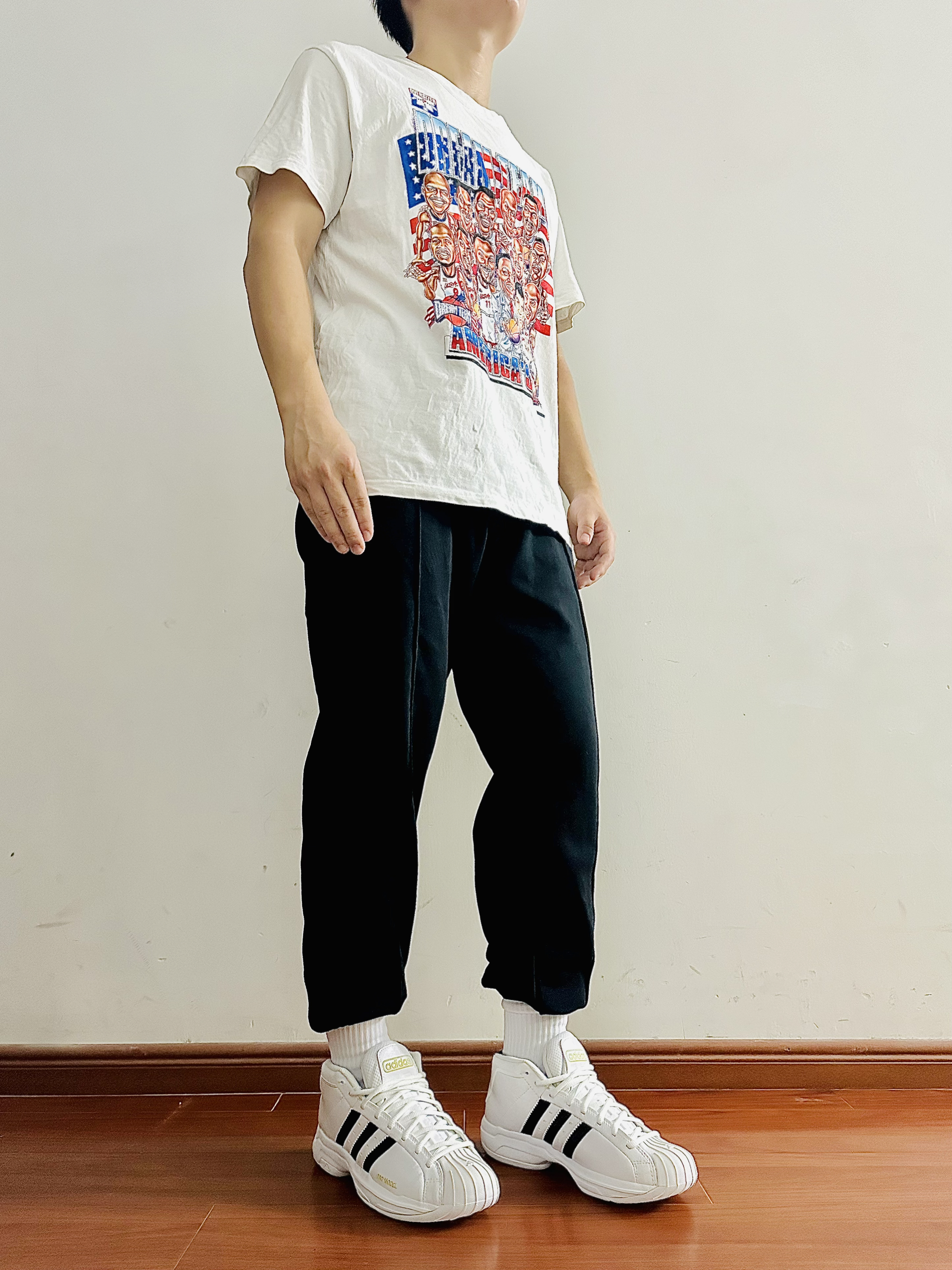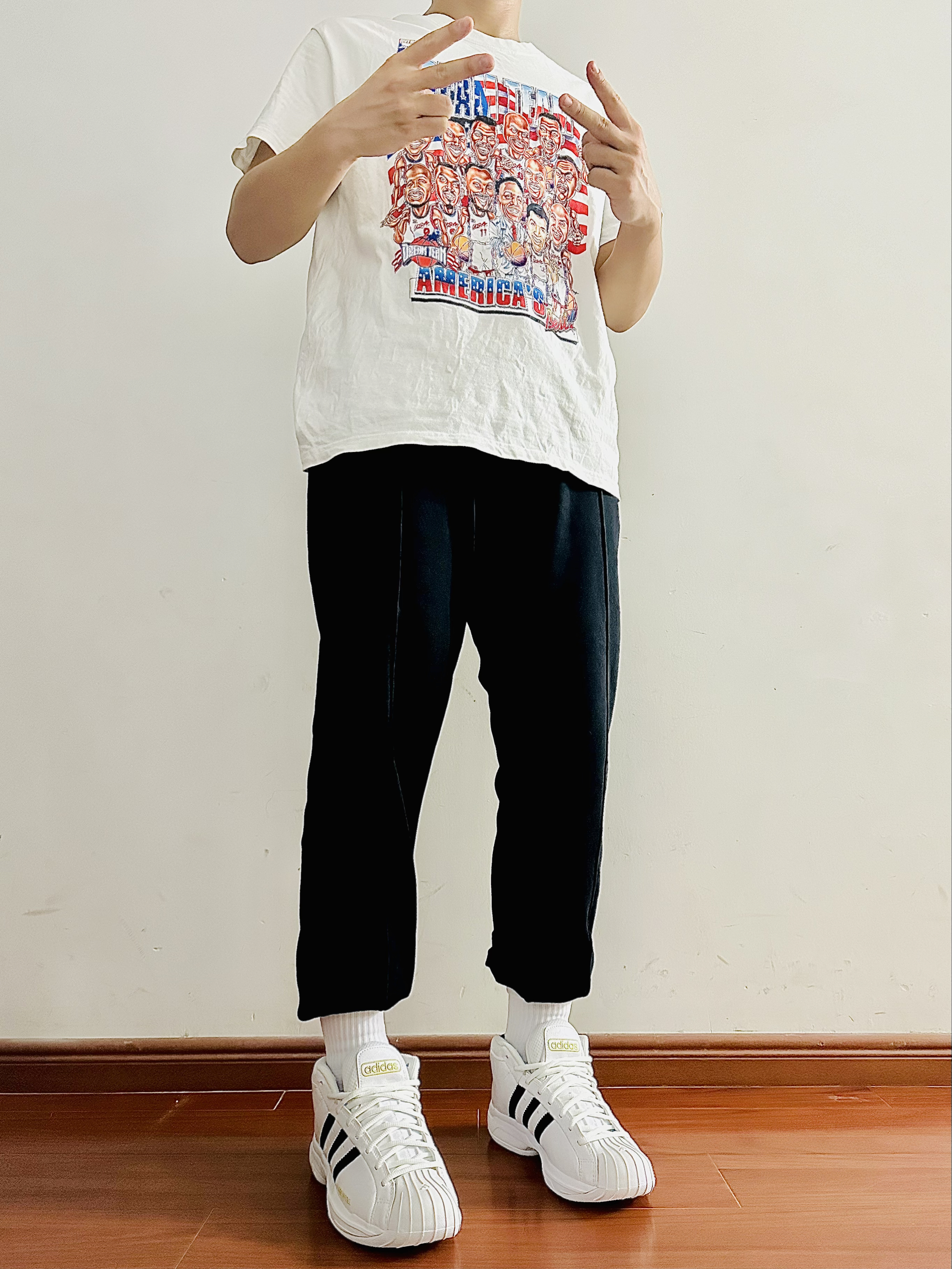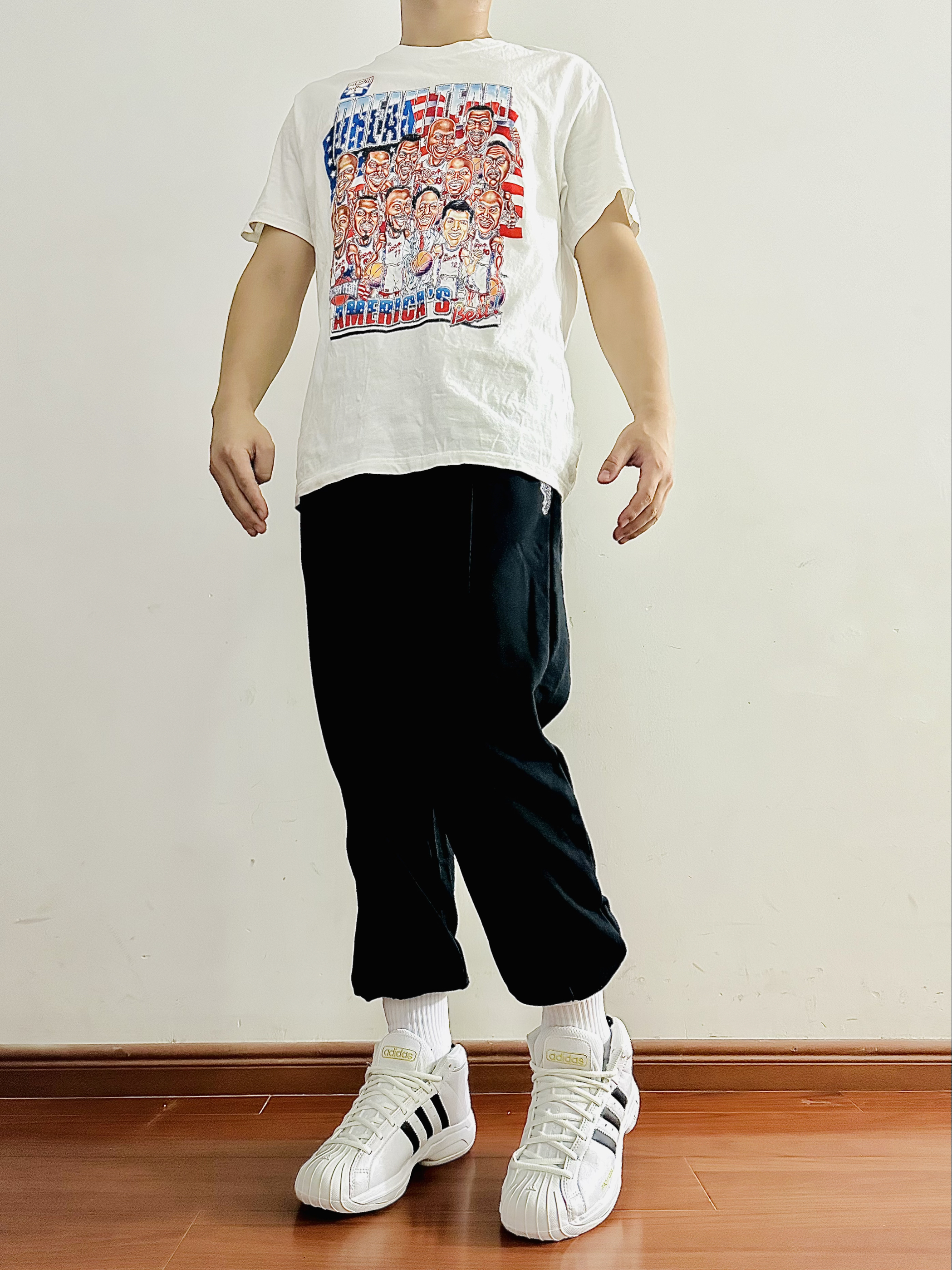 今日份运动穿搭 白色印花短袖➕黑色束脚卫裤➕Adidas篮球鞋 👖: Mast Point/麦左 裤子上宽下窄的版型 上身效果很不错很舒服 立体剪切设计 让裤子整体看起来更硬挺💯 面料贴肤感觉很柔软 弹性也不错 束脚的设计很适合扎袜穿 让你成为美式小子😙 日常出门还是运动穿 都很好看很显青春阳光 尺码推荐:170 65㎏ 选择尺码:M码