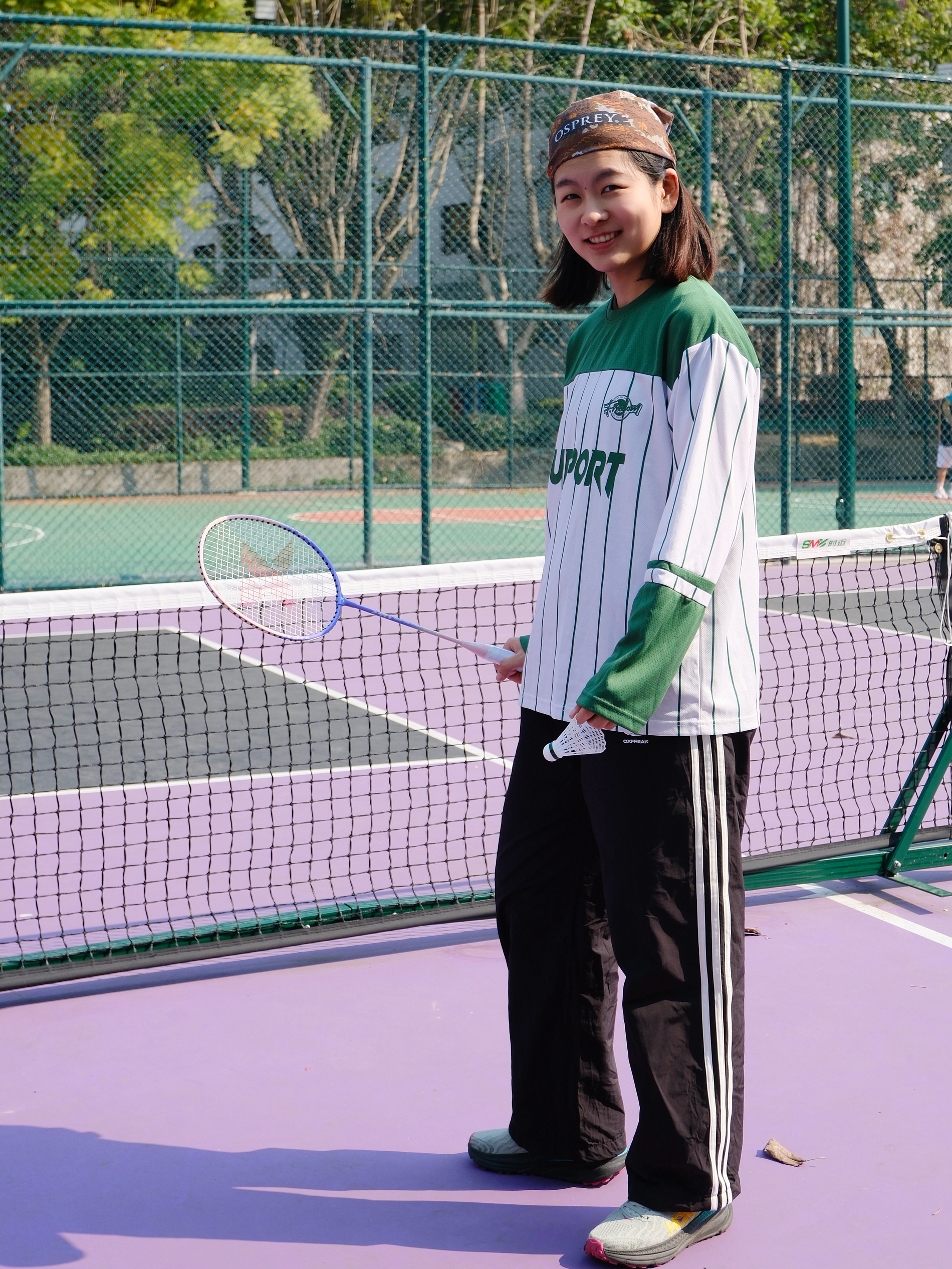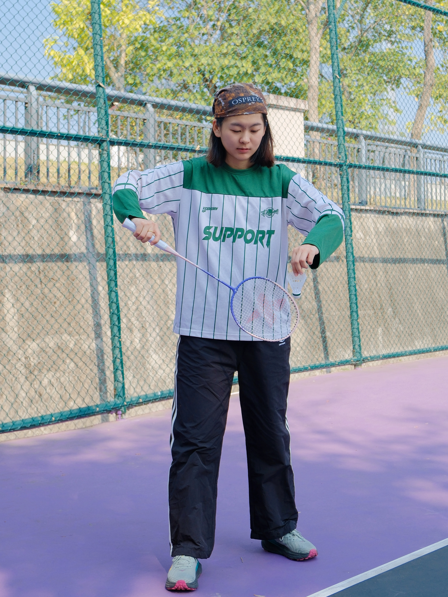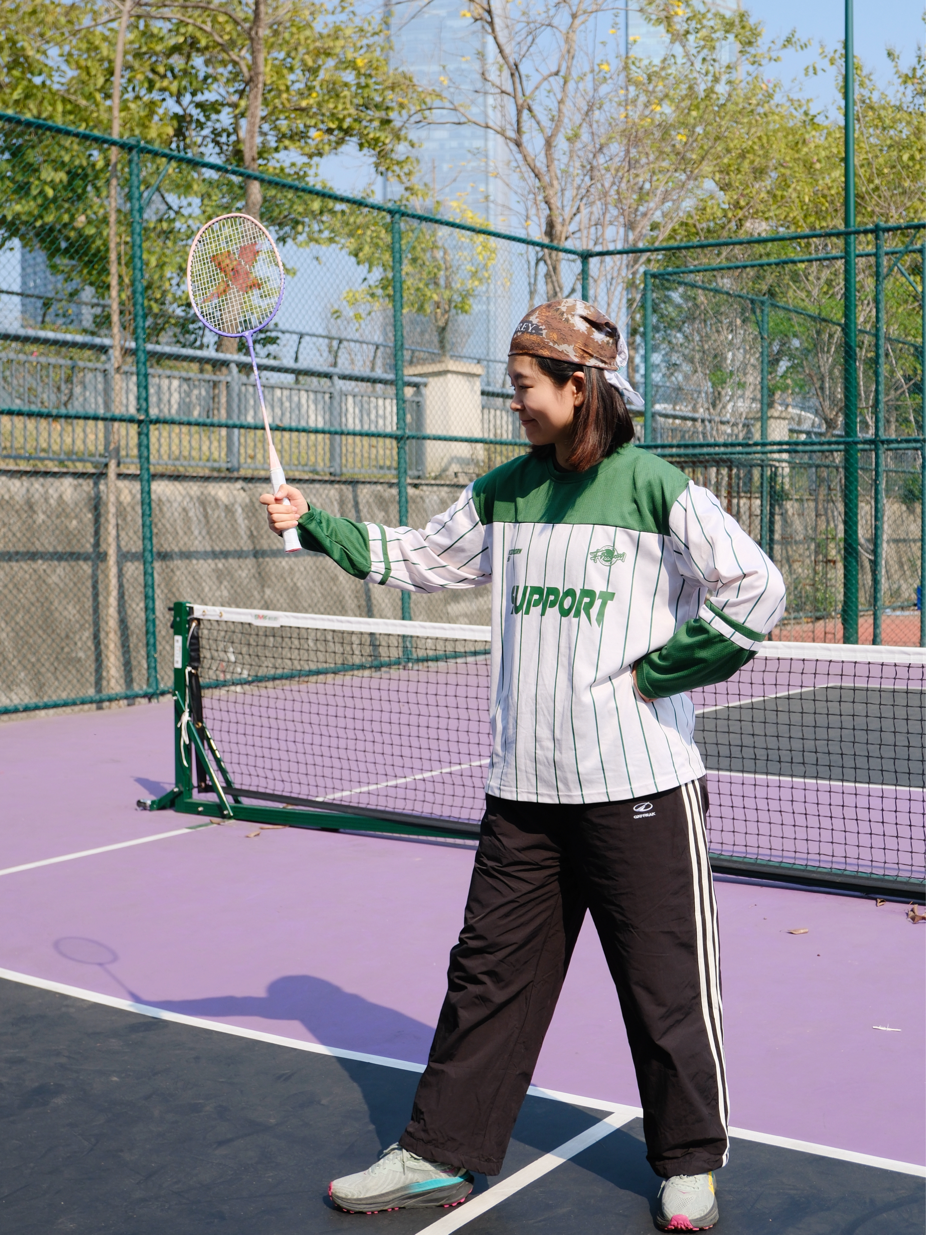 谁懂啊!羽毛球场上的松弛感穿搭太绝了✨ 绿白条纹运动长袖+复古三条杠运动裤, 把美式复古和运动感焊在身上! 轻量球拍在手,发球、扣杀都超顺手 这款羽毛球拍手感舒适,新手友好~ 在紫色球场和阳光里, 这才是羽毛球女孩的正确打开方式!