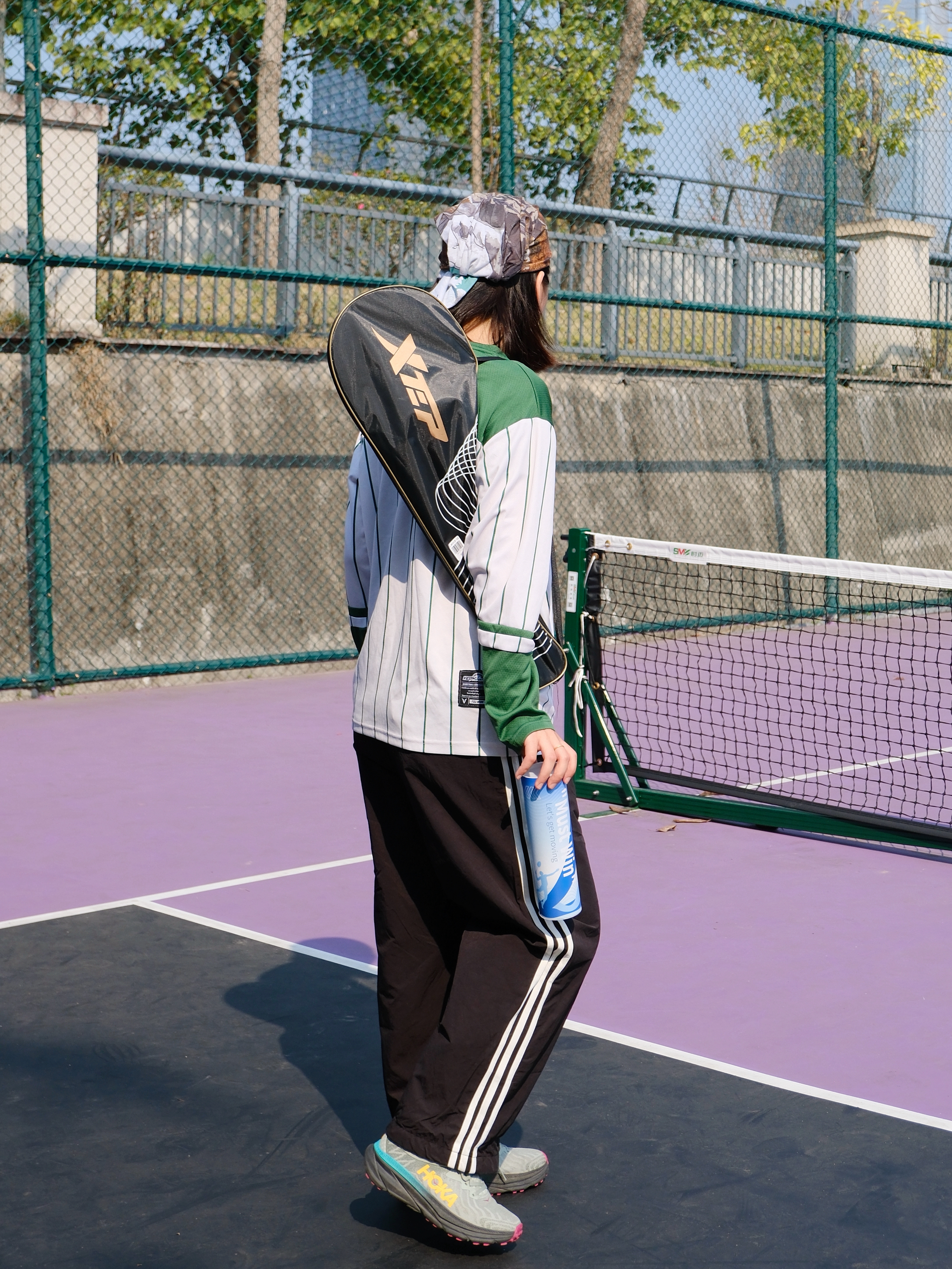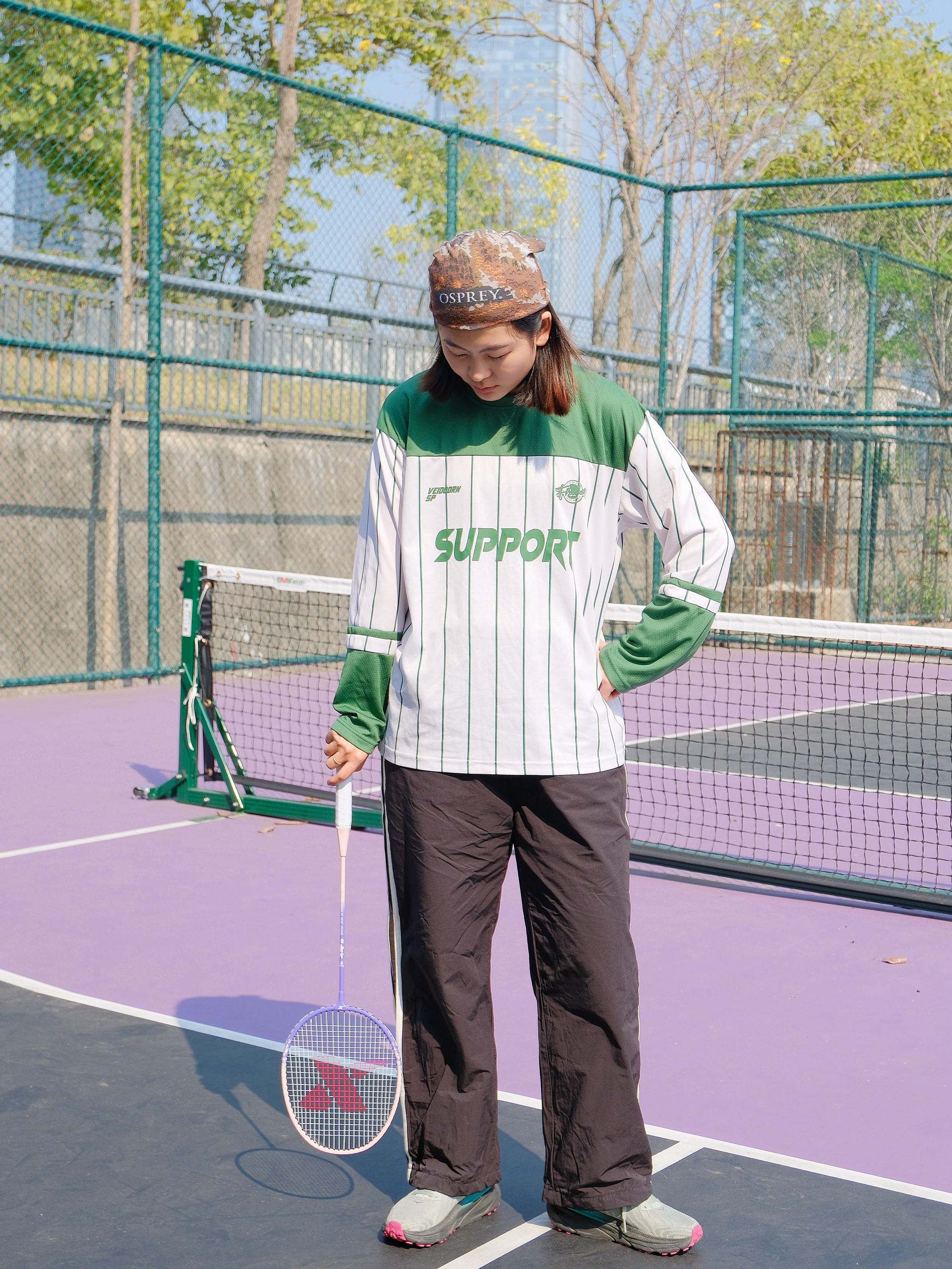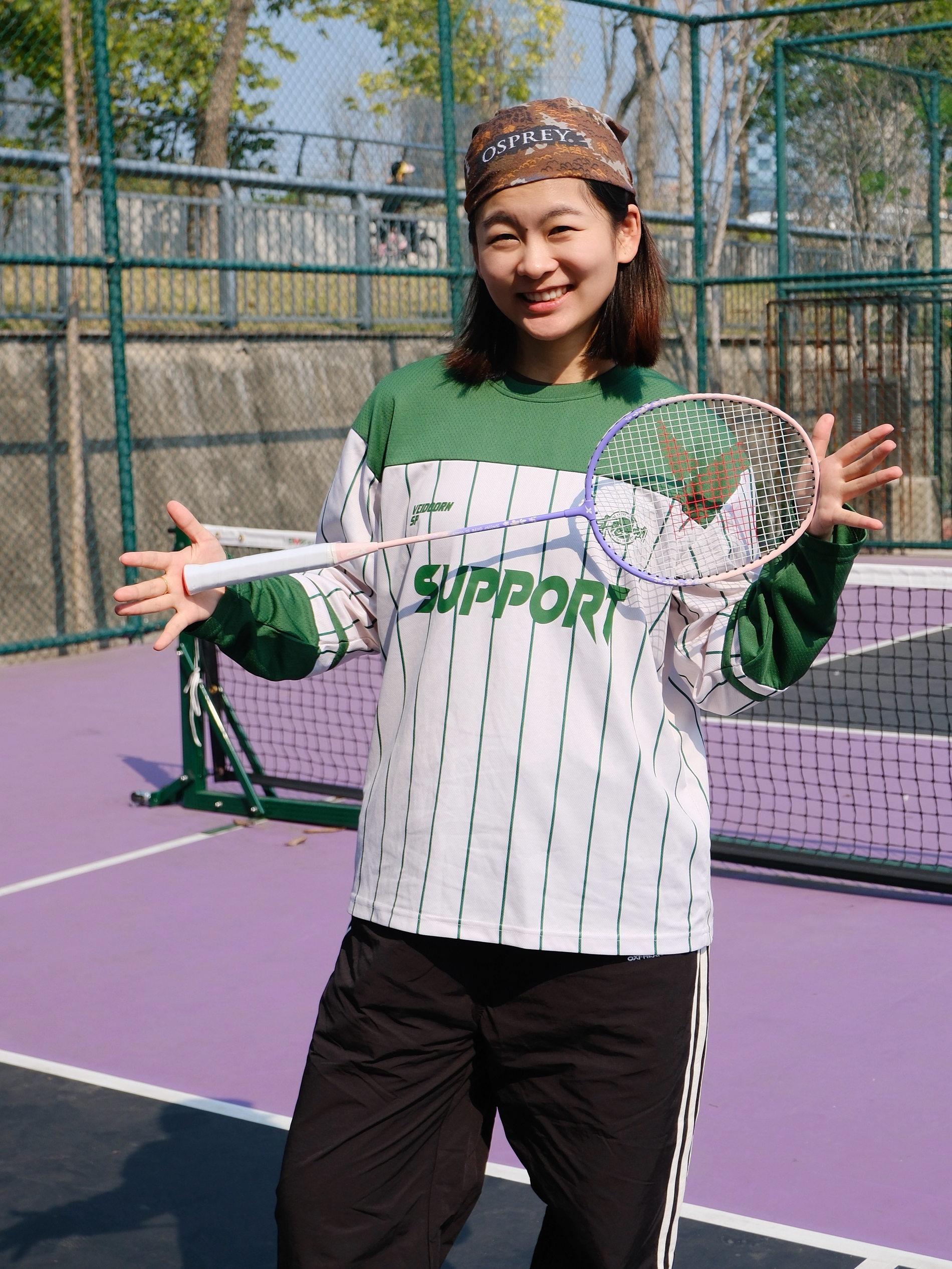 谁懂啊!羽毛球场上的松弛感穿搭太绝了✨ 绿白条纹运动长袖+复古三条杠运动裤, 把美式复古和运动感焊在身上! 轻量球拍在手,发球、扣杀都超顺手 这款羽毛球拍手感舒适,新手友好~ 在紫色球场和阳光里, 这才是羽毛球女孩的正确打开方式!