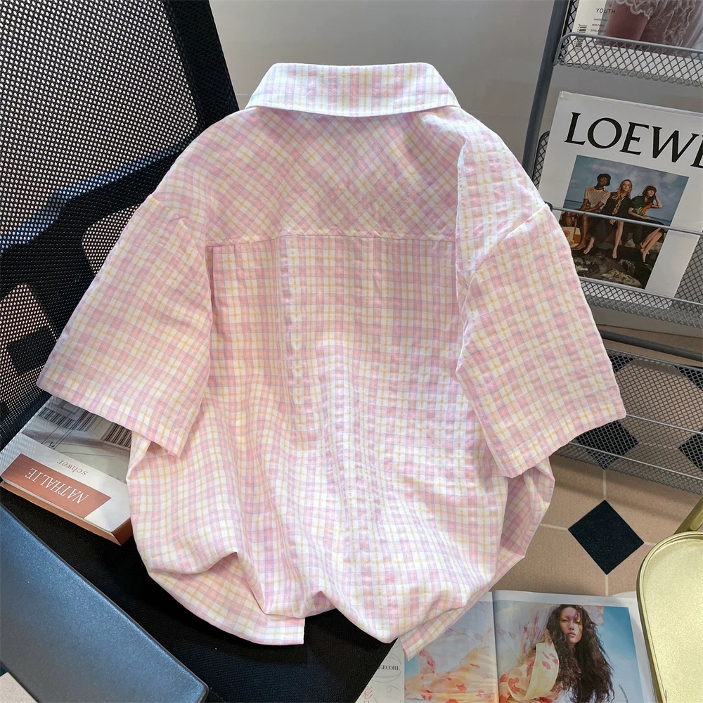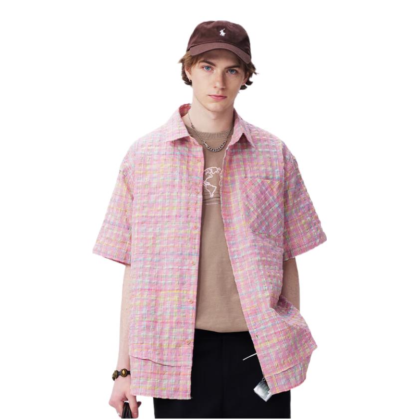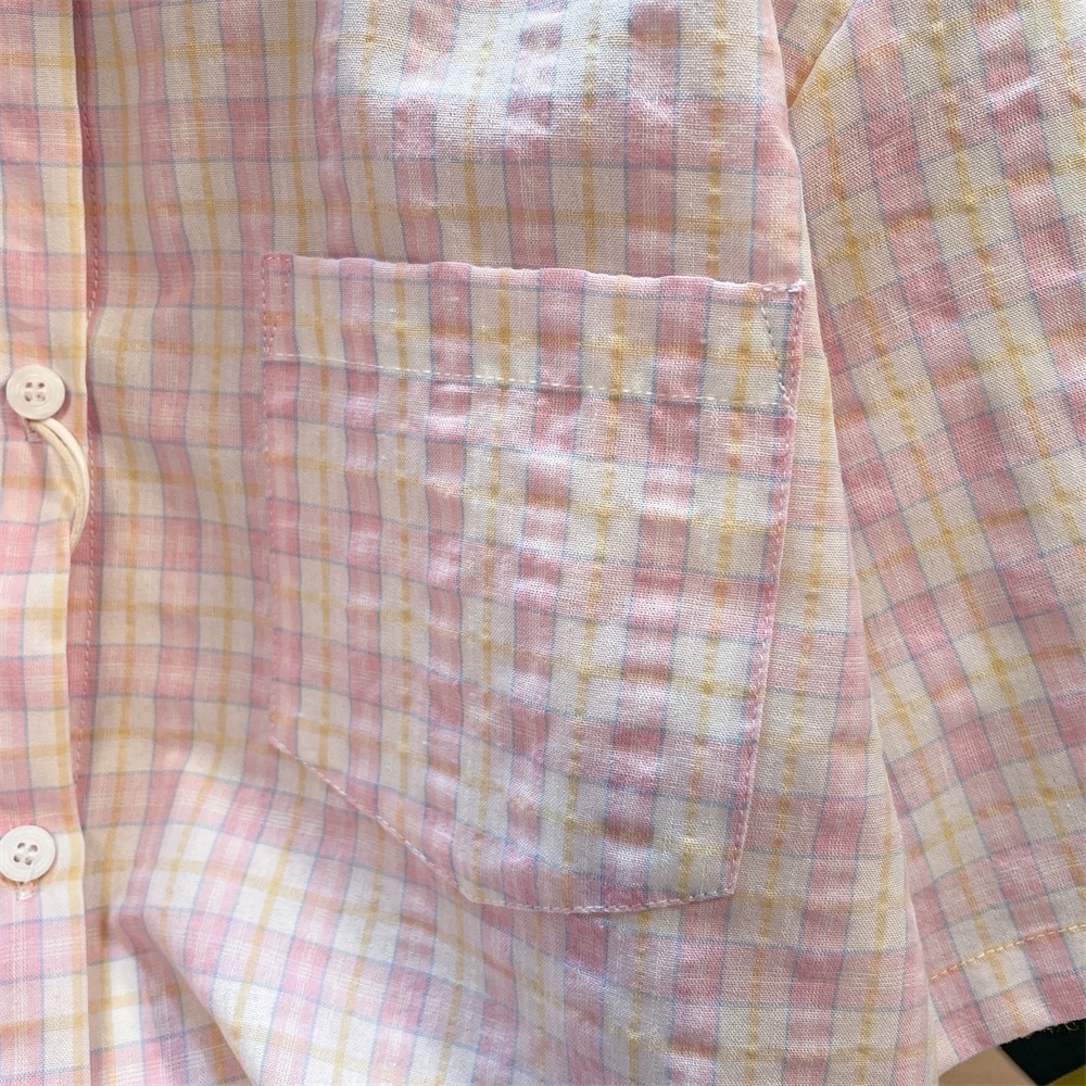 采用经典翻领、单排扣开合设计,左胸设有方形贴袋,版型宽松,穿着舒适度高。 非常好看 从纹理看,大概率是棉感面料或泡泡纱/泡泡格材质,具备透气、轻薄的特点,春夏穿着不闷热,且自带一定的肌理感,避免纯色单调