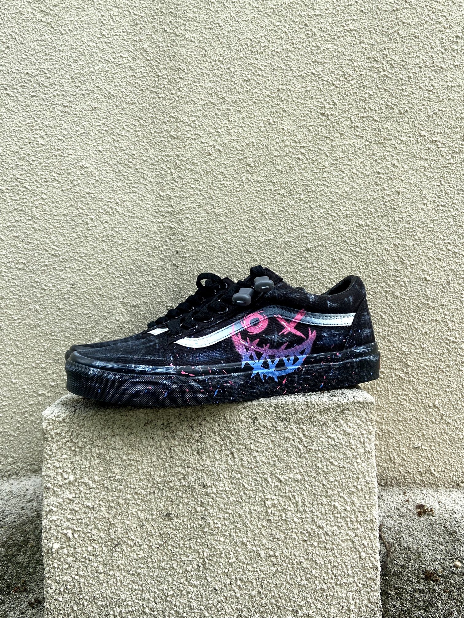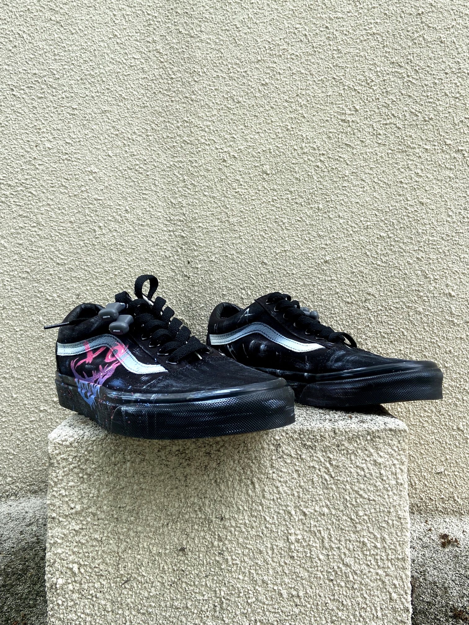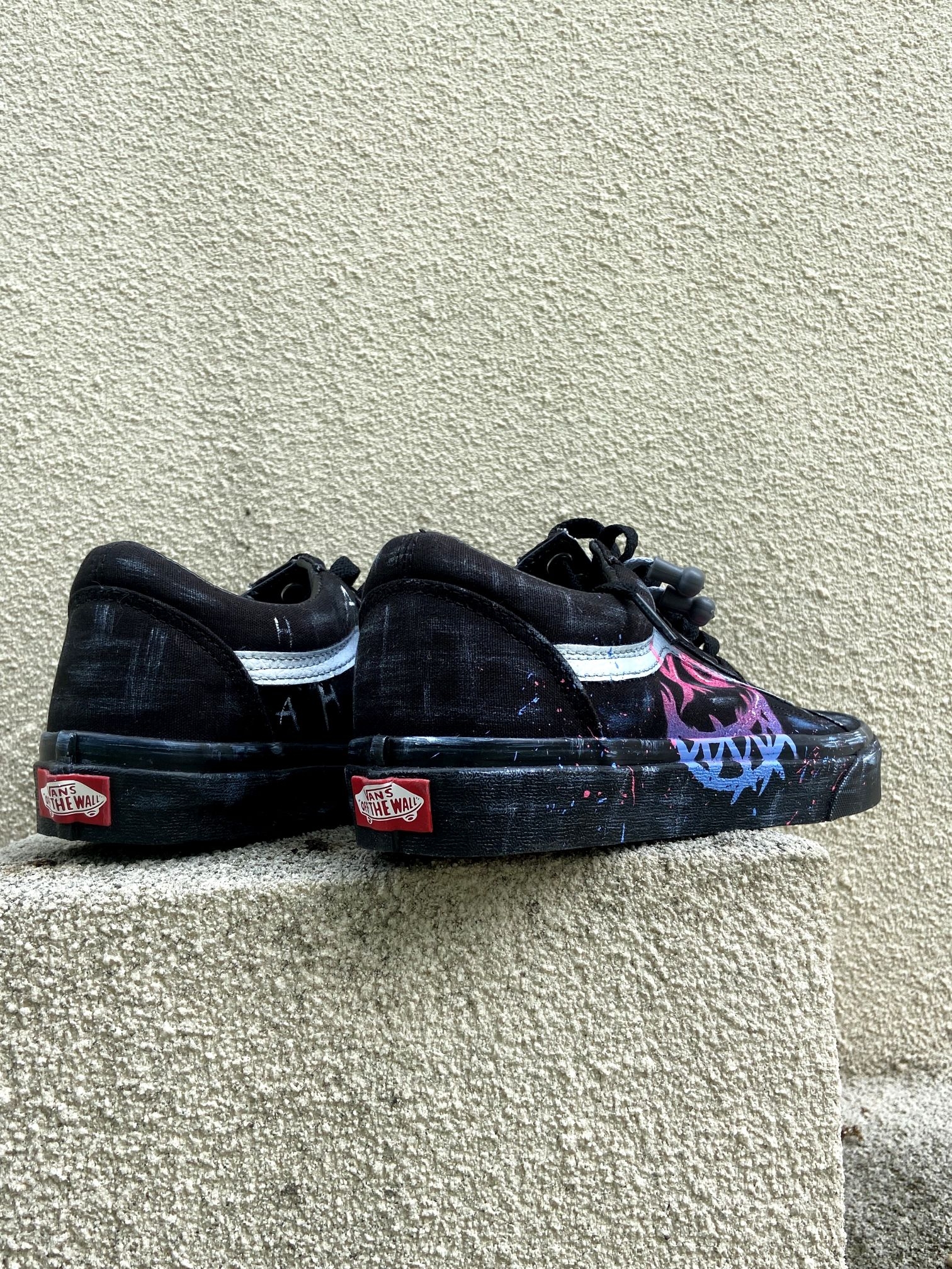 这双鞋是做旧黑底+渐变粉蓝涂鸦的设计,看着很有个性但不夸张,日常穿也不突兀。 帆布材质挺扎实,鞋底是Vans经典的橡胶底,走路、逛街都挺稳,抓地力也不错,穿久了也不容易累脚。 鞋型偏瘦,包裹感刚好,不会磨脚,搭配牛仔裤、工装裤都很合适,属于那种越穿越有味道的款,脏一点反而更有复古感。 唯一要注意的是,涂鸦部分是手绘感的,别太用力刷,不然容易掉漆。