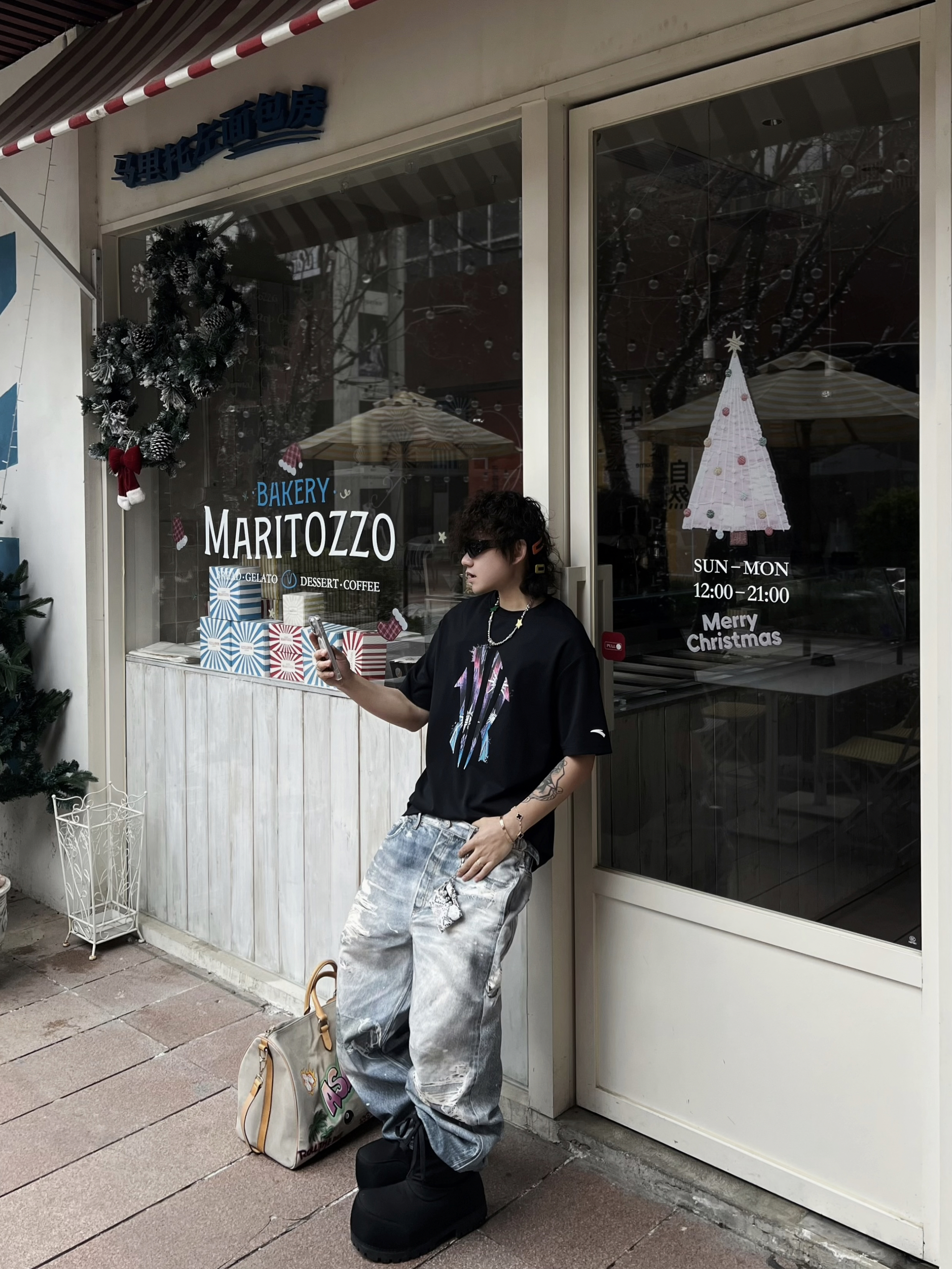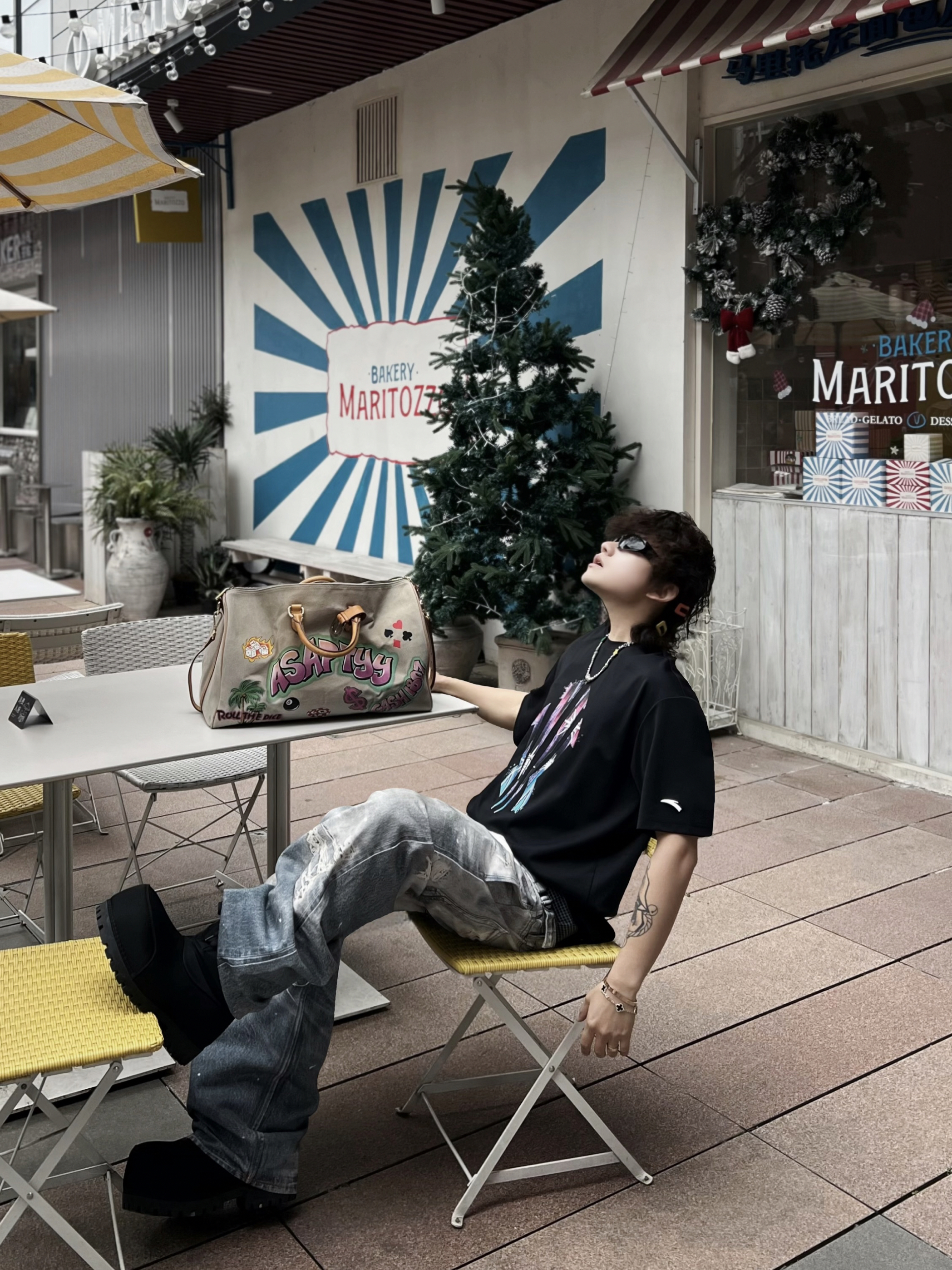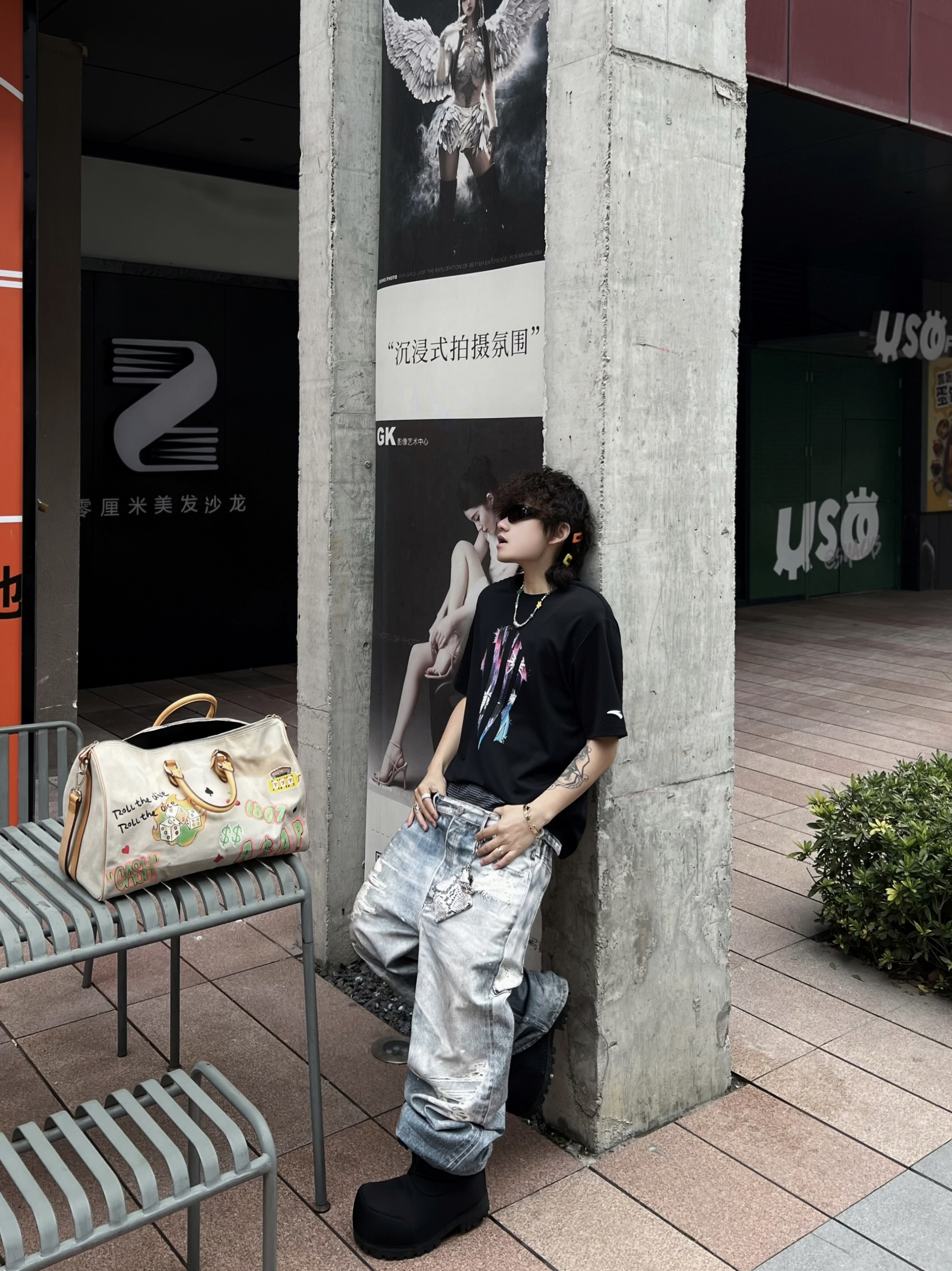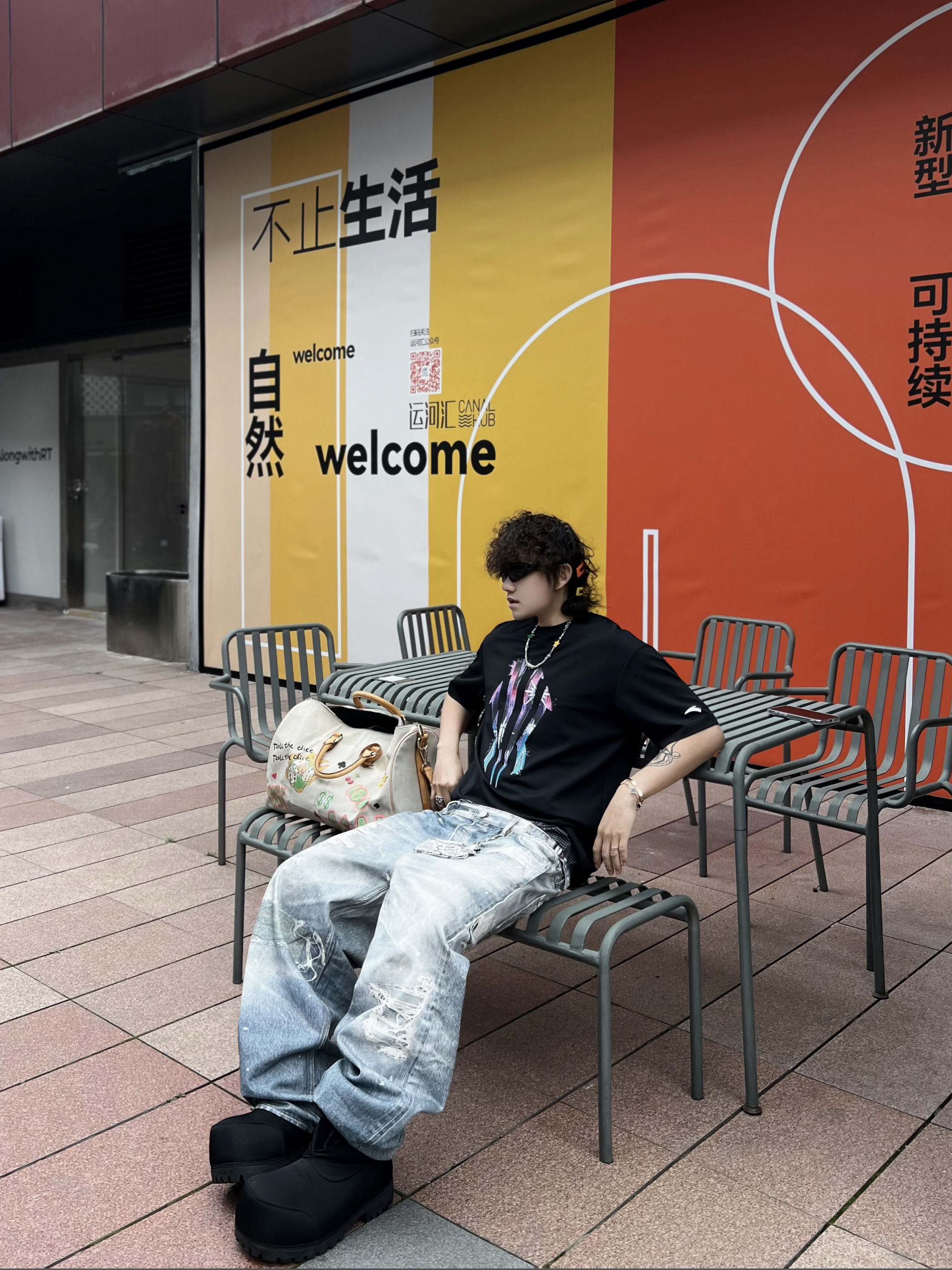 Hi、这里是有点懒的薯条🍟~ ☑️黑T+牛仔的经典组合,被我玩出了新花样! 🔘安踏欧文短袖的渐变印花太吸睛🥊 运动感与潮流感并存😘 🛺做旧水洗牛仔+破洞设计,sagging穿法慵懒又不羁 厚底黑靴踩出气场,配饰点缀让整体更有层次 不用刻意凹造型,随便一站都是街头大片📸 👔 安踏