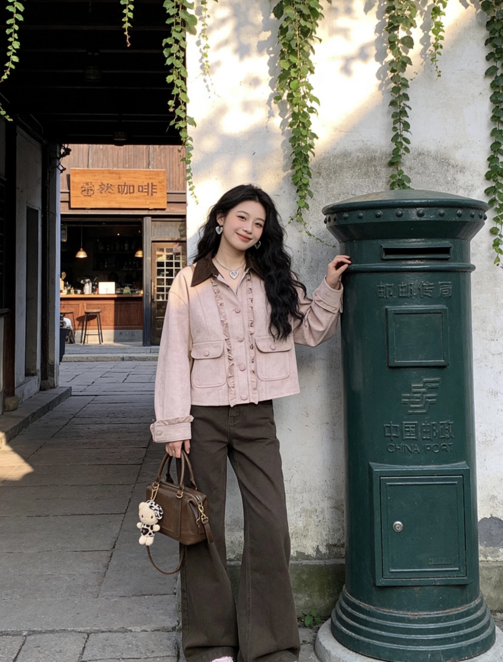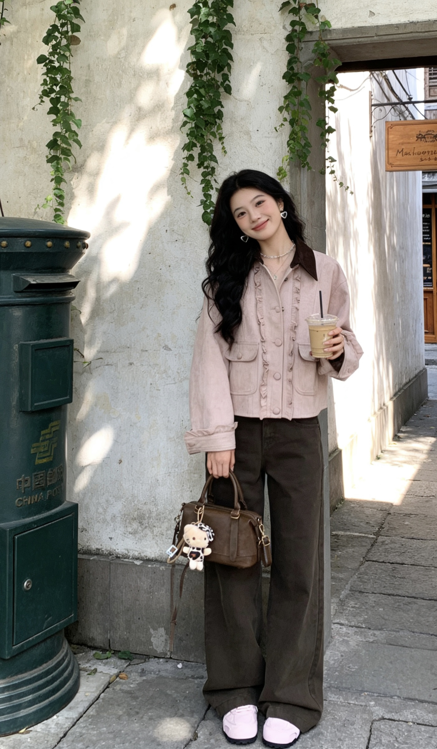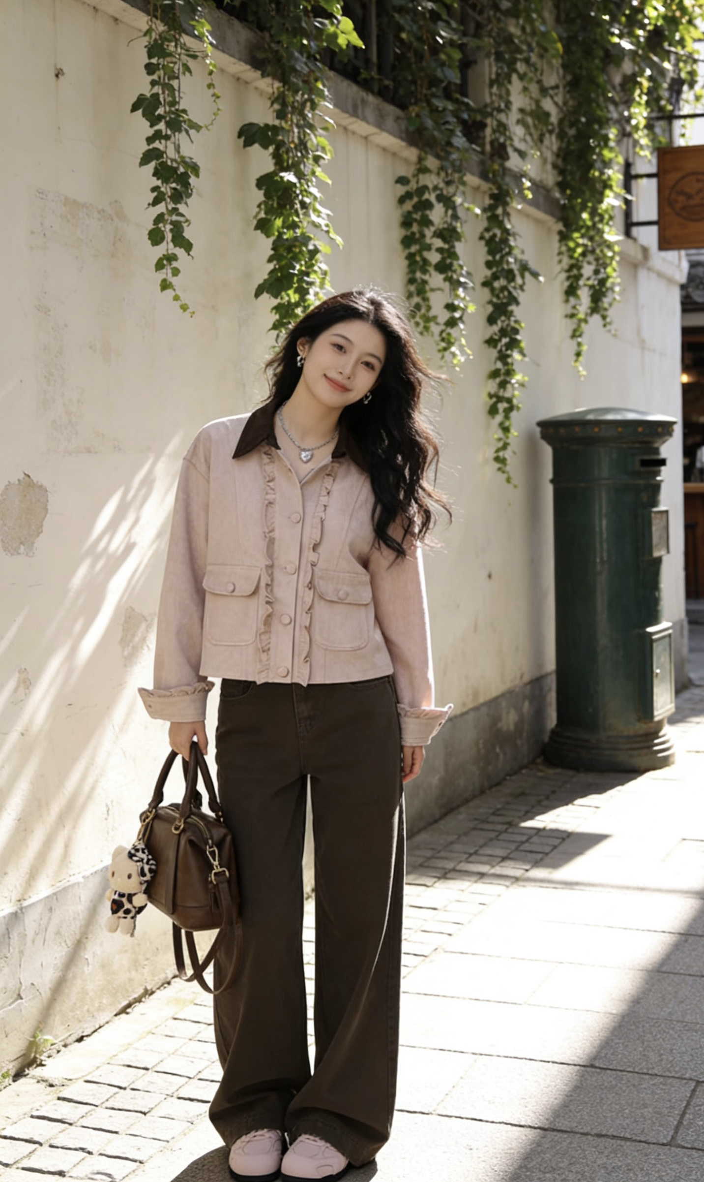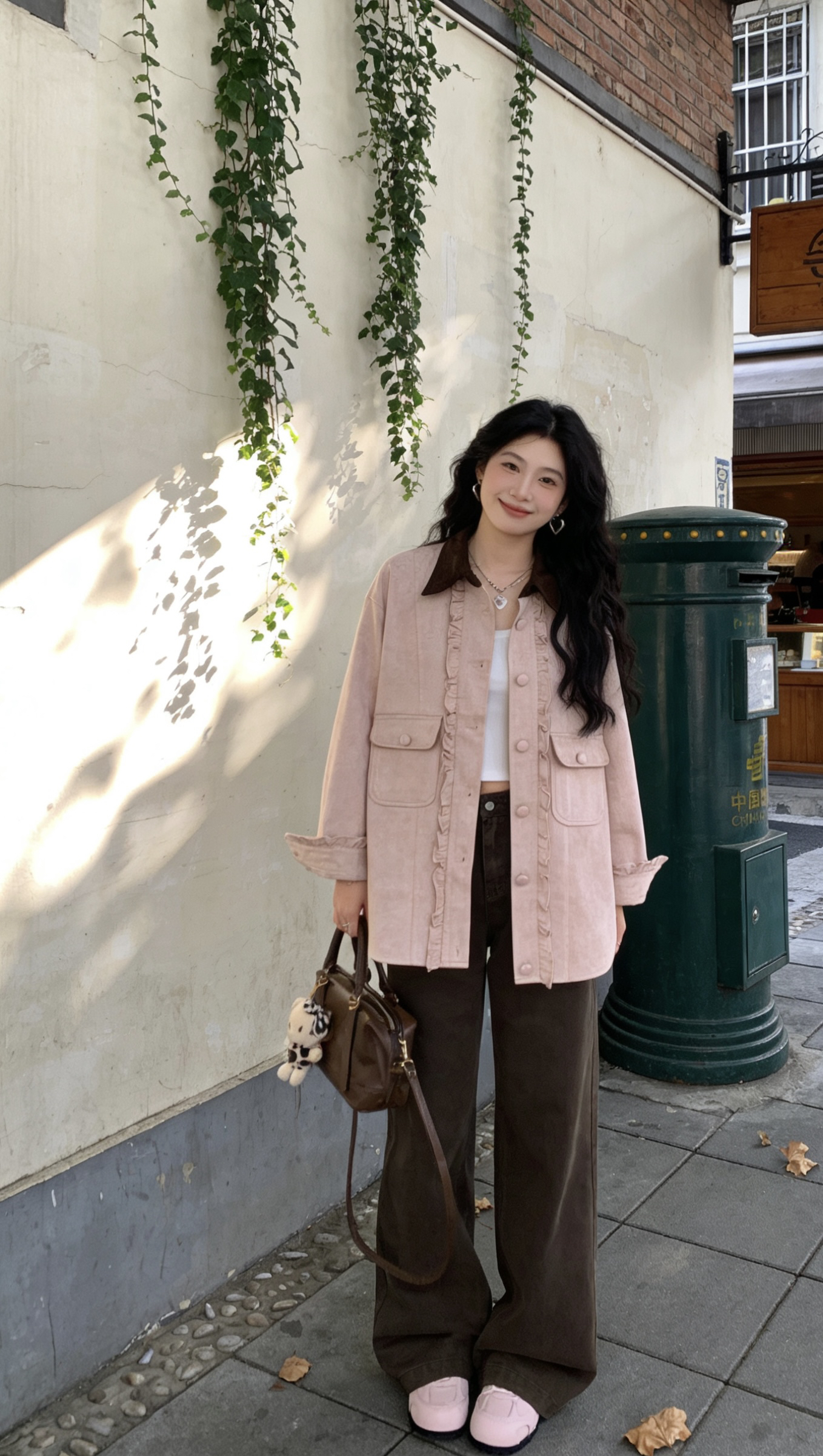 谁懂啊!这套粉棕撞色真的把早春氛围感焊在身上了✨ 温柔浅粉外套+复古棕阔腿裤,软乎乎又自带慵懒感,走在老城区巷弄里,连阳光都变得温柔起来~ • 外套:浅粉木耳边拼接,灯芯绒质感超细腻,宽松版型藏肉又显随性,领口深棕撞色直接把复古感拉满! • 裤子:深棕直筒阔腿,垂感绝了!显腿长又遮胯,小个子也能轻松驾驭~ • 配饰:同色系波士顿包+爱心银饰,甜酷平衡得刚刚好,细节控狂喜! • 鞋子:软fu...