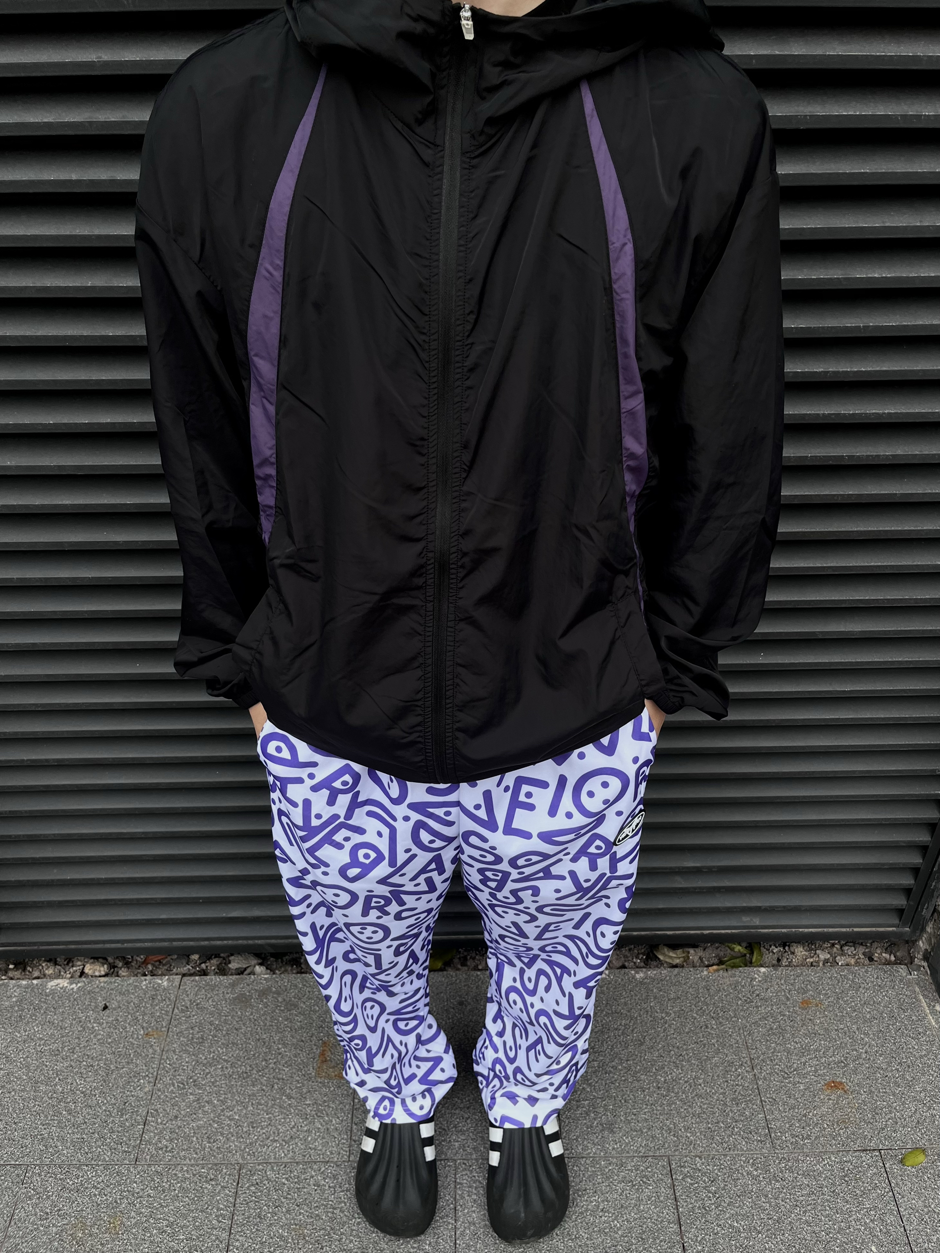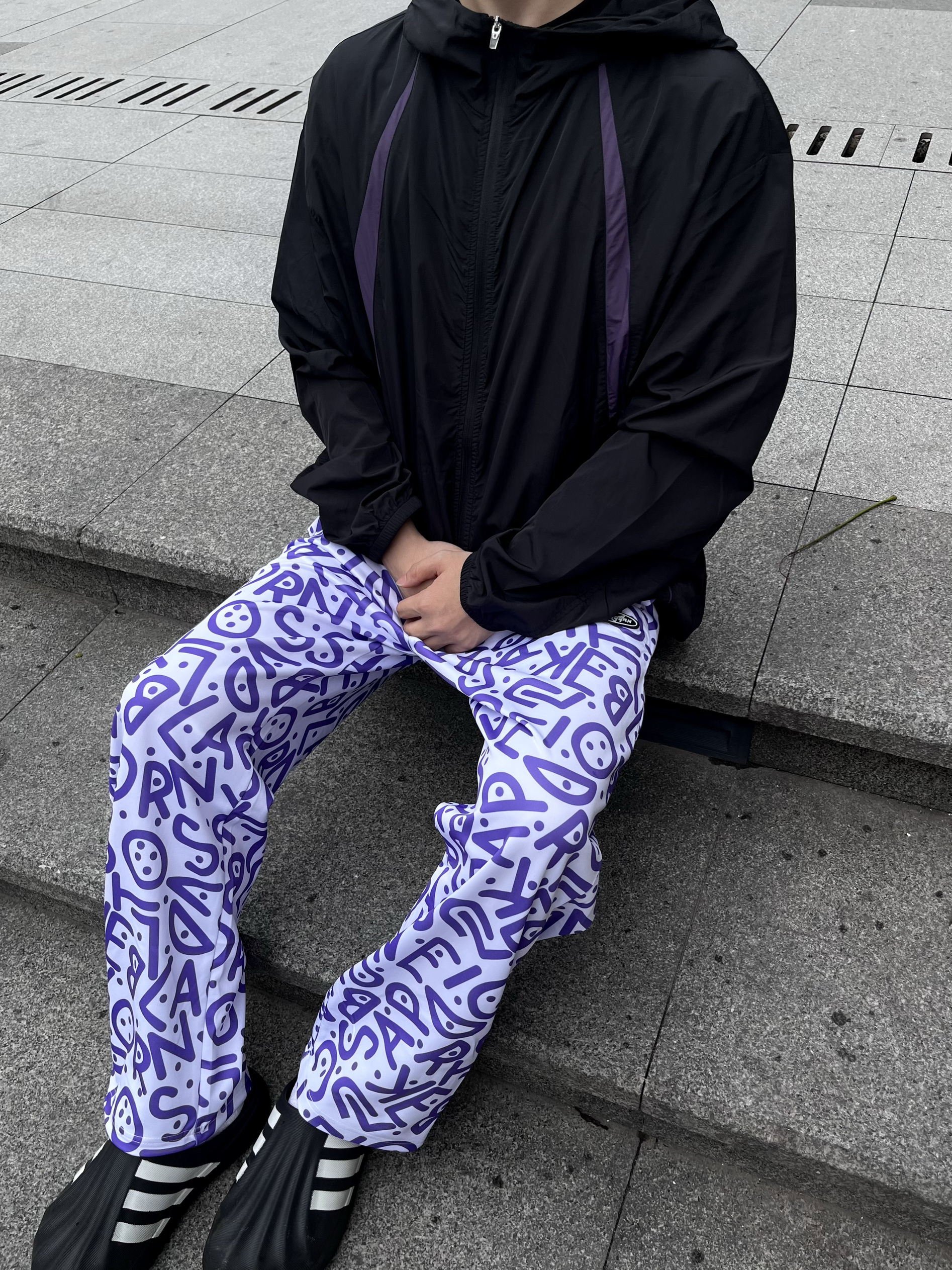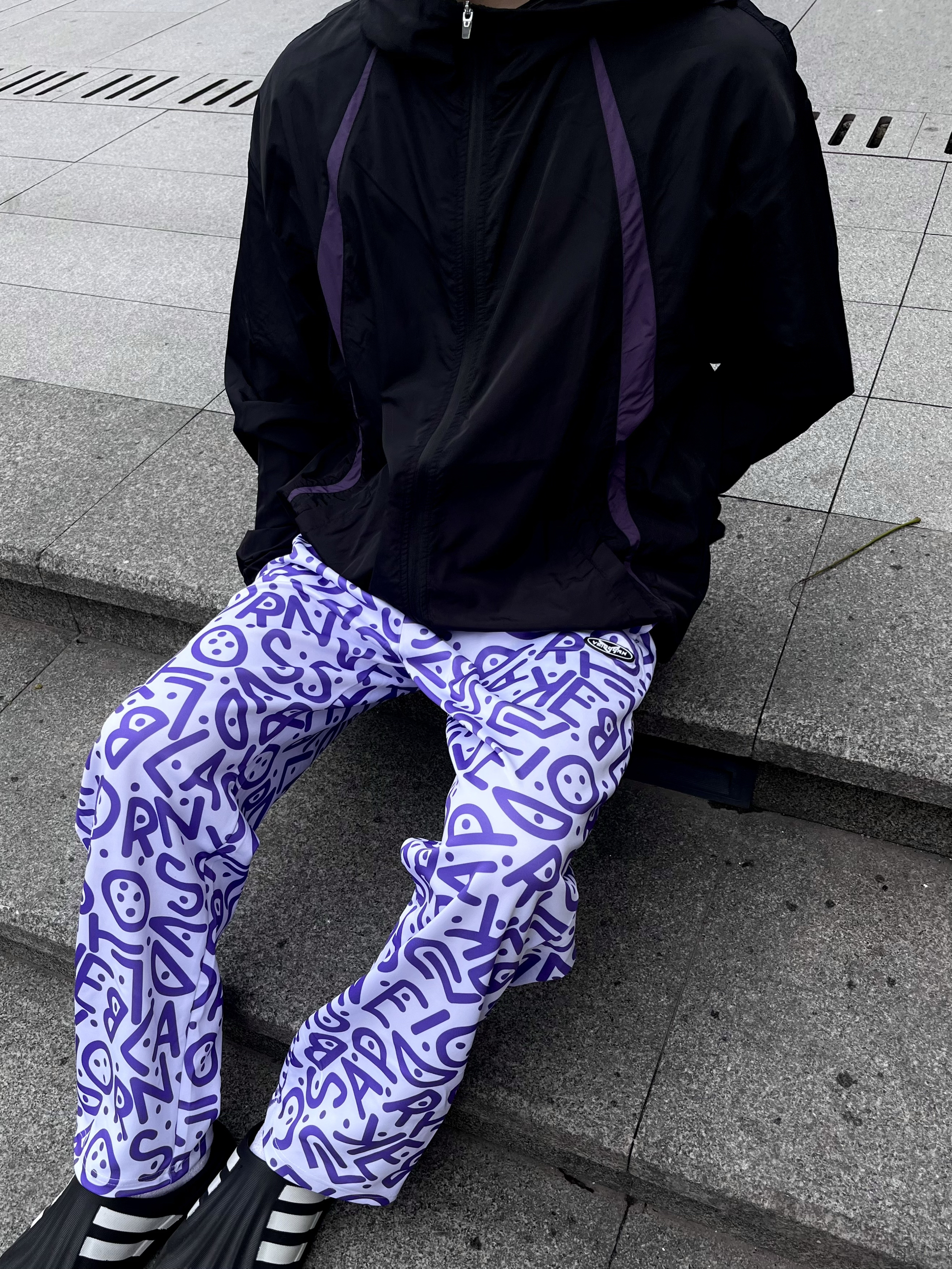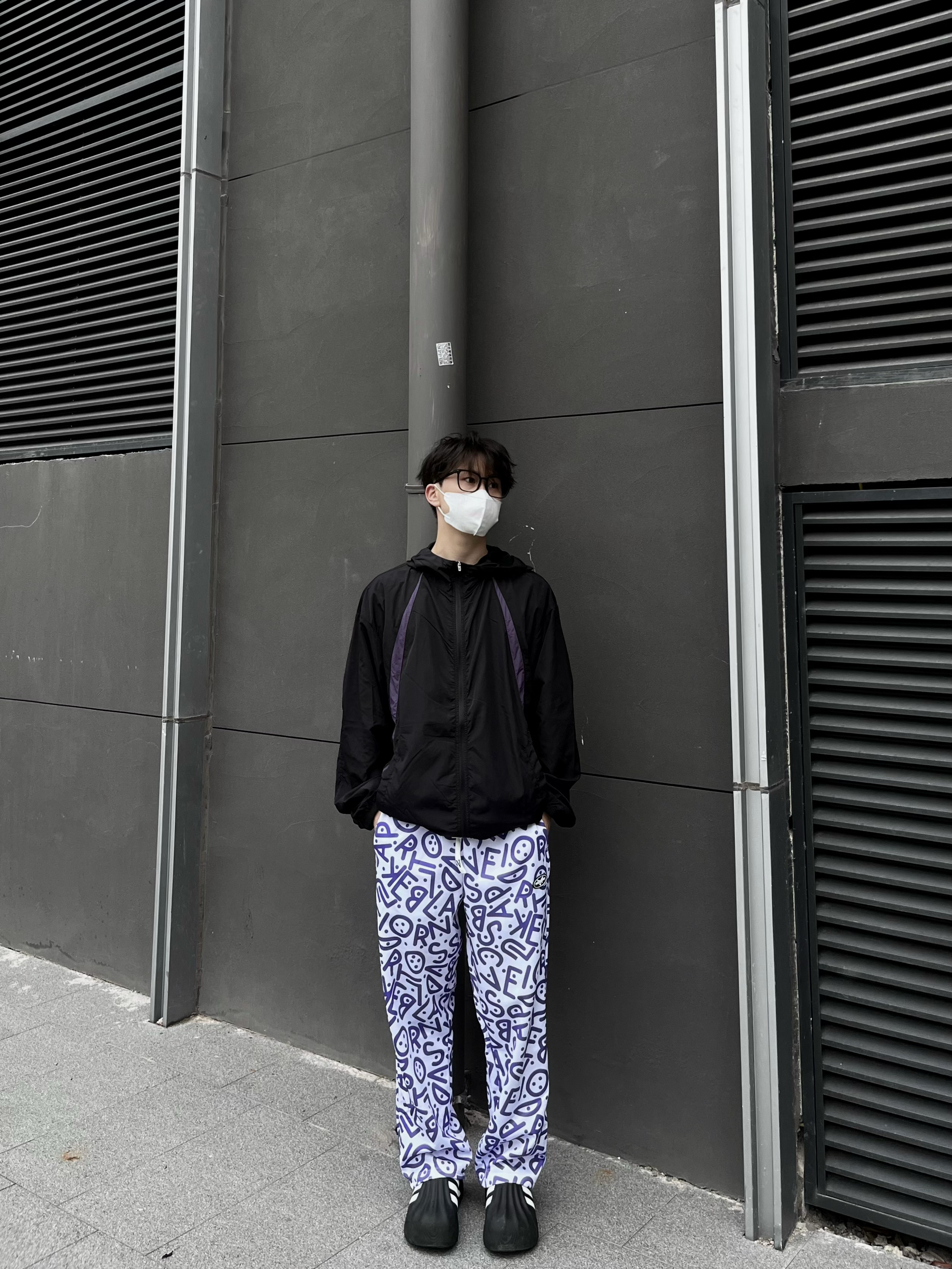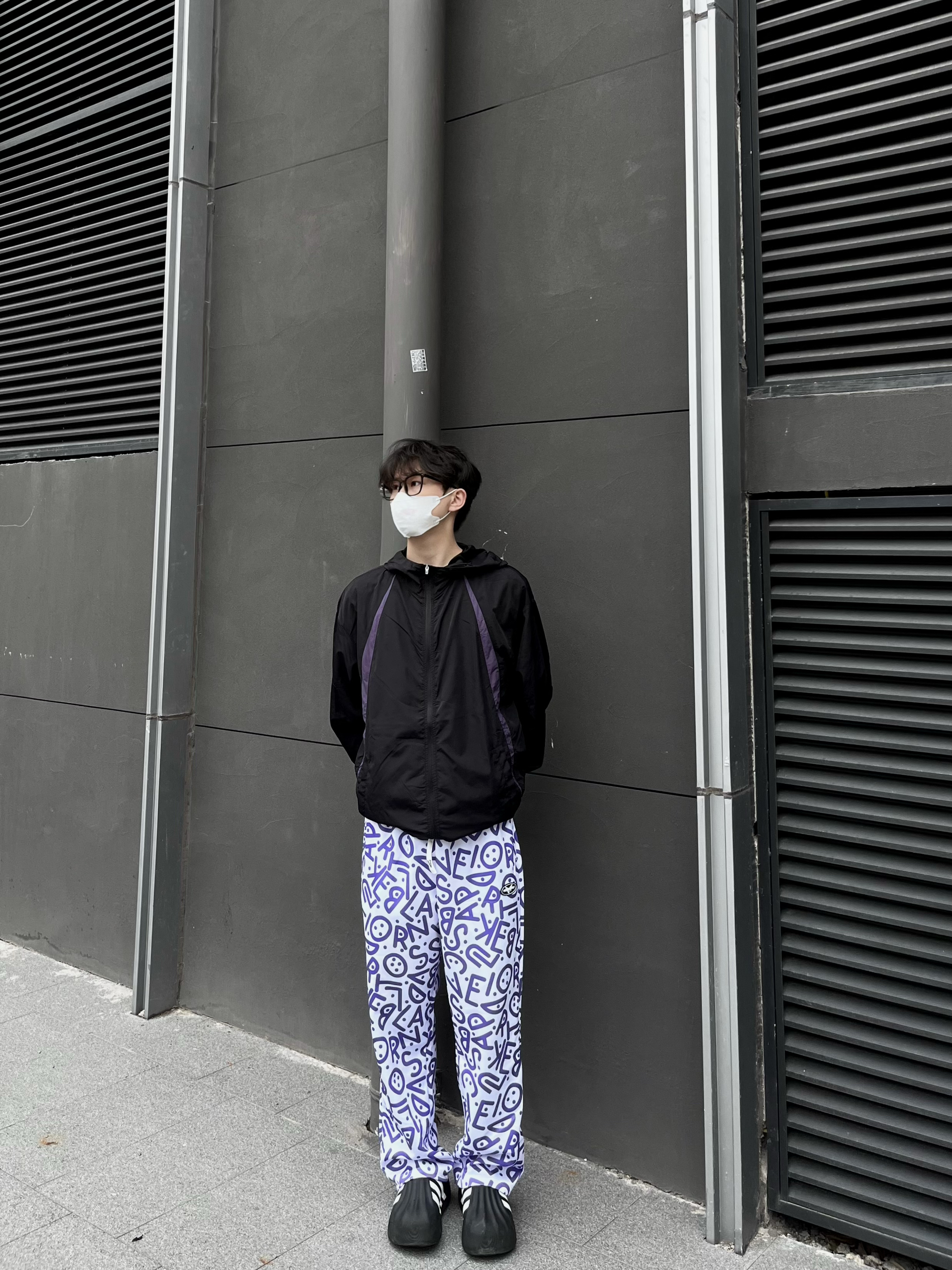彩色运动户外时髦派穿搭分享,主打防晒透气+趣味街头感,完美适配春夏户外出行和日常citywalk。 • 外套:黑紫拼色连帽防晒冲锋衣,轻薄透气面料自带UPF防晒力,撞色线条设计强化机能氛围,连帽设计还能额外遮阳,户外防护和潮流感拉满。 • 下装:白紫涂鸦阔腿运动裤,满印趣味字母+笑脸图案,宽松垂坠版型活动自如,亲肤面料应对运动出汗也不闷,和外套的紫色元素形成呼应。 • 鞋子:黑色条纹包头拖,...