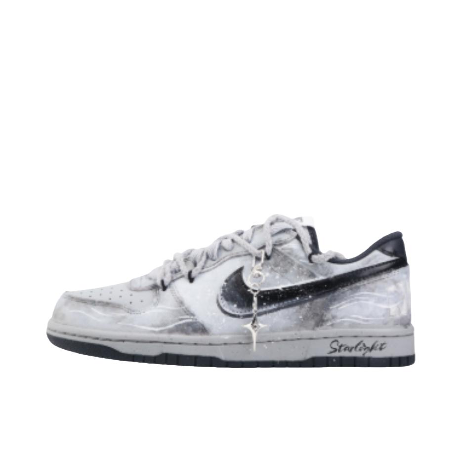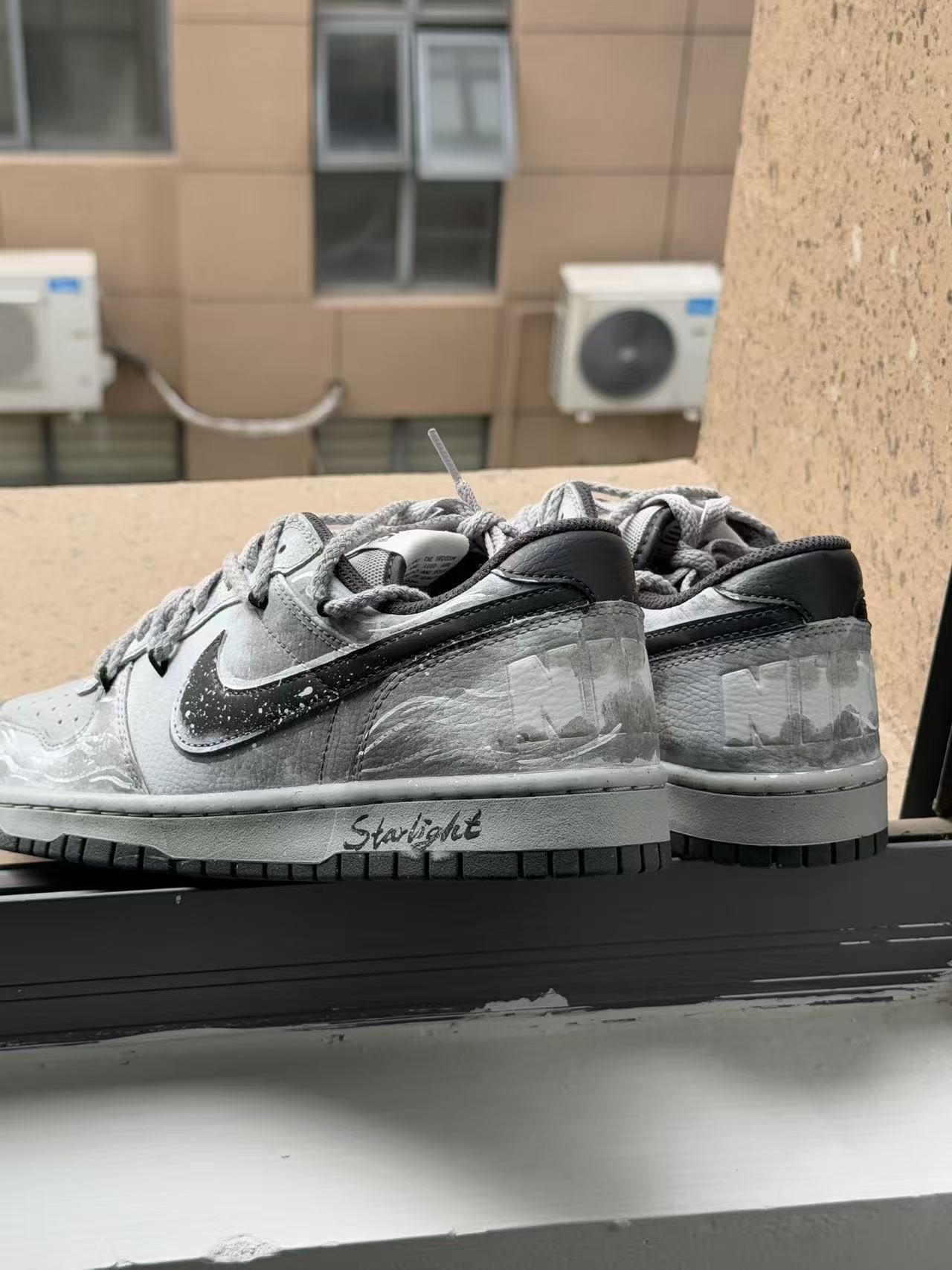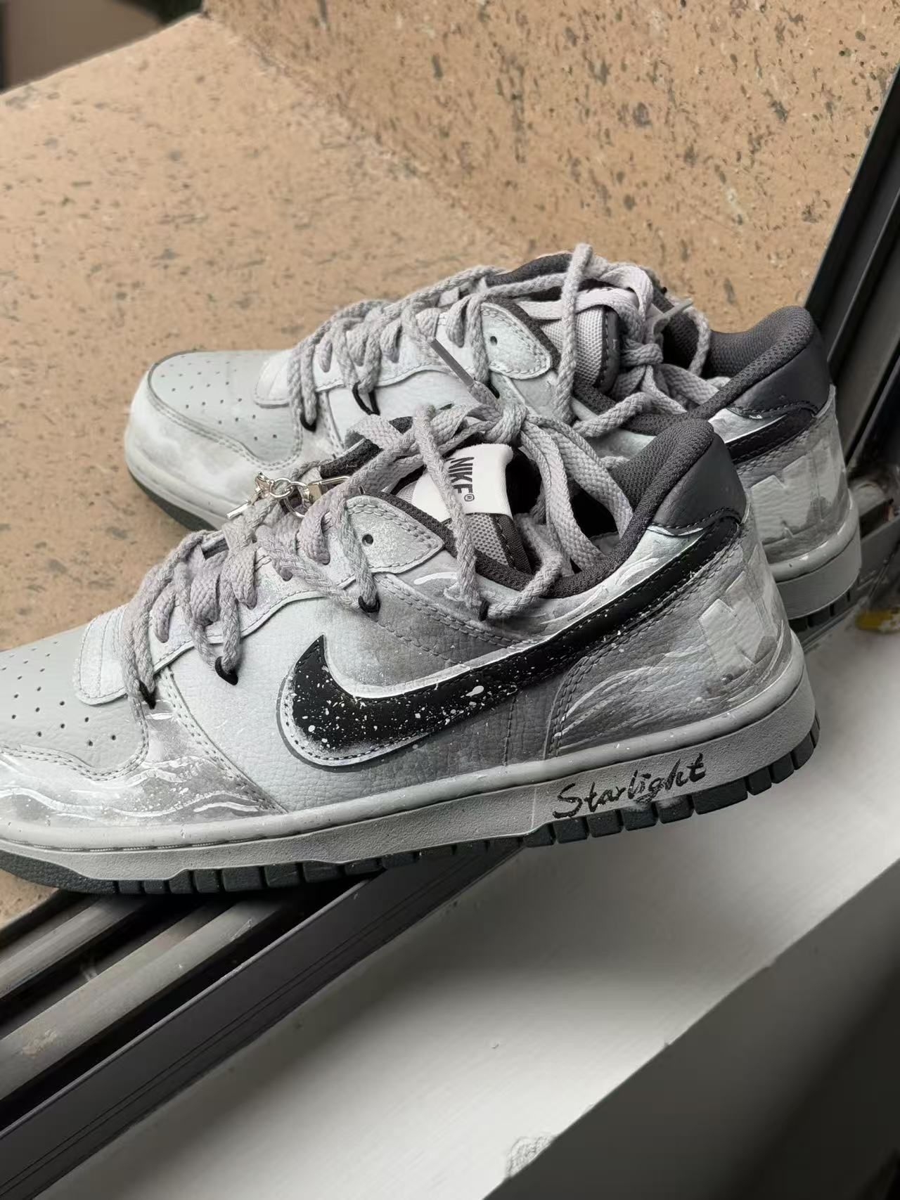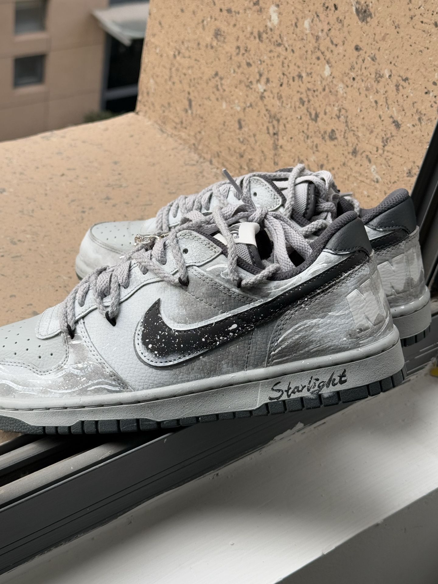 灰黑泼墨Dunk,为了颜值妥协了多少?|||这双是我自己改的Dunk,灰黑泼墨+“Starlight”手写体,乍看有点小众艺术感🎨。 真实体验: • 上脚确实吸睛,搭牛仔裤、运动裤都不违和,拍照很出片[惊喜_blue] • 但定制的泼墨层有点硬,刚穿时前掌有点压脚,需要多踩几天才软[坏笑_blue] • 粗鞋带好看但难系,每次都要花点时间调整[祈祷_blue] • 皮面做旧后,脏了比较明显,擦起来...