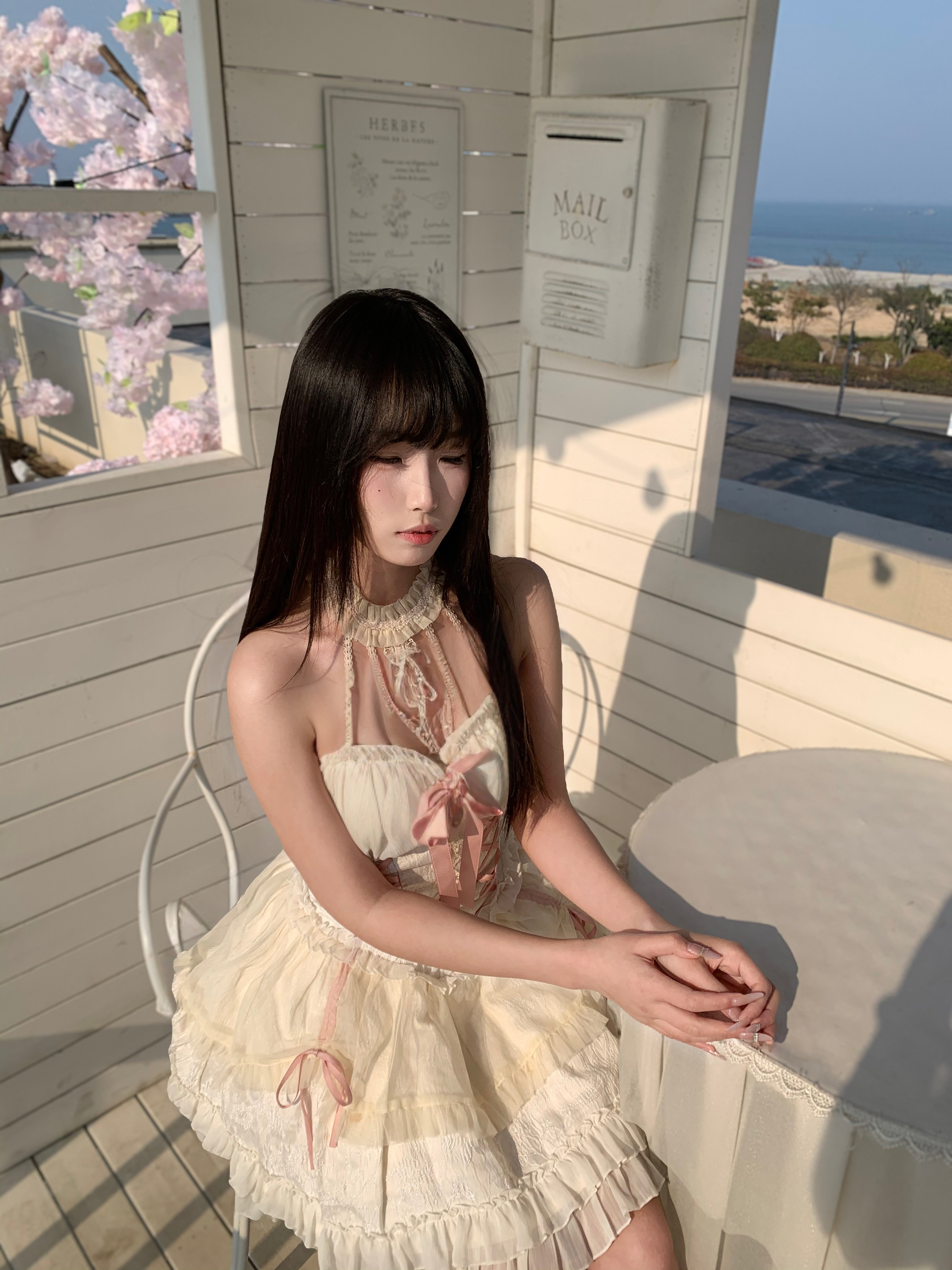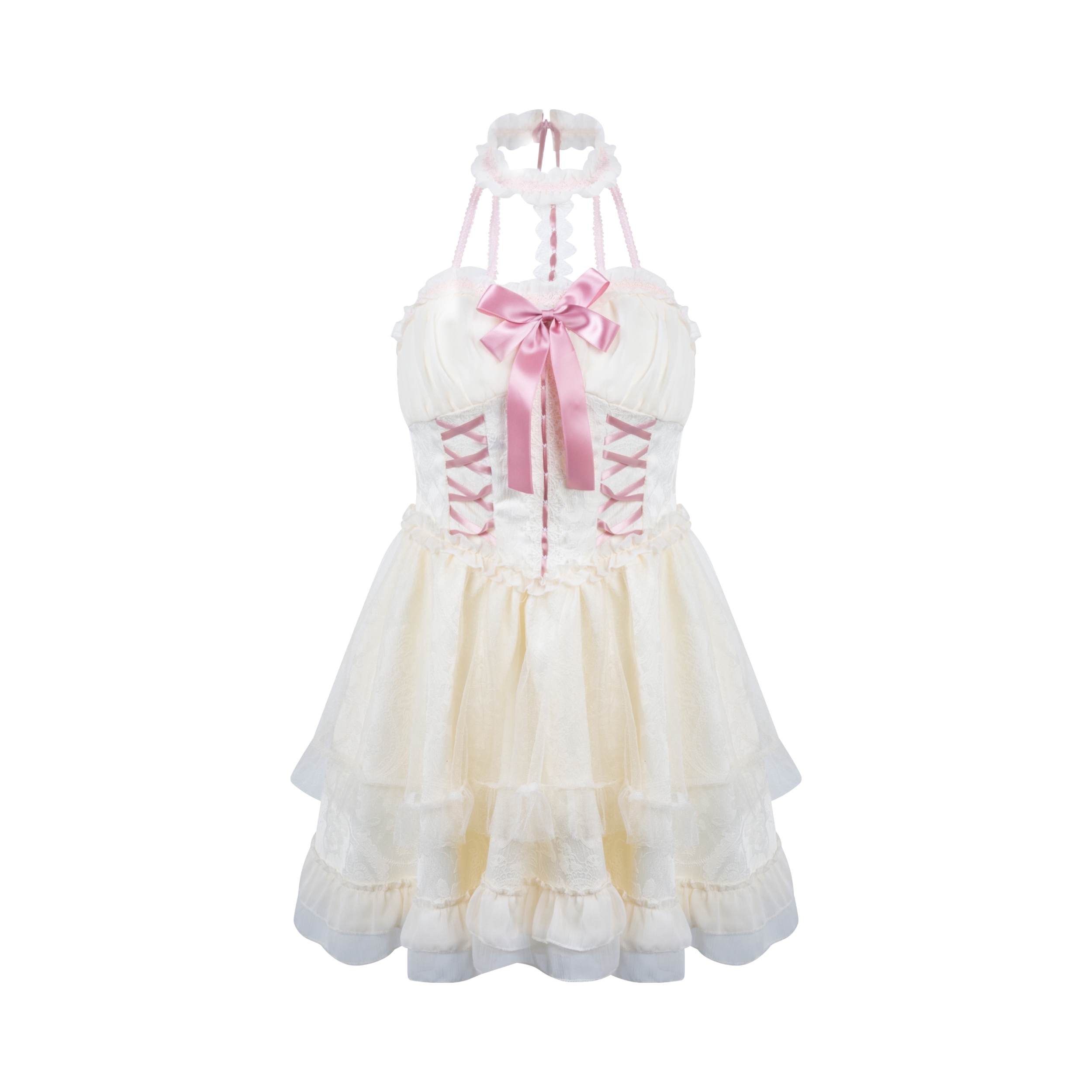 挂脖蕾丝束腰蛋糕裙👗 就是图里这件奶油杏色+粉色绑带的小裙子,挂脖设计露肩又显瘦,层层蛋糕裙摆+蕾丝花边,甜妹感拉满,日常或拍照都很出片。 • 同色系蕾丝颈饰 搭配裙子的小十字架蕾丝颈饰,精致又有洛丽塔那味儿,能让整体造型更有层次感。 💄 妆容&发型 • 空气刘海+黑长直 这种齐刘海黑长直发型,自带清纯感,和甜妹裙装绝配,还能修饰脸型。 清透伪素颜妆 底妆干净通透,唇釉选淡粉或奶茶色,眼妆清淡,突...