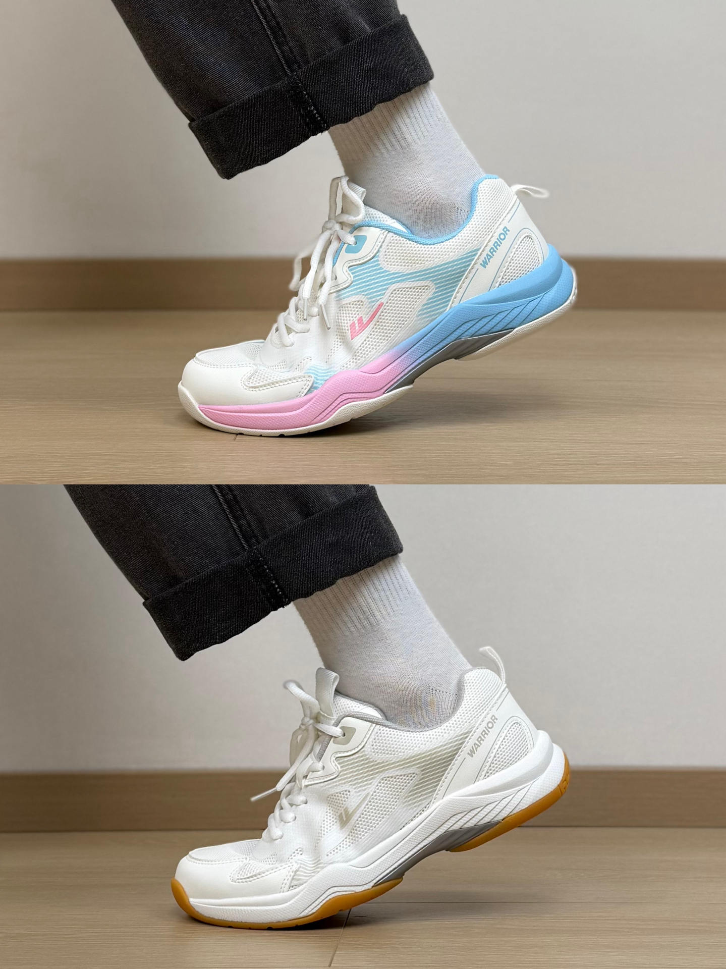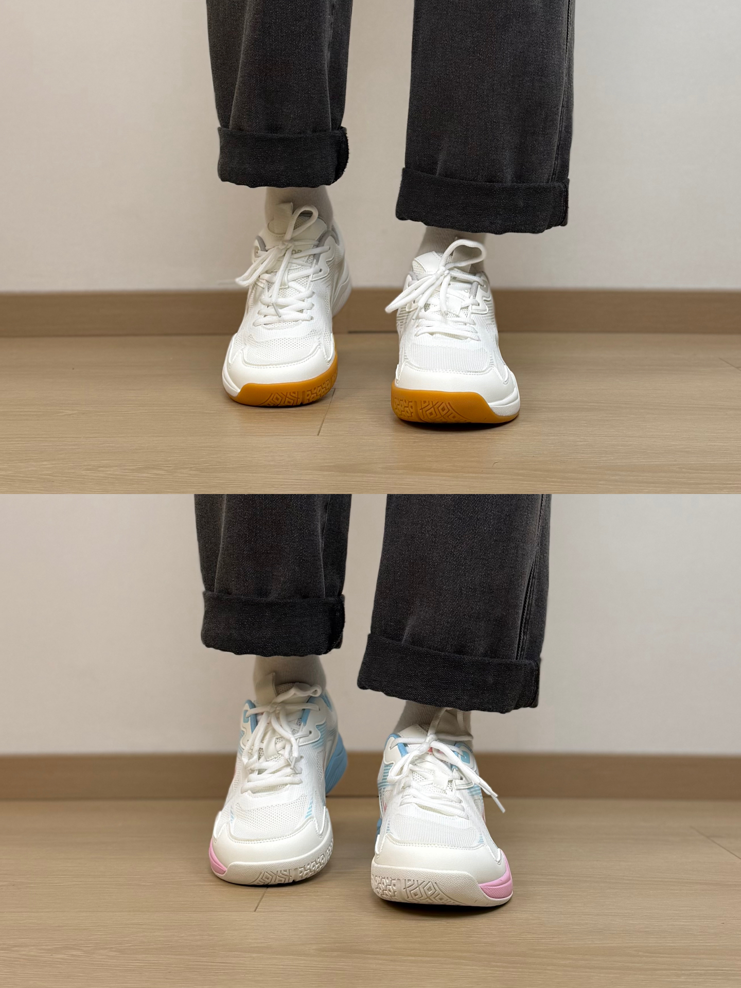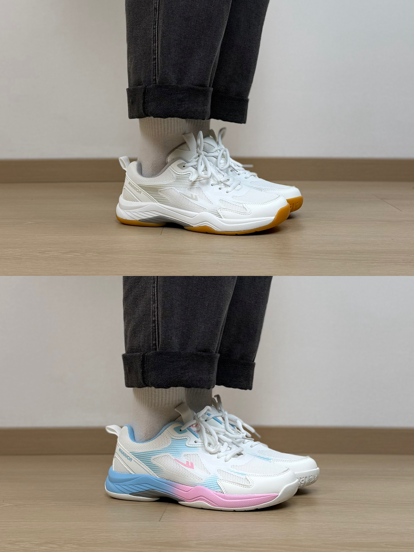 一双是浅蓝 + 粉的渐变撞色 自带清爽少年感 像把春日海风踩在脚下 阳光感拉满 一双是干净利落的纯白系 低调耐看永不过时 不管是牛仔裤还是休闲运动裤都能搭 网面透气不闷脚,防滑大底抓地力拉满 打球时变向、起跳都稳得一批 颜值和实力双在线! 尺码我觉得正常 不偏码的~ #我的鞋柜春上新 #单鞋拿捏春日氛围感 #踏春出片穿这双 #此人鞋商极高 #超高颜值羽毛球鞋
