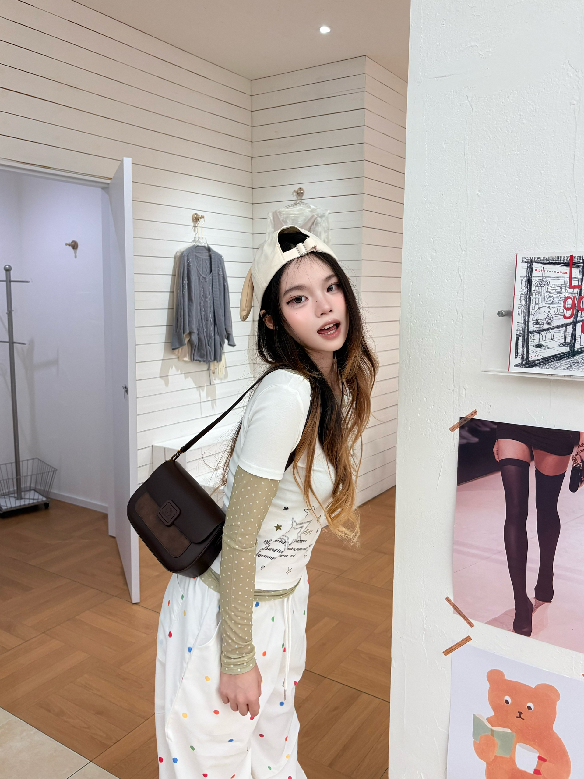 我今天这套是韩系软妹松弛感🍼 上衣选了假两件波点拼接,叠穿感拉满又不会显臃肿,奶fufu的色系超显嫩~ 重点夸夸这个深棕包包 👜 麂皮拼接+复古扣,和整体奶油调穿搭完美适配,通勤/约会都能背✨ 我的整体思路就是:💡 浅色系打底+同色系配饰点睛,用波点元素增加少女感,再用深棕包包搭配 温柔又不腻~