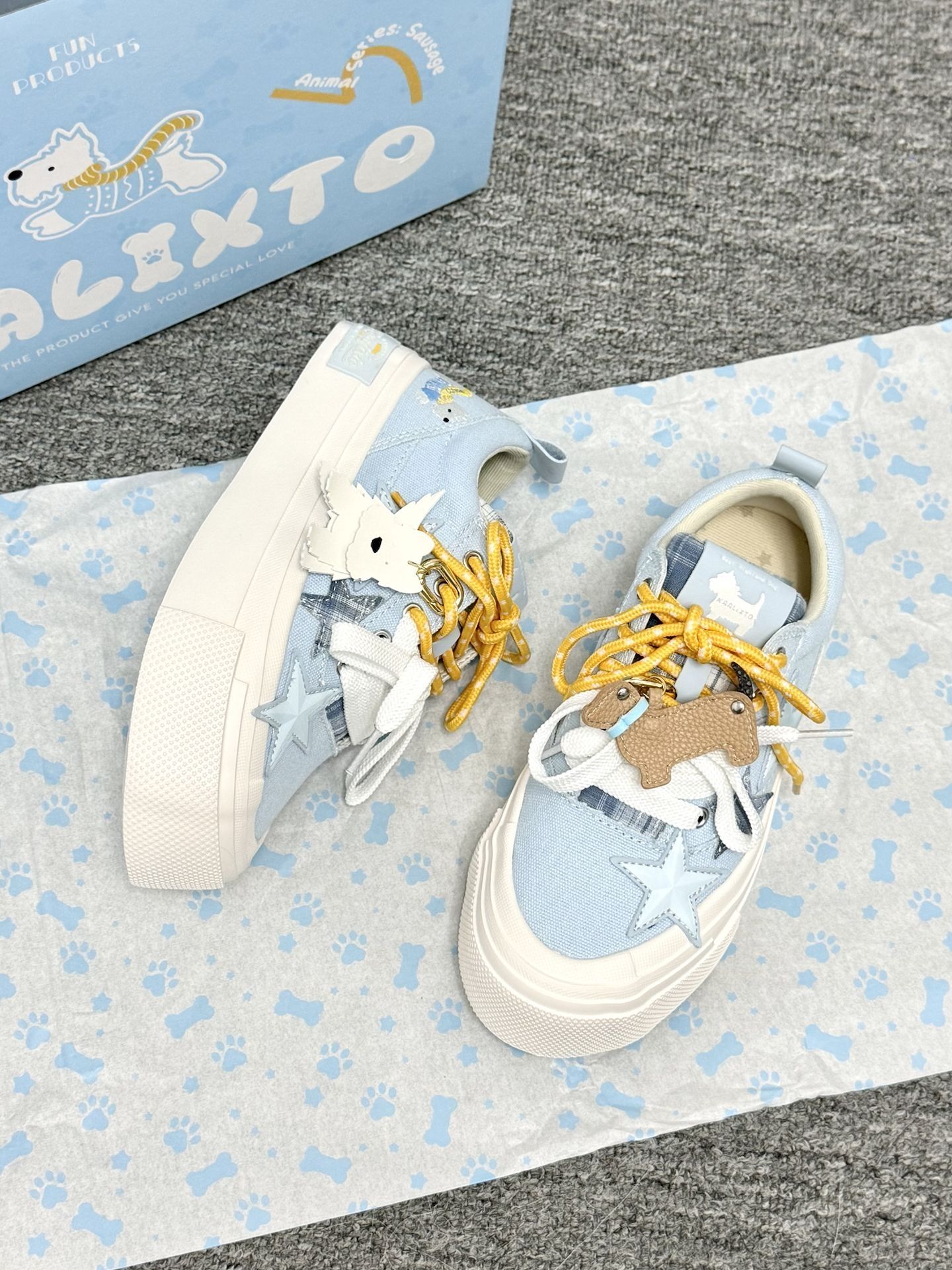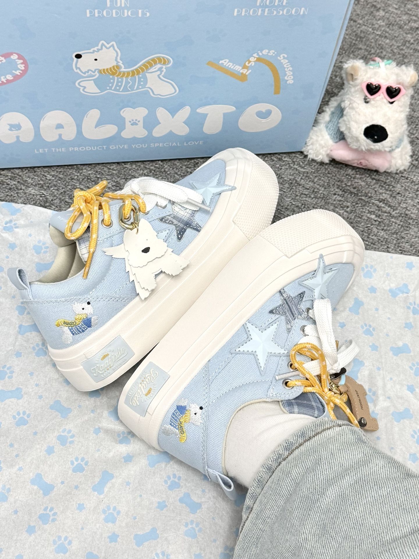 谁懂啊!这双KAALIXTO西高地小狗鞋直接把可爱焊在脚上了🥹 奶fufu的浅蓝配色+立体星星装饰,双层鞋带设计自带层次感,鞋舌上的小狗轮廓和挂饰细节太戳人了! 厚底还能悄悄增高,配牛仔裤、百褶裙都超元气,上脚软乎乎的完全不磨脚~ 鞋盒都是小狗屋造型,拆箱仪式感拉满,自留或送闺蜜都超合适!