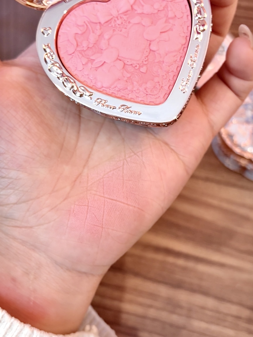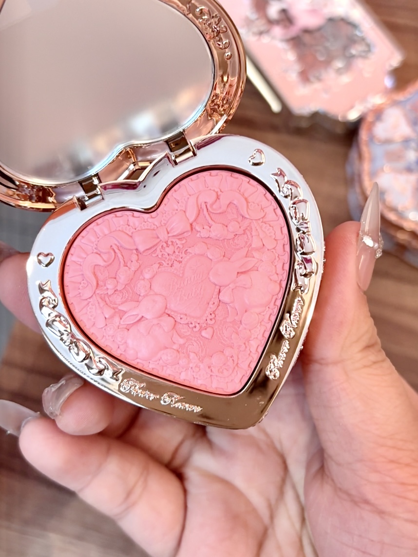 花知晓新品邦尼花园腮红好美丽啊 爱心外壳+浮雕兔兔花纹,颜值直接戳中少女心! 粉调奶杏色上脸温柔又元气,像天生的好气色,黄皮也能轻松驾驭~ 粉质细腻不飞粉,轻轻扫在苹果肌上,氛围感瞬间拉满,约会涂它超甜!