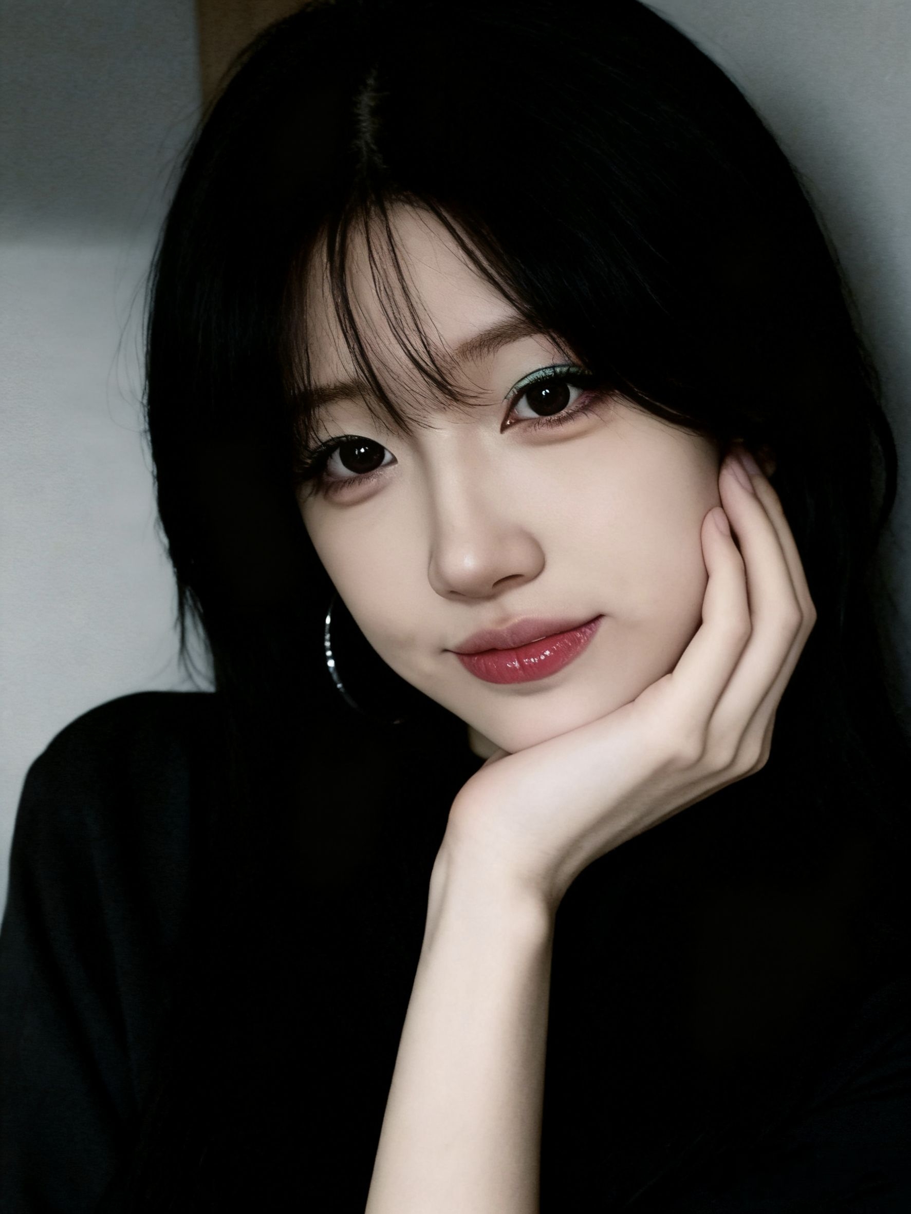 豹纹露肩衫裹着野性,抹茶绿闪钻美甲是藏在指尖的诱惑。 碎钻发夹与钻戒在暗处反光,半遮脸的姿势里,藏着欲擒故纵的小心机。 温柔与野性碰撞,连浅绿背景都成了烘托这场暧昧的幕布。