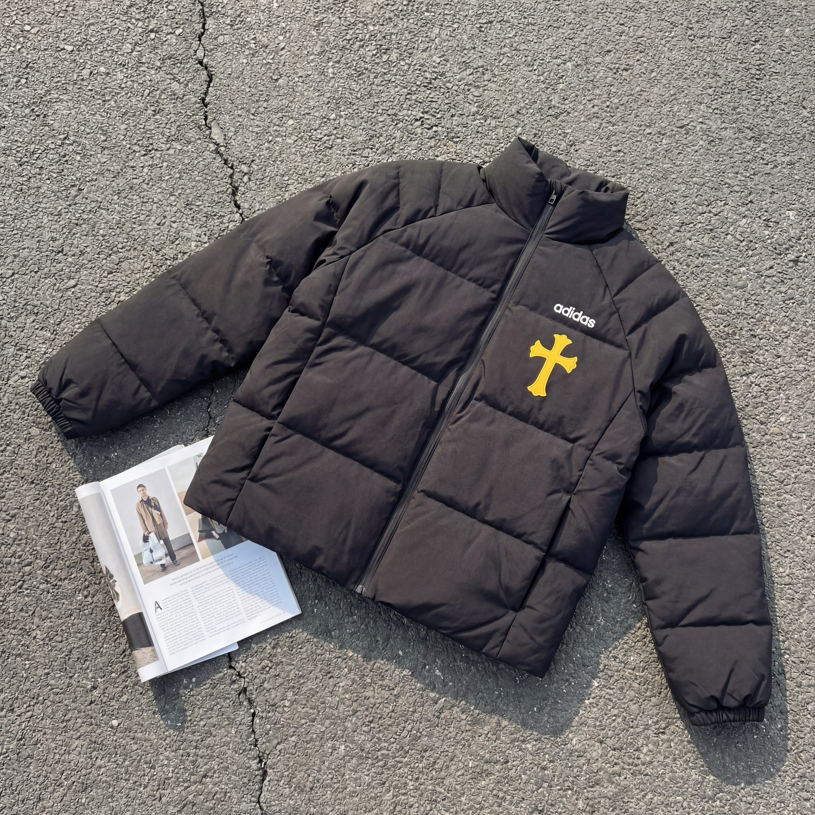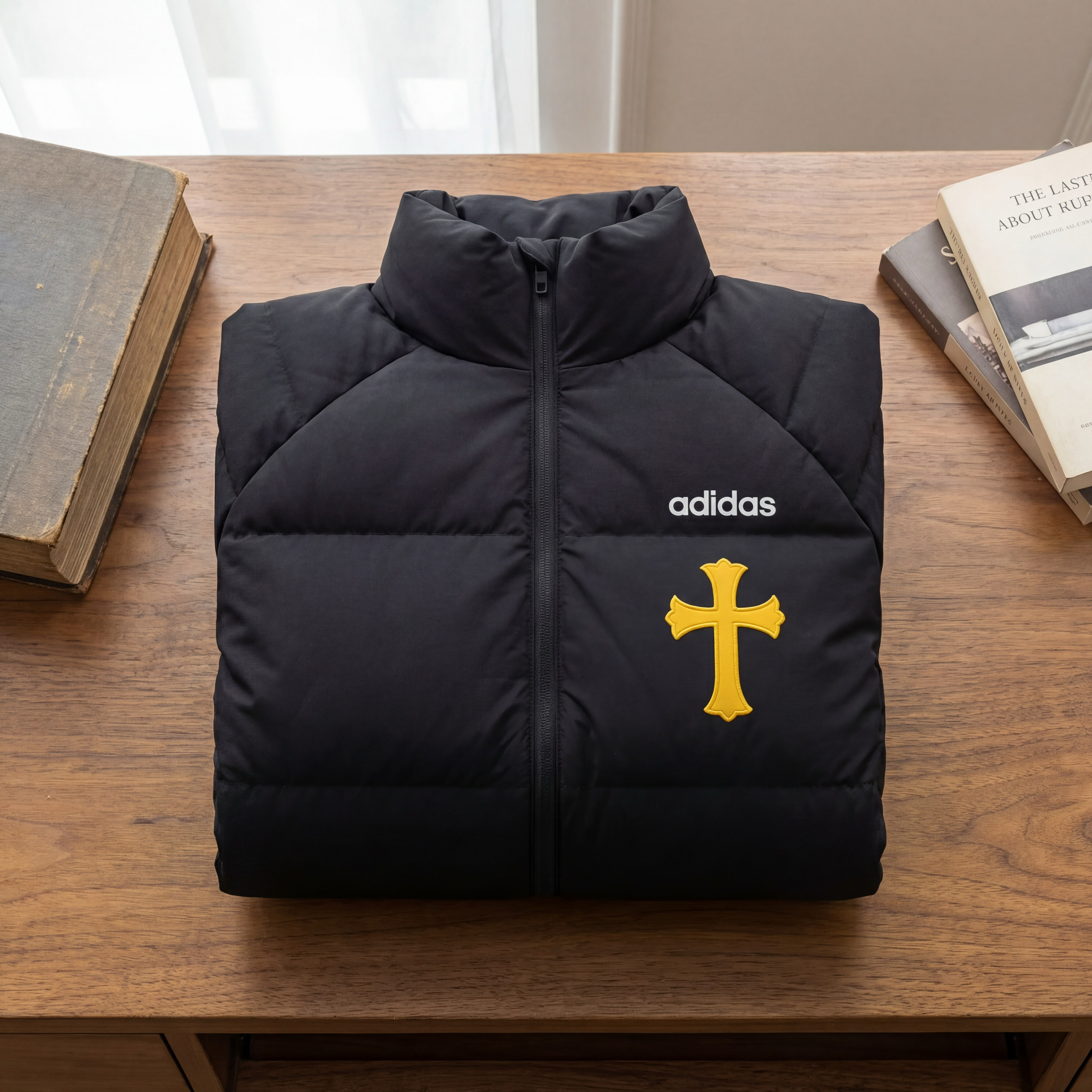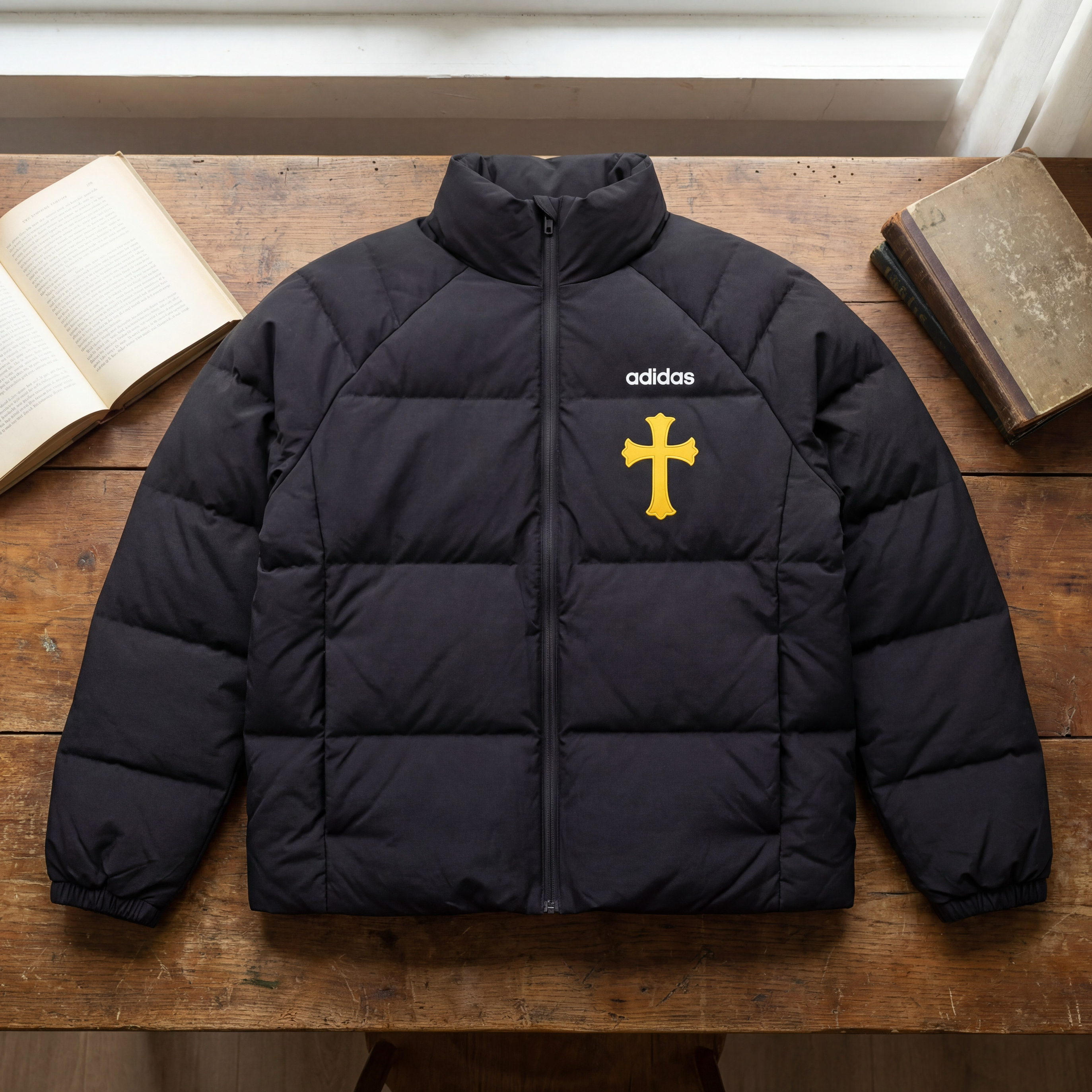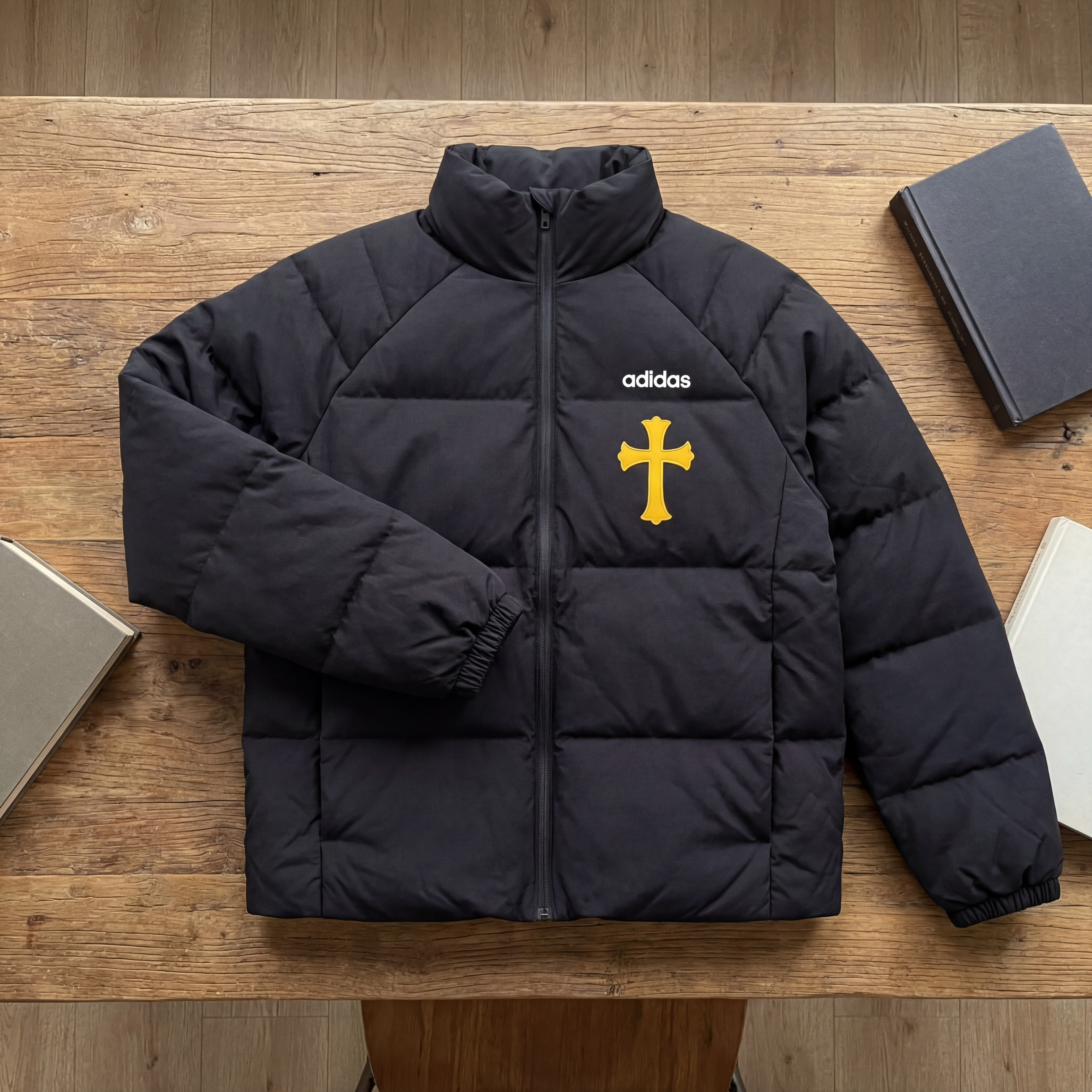 阿迪黑色立领羽绒服,像冬日里沉默的暗涌,而胸前那枚金色十字架,是悄然点亮的信仰。 Adidas的剪裁从不妥协,利落的线条裹住温暖,也裹住你的个性。 男女同款,它可以是早八通勤的铠甲,是周末逛街的底气,是和朋友走在雪地里,回头时那抹最亮的光。
