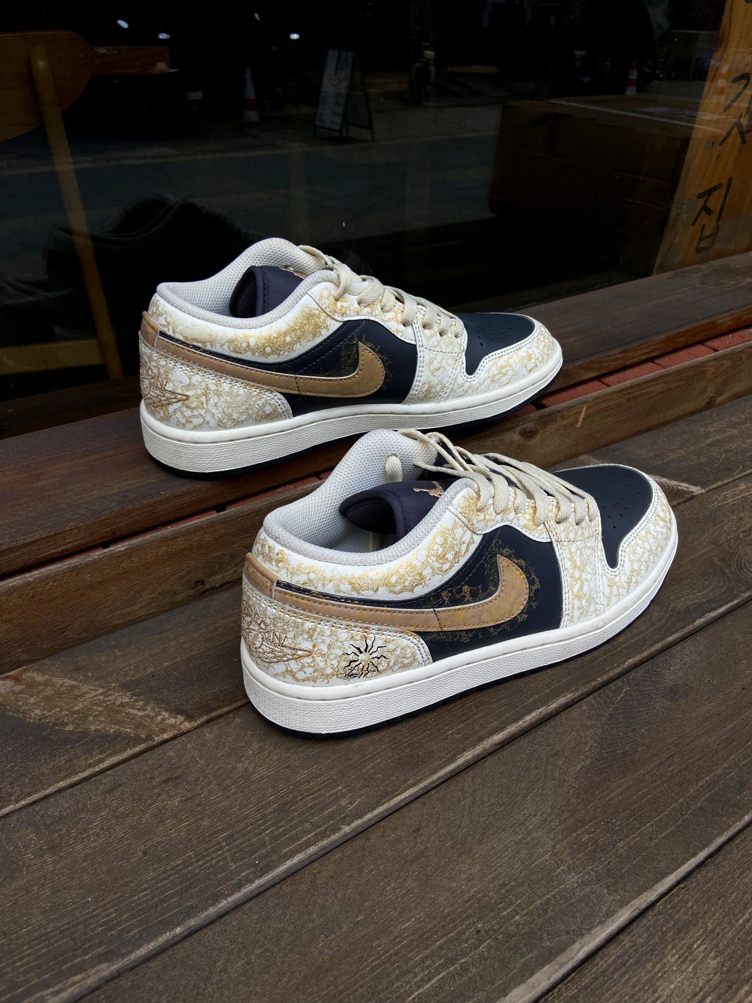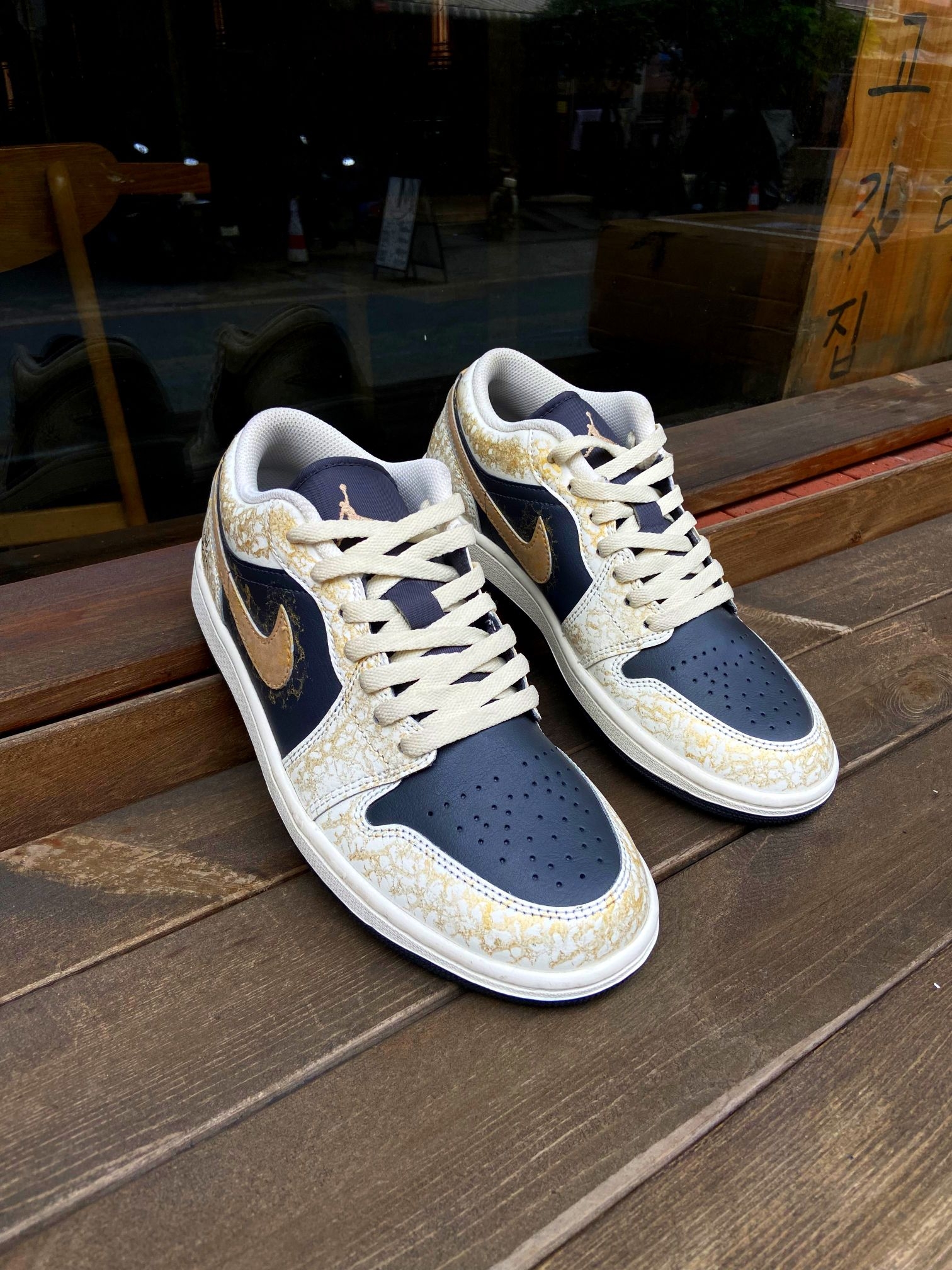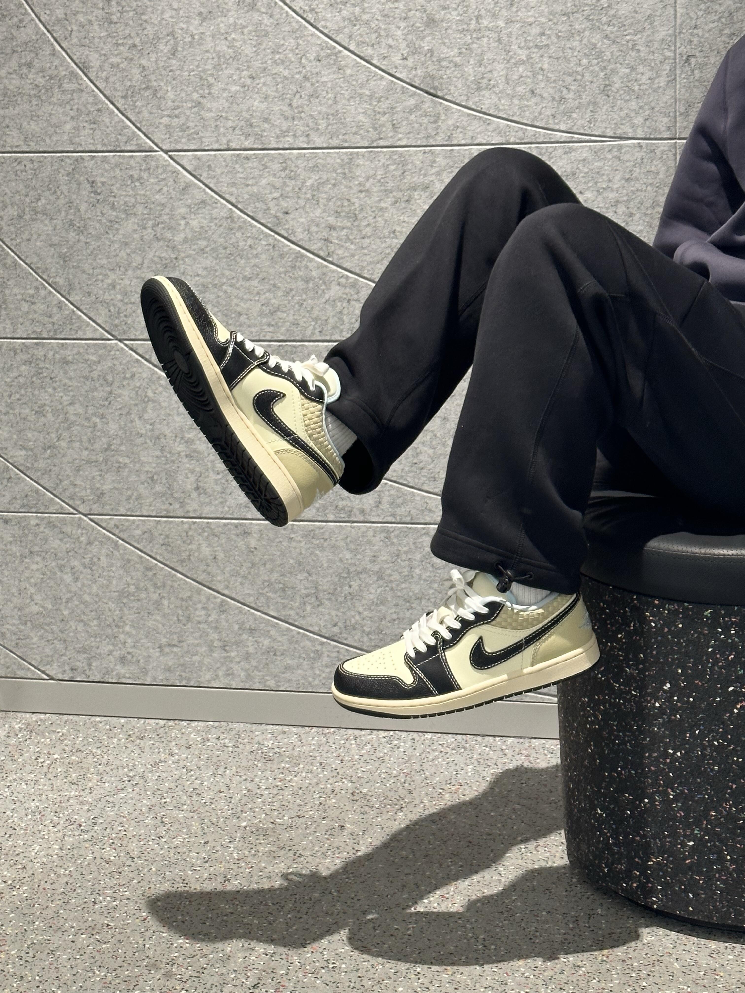 这双鞋的配色真的太有质感了!藏蓝+米白+金箔裂纹的组合,自带复古轻奢的氛围感,低调又高级,不管是配牛仔裤、工装裤还是休闲裙都超适配,轻松拿捏氛围感穿搭。 鞋面是细腻皮革材质,质感扎实又耐穿,金箔裂纹的做旧纹理细节拉满,后跟还有太阳和飞人刺绣,小众又有辨识度。 AJ1 Low经典鞋型,上脚包裹感刚好,不磨脚也不闷脚,鞋底缓震和抓地力都在线,日常通勤、逛街暴走都很稳。而且这个配色越看越耐看,脏...