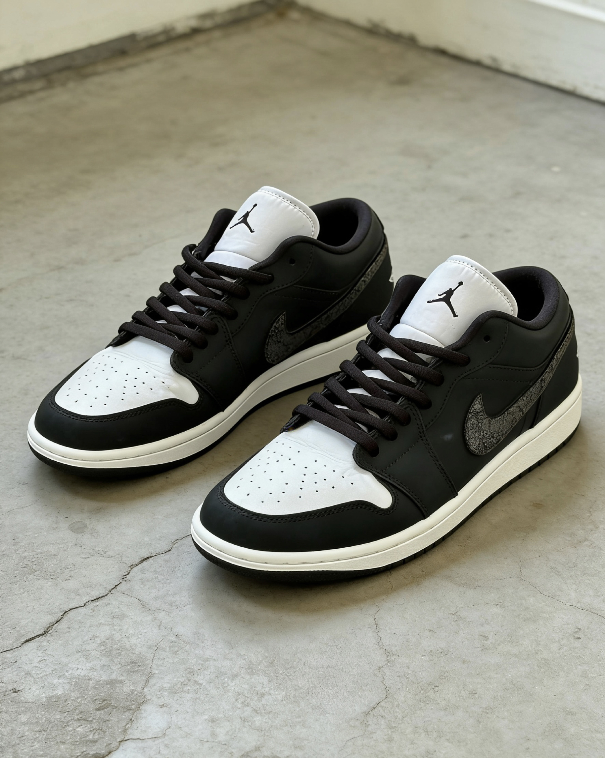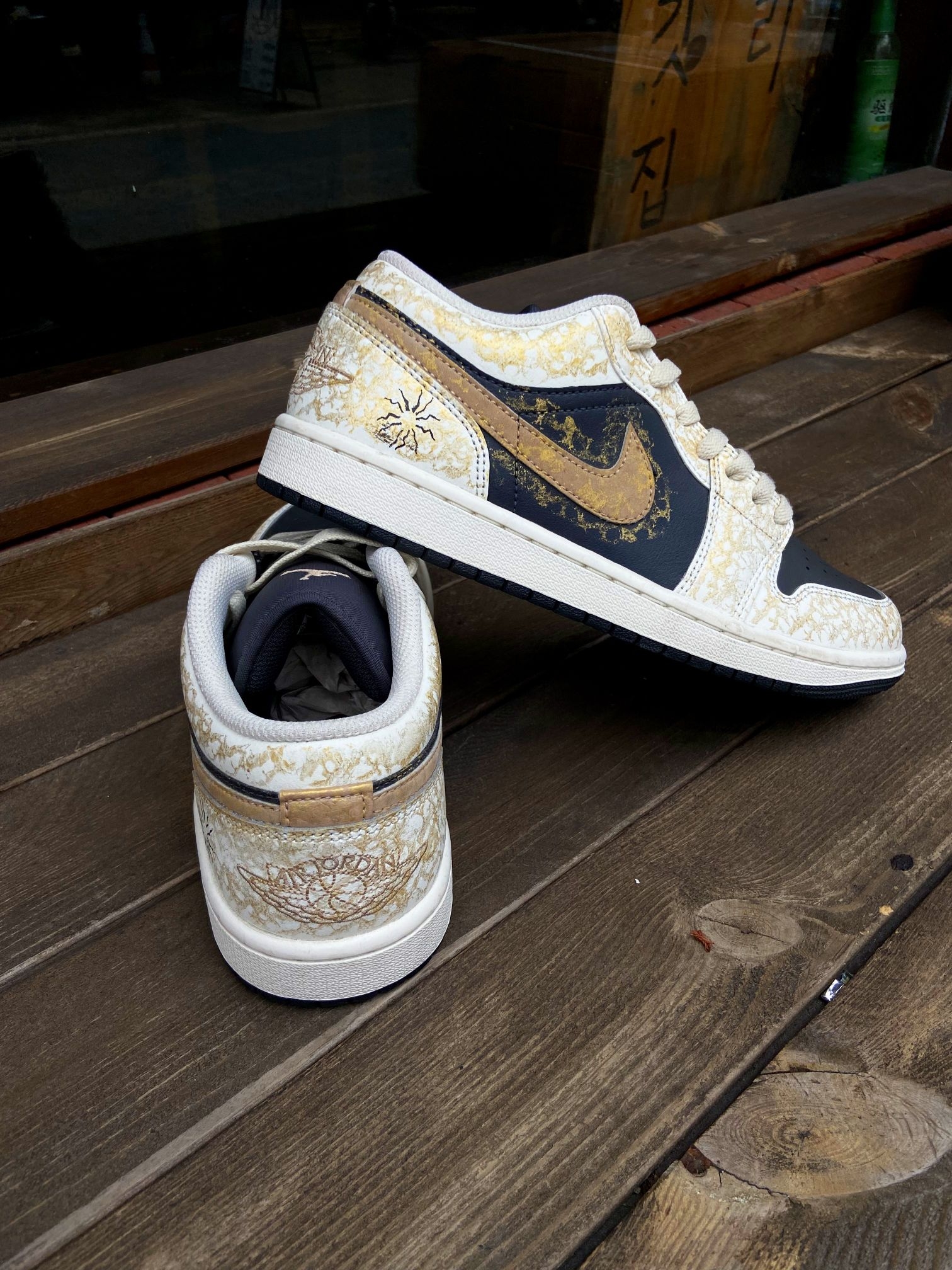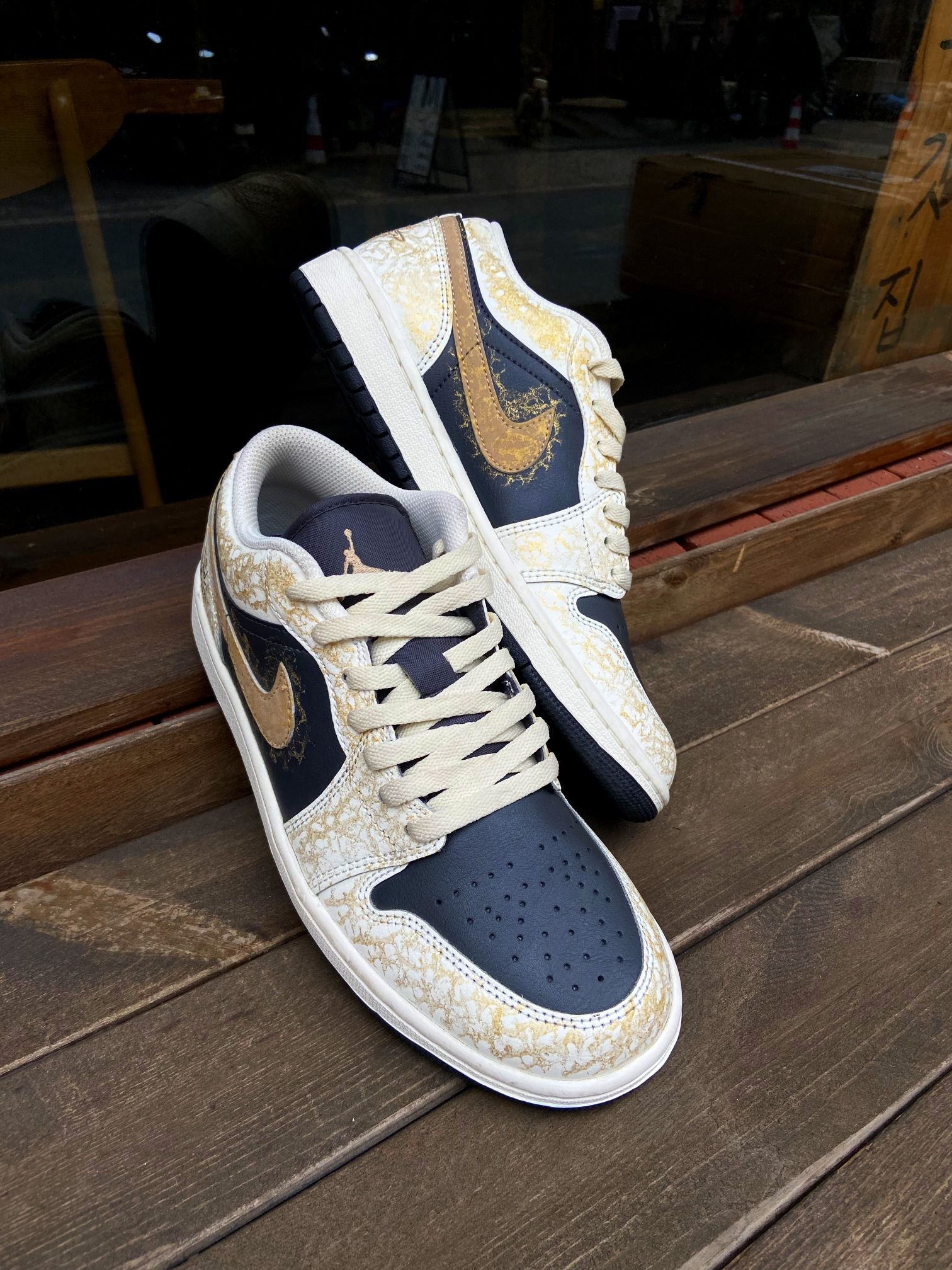 这双鞋的配色真的太有质感了!藏蓝+米白+金箔裂纹的组合,自带复古轻奢的氛围感,低调又高级,不管是配牛仔裤、工装裤还是休闲裙都超适配,轻松拿捏氛围感穿搭。 鞋面是细腻皮革材质,质感扎实又耐穿,金箔裂纹的做旧纹理细节拉满,后跟还有太阳和飞人刺绣,小众又有辨识度。 AJ1 Low经典鞋型,上脚包裹感刚好,不磨脚也不闷脚,鞋底缓震和抓地力都在线,日常通勤、逛街暴走都很稳。而且这个配色越看越耐看,脏...