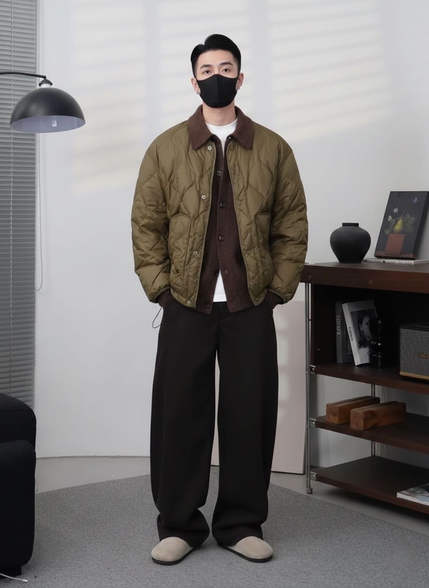 刚降温的午后,房间里还留着一点阳光的余温☁️ 军绿色绗缝外套裹着软乎乎的暖意,灯芯绒翻领蹭着脖子,有点绒绒的触感🧶 深棕针织开衫叠在里面,针脚密实,风钻不进来。 黑色阔腿裤垂感刚好,走路时裤脚扫过脚踝,带着一点慵懒的弧度👖 踩上浅灰穆勒拖,整个人都陷进柔软里,连呼吸都慢了下来。 百叶窗的光影在墙上晃着,安静得能听见自己的脚步声。