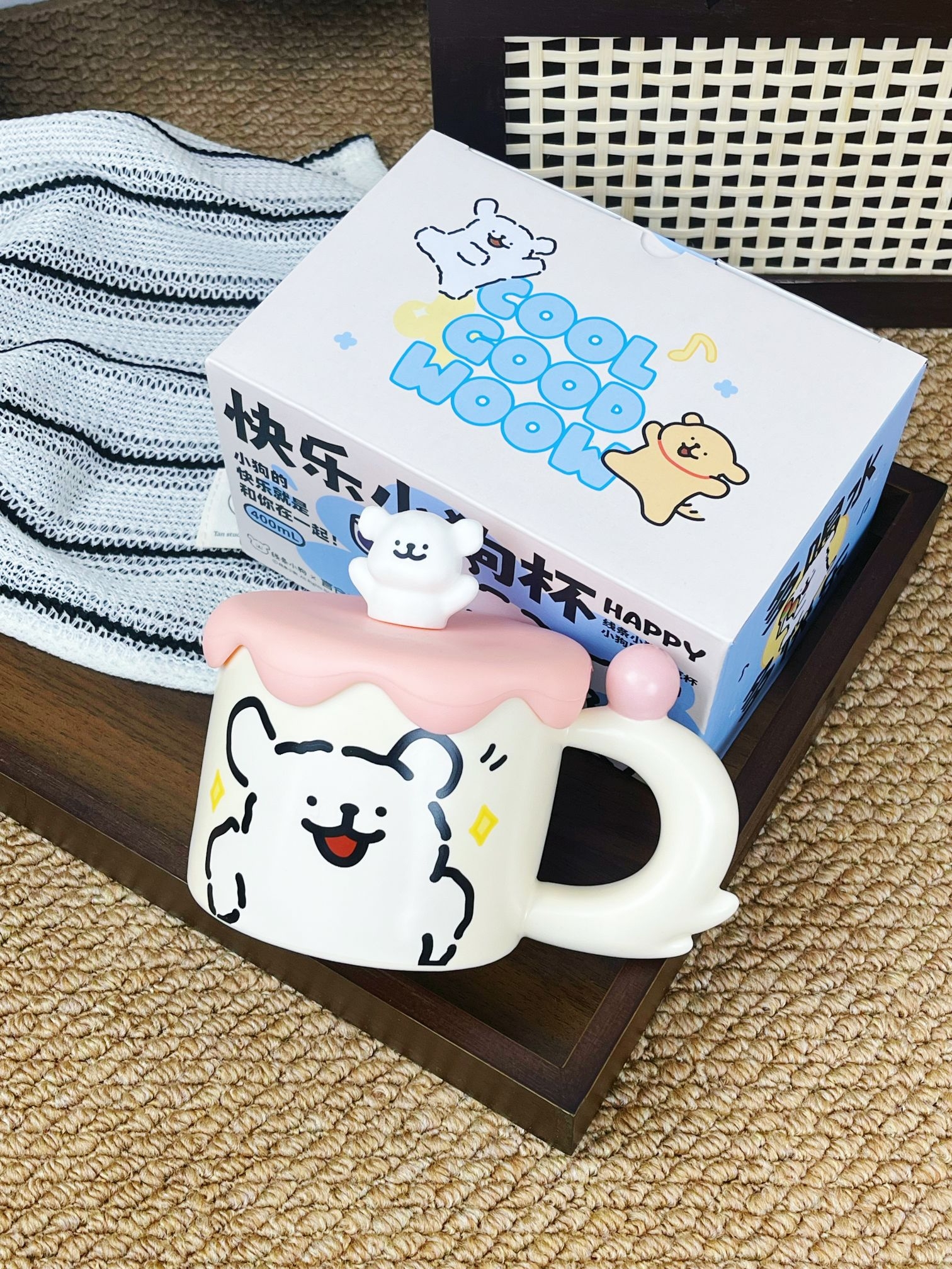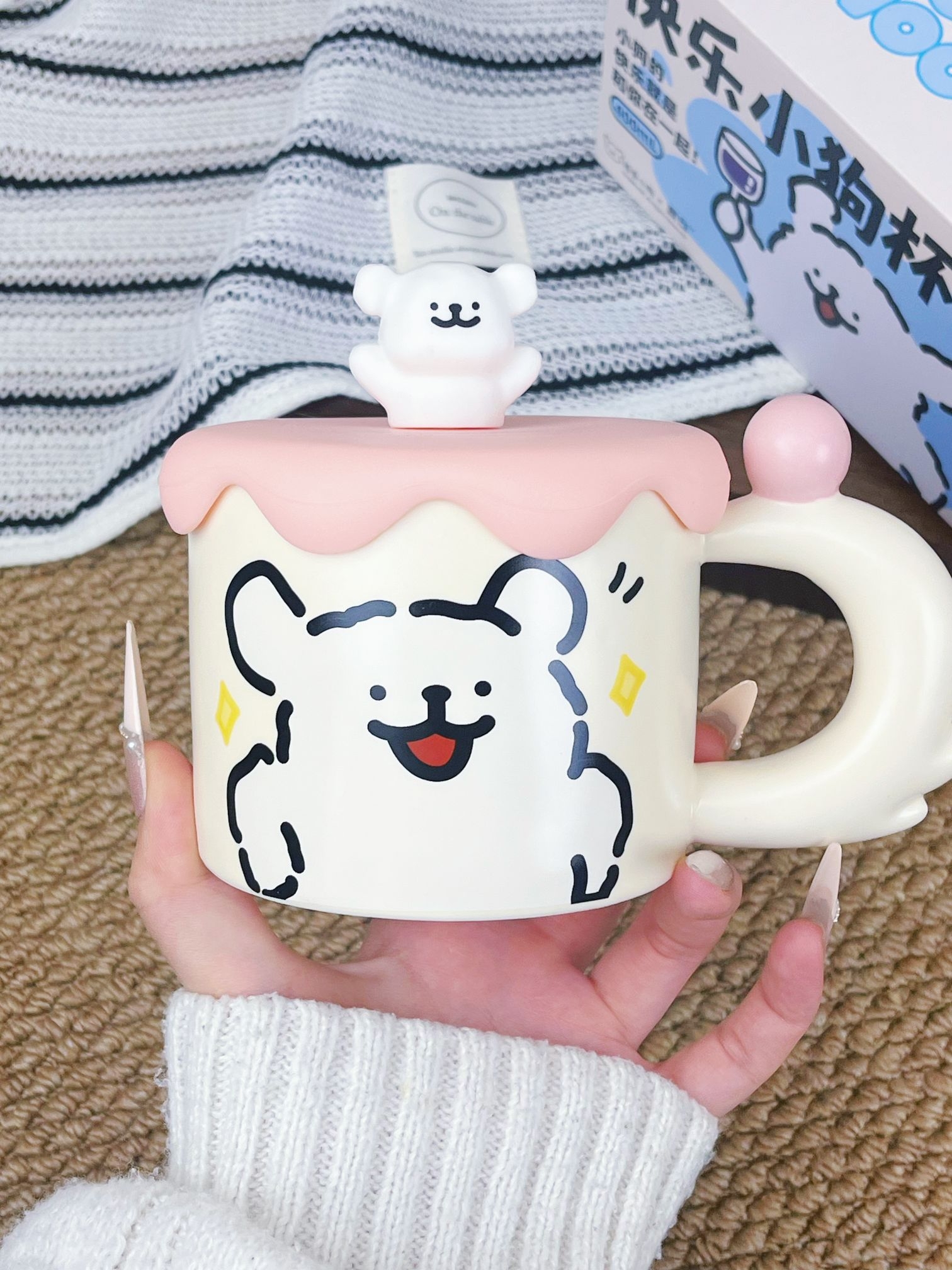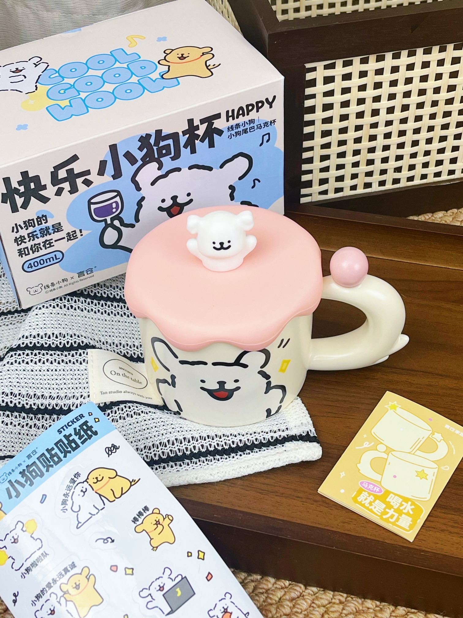 是收到会敲开心的礼物唉💝 可可爱爱的包装 还蛮有分量的 矮胖矮胖的陶瓷杯 把手还是小狗🐶的尾巴 搭配上粉粉嫩嫩的杯盖💓 尊滴可可爱爱啊 素言仓家的线条小狗马克杯 好看的杯子喝水都会心情变好😄
