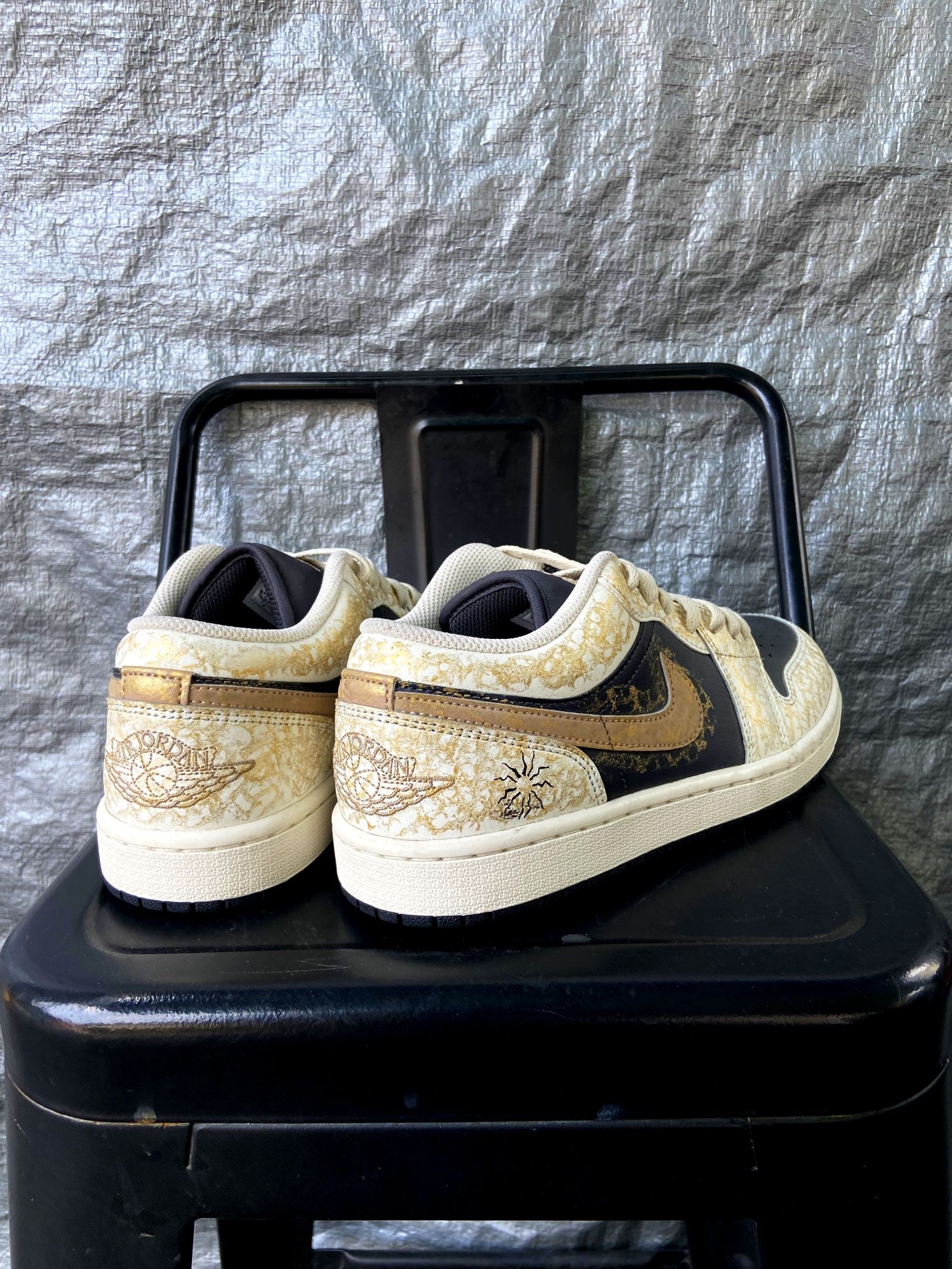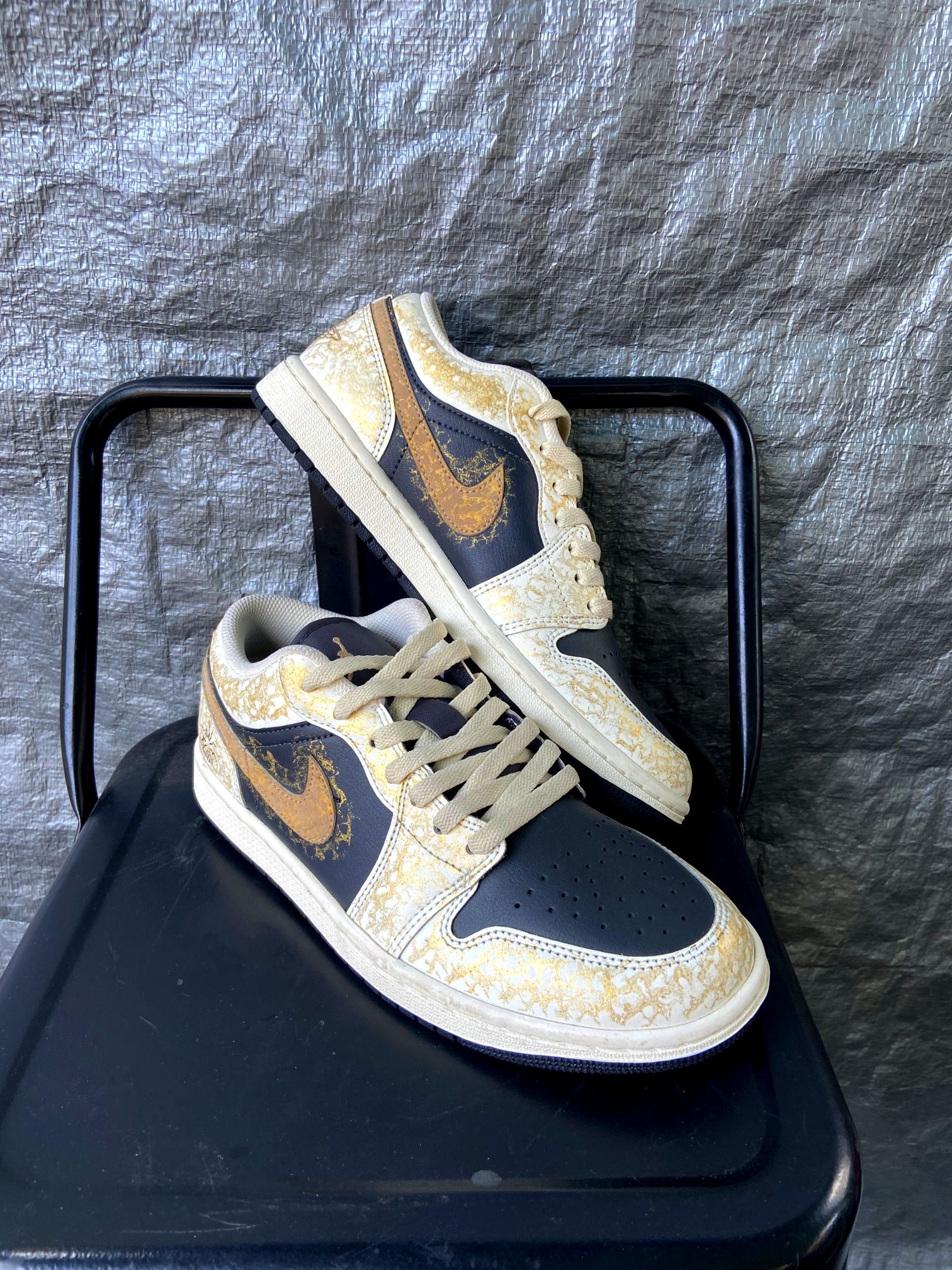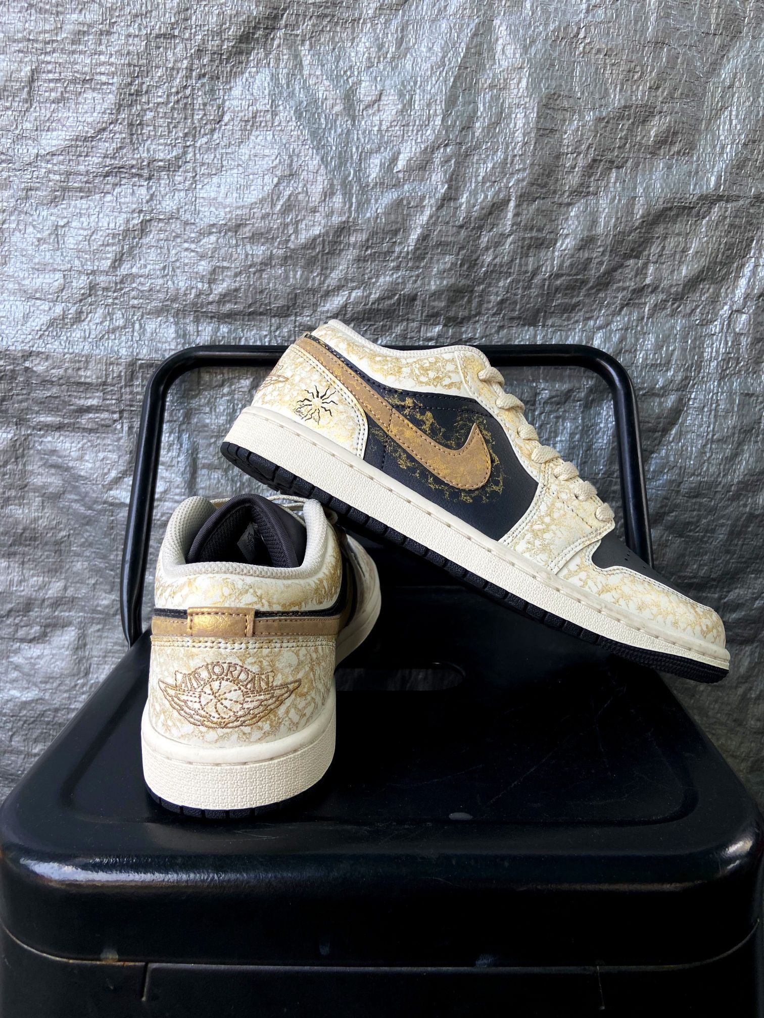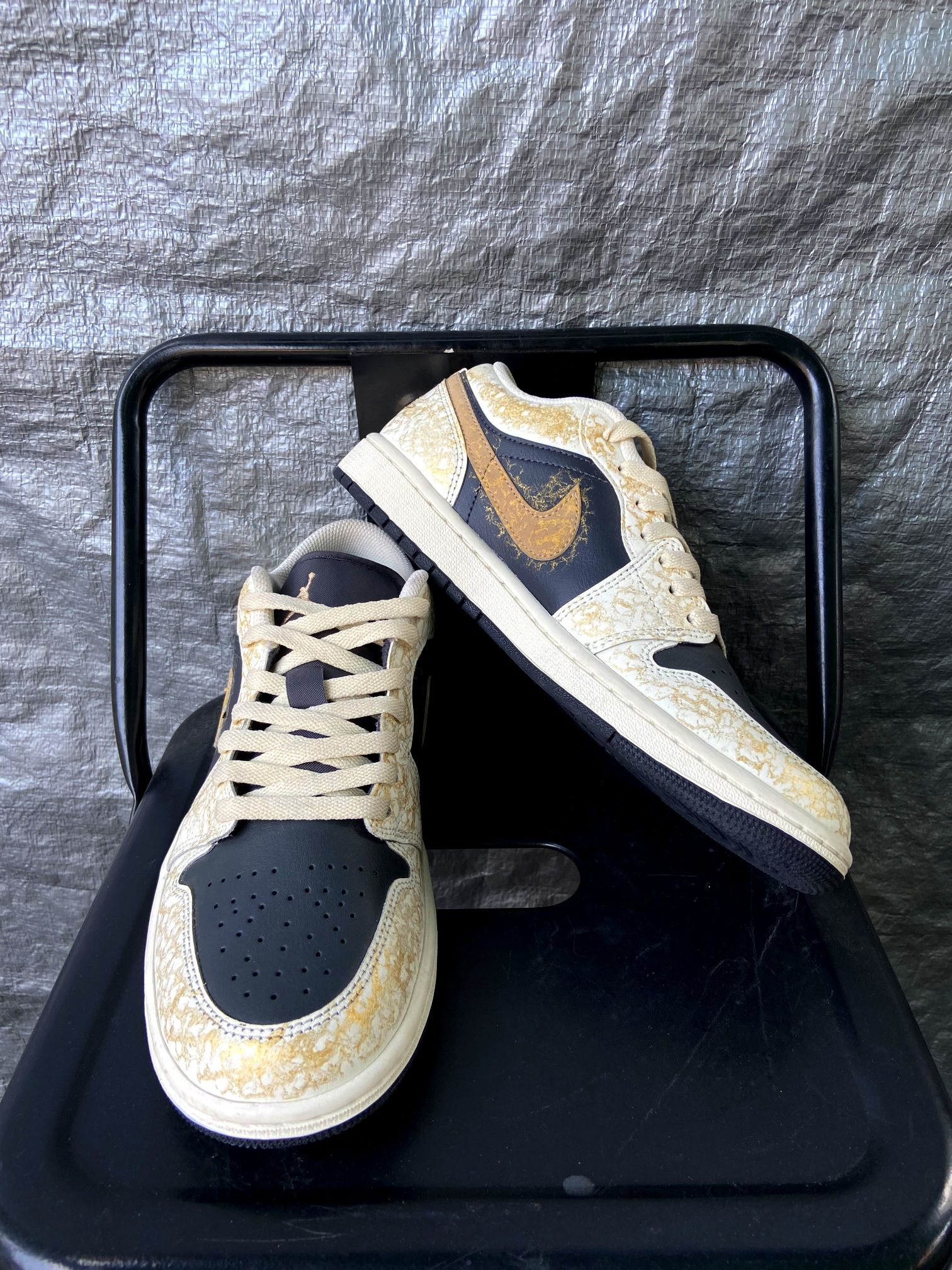 这双鞋的配色真的太有质感了!藏蓝+米白基底搭配金箔裂纹纹理,像把鎏金岁月穿在脚上,低调又高级,不管是配牛仔裤、工装裤还是休闲裙都超适配,轻松拿捏氛围感穿搭。 鞋面是细腻皮革材质,质感扎实又耐穿,金箔裂纹的做旧纹理细节拉满,后跟还有太阳图腾和飞人刺绣,小众又有辨识度,出门不容易撞款。 AJ1 Low经典鞋型,上脚包裹感刚好,不磨脚也不闷脚,鞋底缓震和抓地力都在线,日常通勤、逛街暴走都很稳。而...