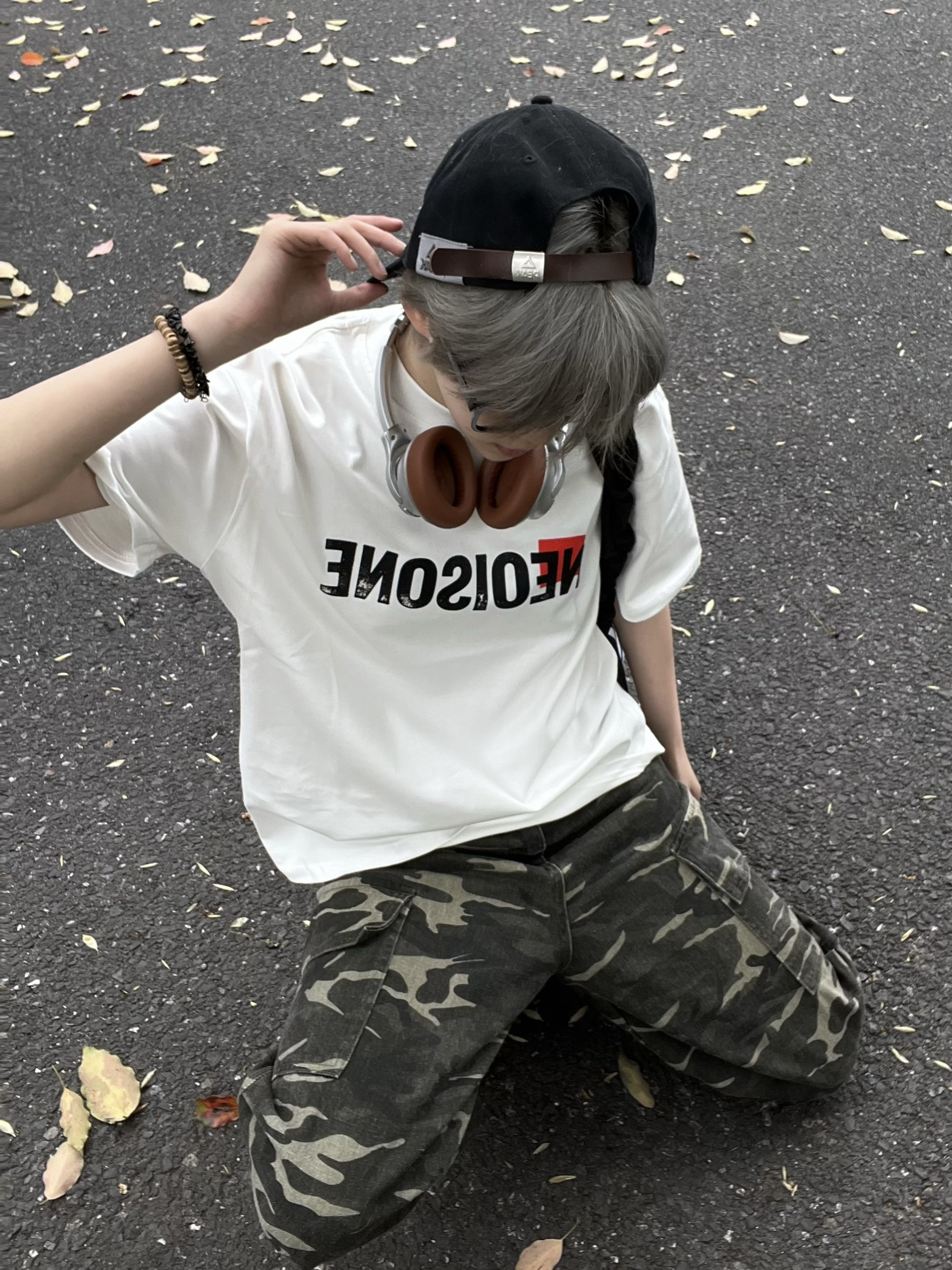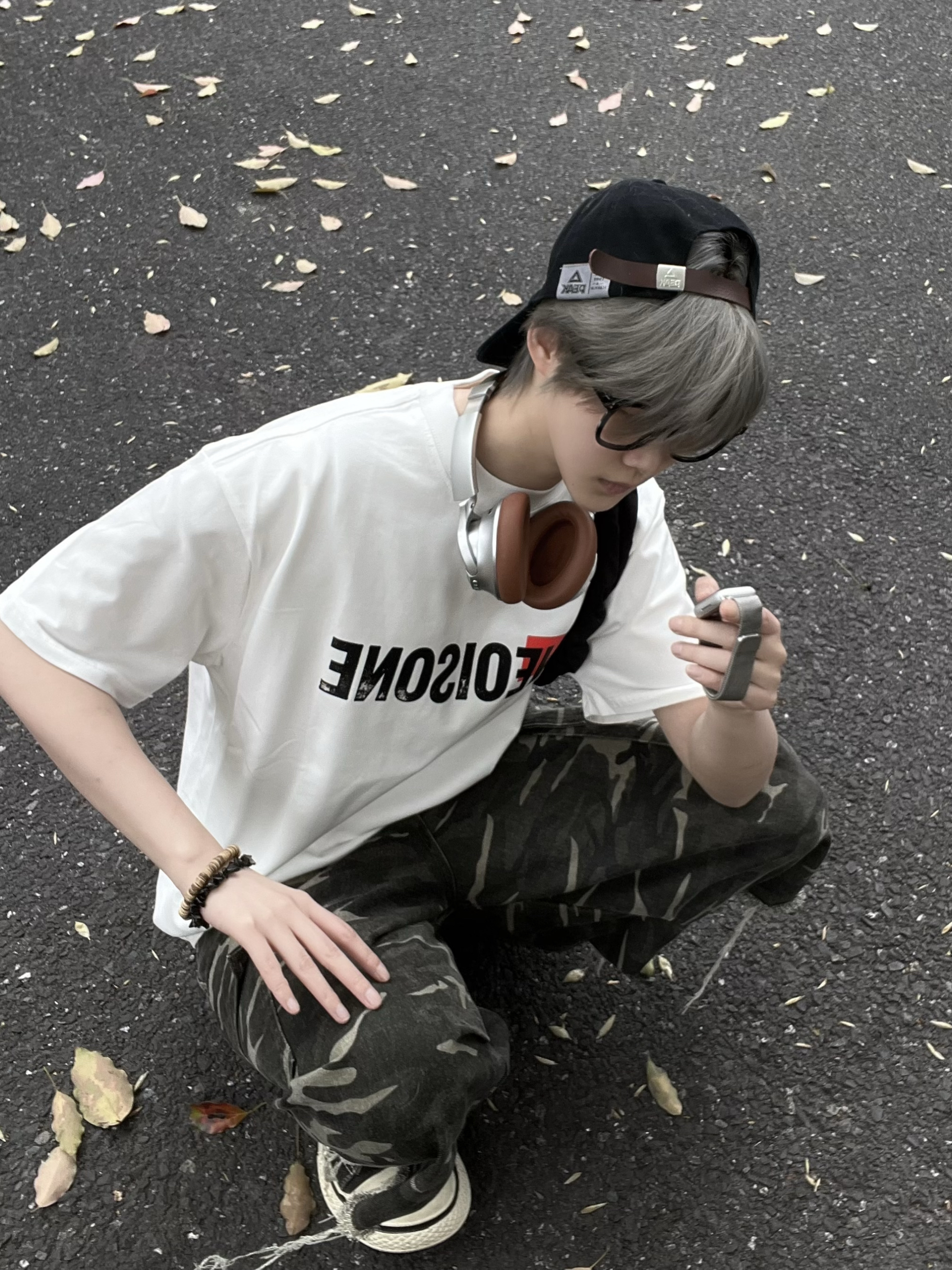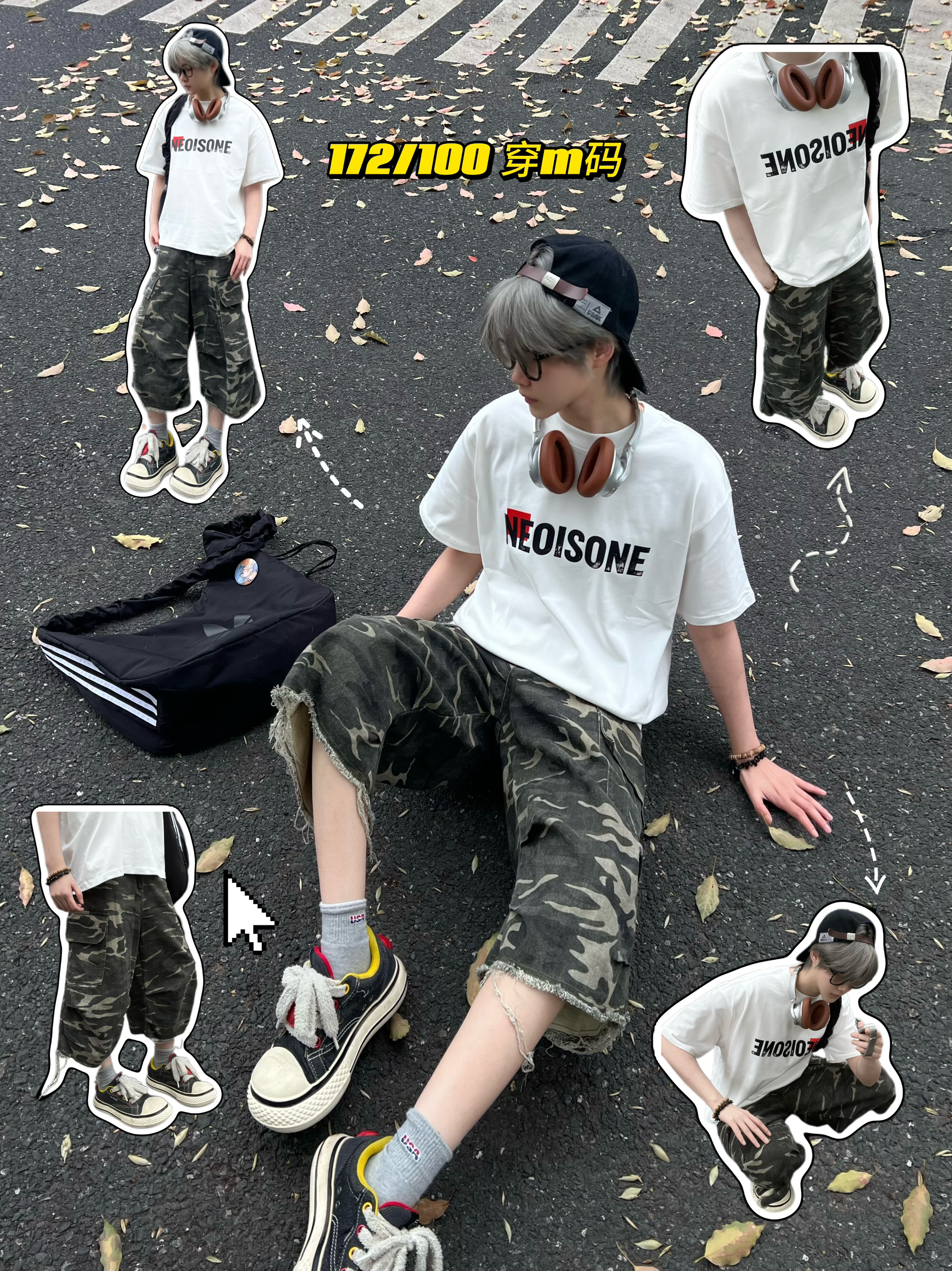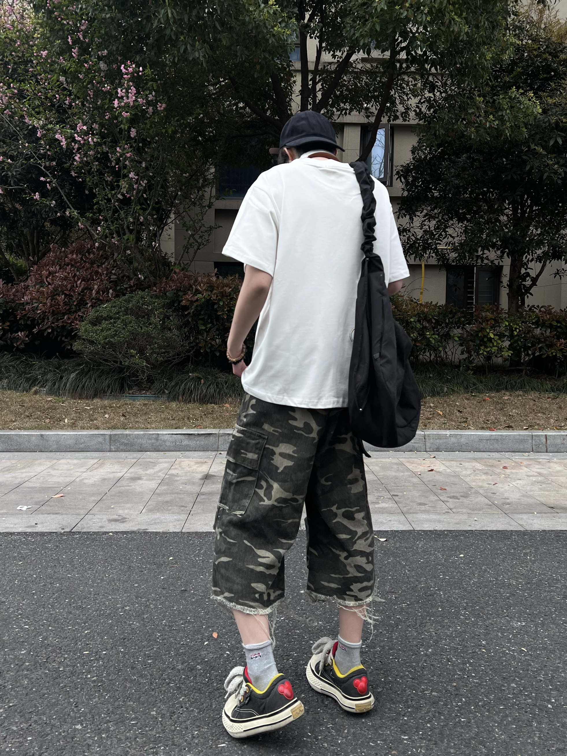 白T+迷彩七分裤,直接把松弛感和少年感焊在身上✨ 基础款白T干净利落,宽松落肩不挑身材,单穿就很有清爽感; 做旧迷彩七分工装裤是整套的灵魂,毛边裤脚+大口袋设计,自带美式街头那味儿,宽松阔腿版型藏肉又显腿长,梨形身材直接闭眼冲。 搭配复古大头鞋、棒球帽和耳机,整套穿搭随性又有细节,上学、通勤、出街都适配,不费力就穿出满满的少年感,男生春夏穿搭直接抄作业!