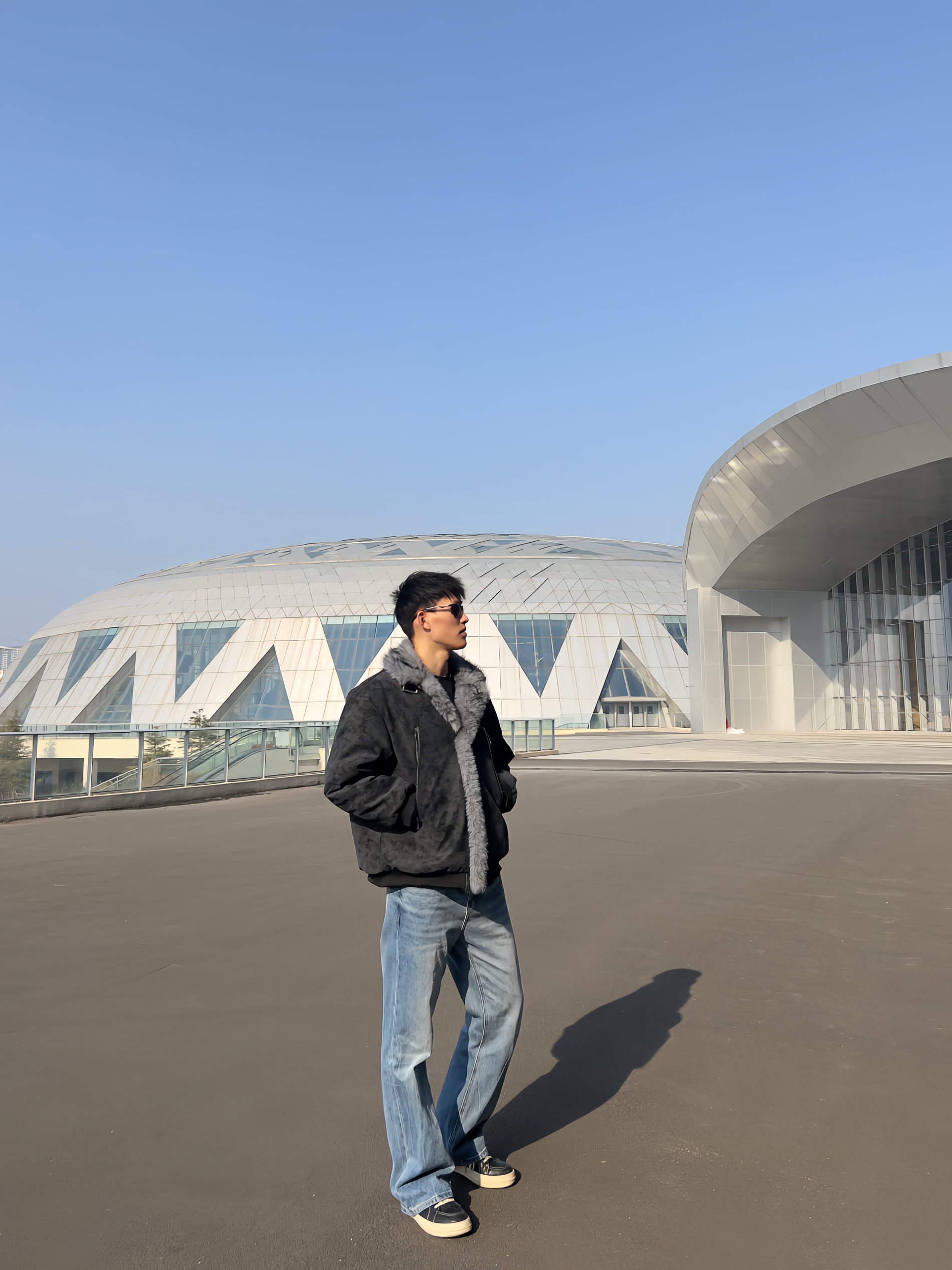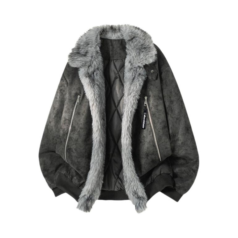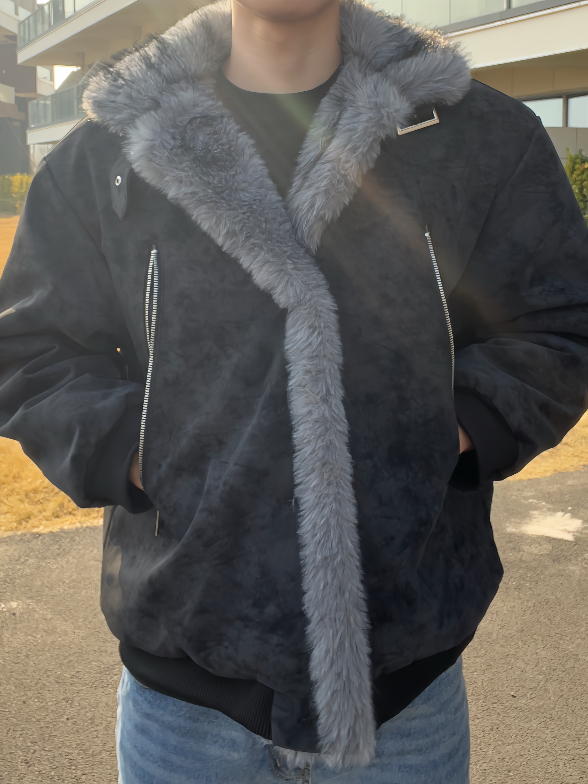冬日氛围感穿搭来啦✨ 做旧灰麂皮质感外套,大毛领设计超有范儿, 内里毛绒绒的,保暖又显质感。 金属拉链细节拉满,版型宽松不挑身材。 内搭简单黑T,配浅蓝直筒牛仔裤, 整套就是又酷又松弛,出街回头率拉满。