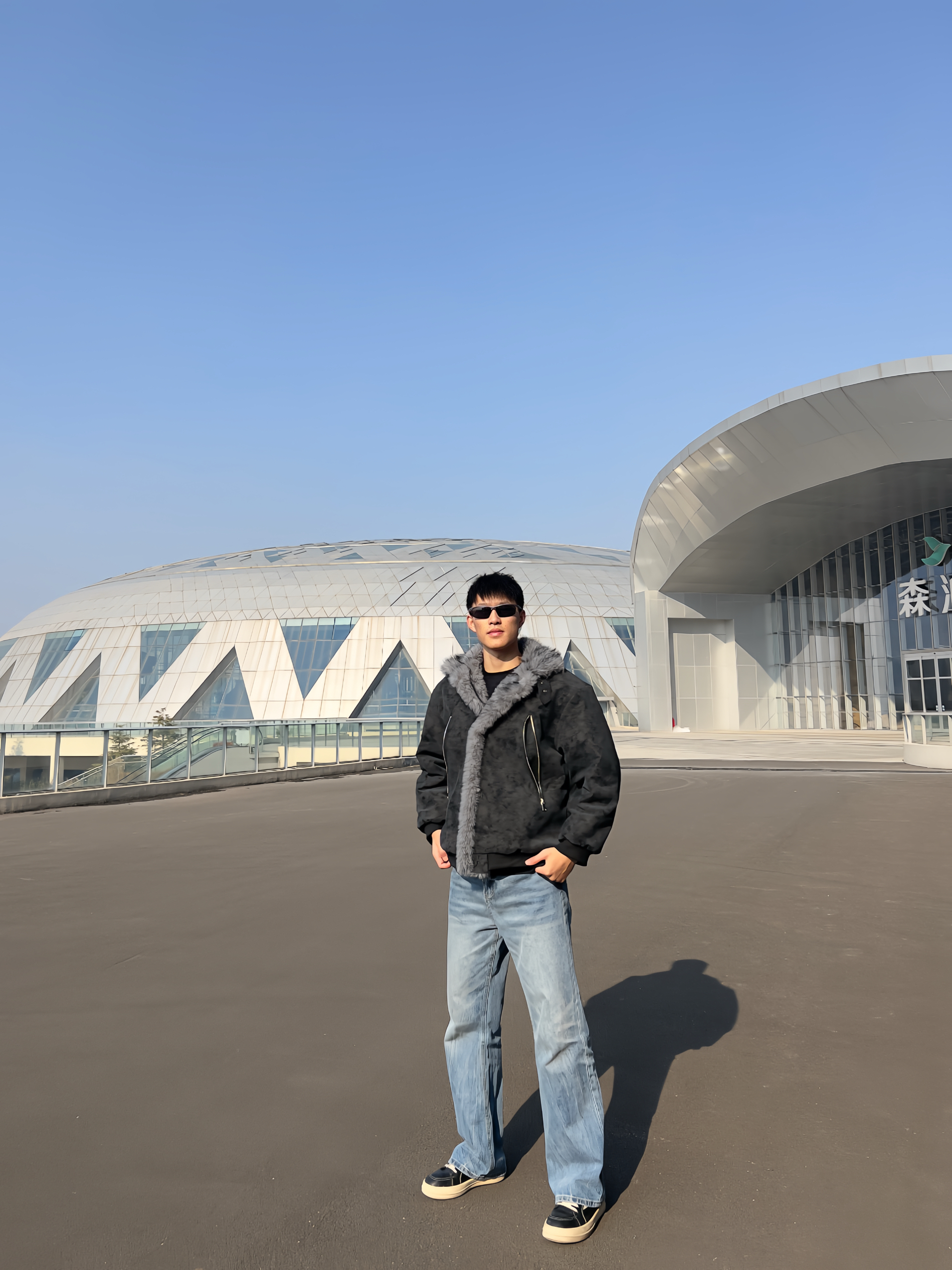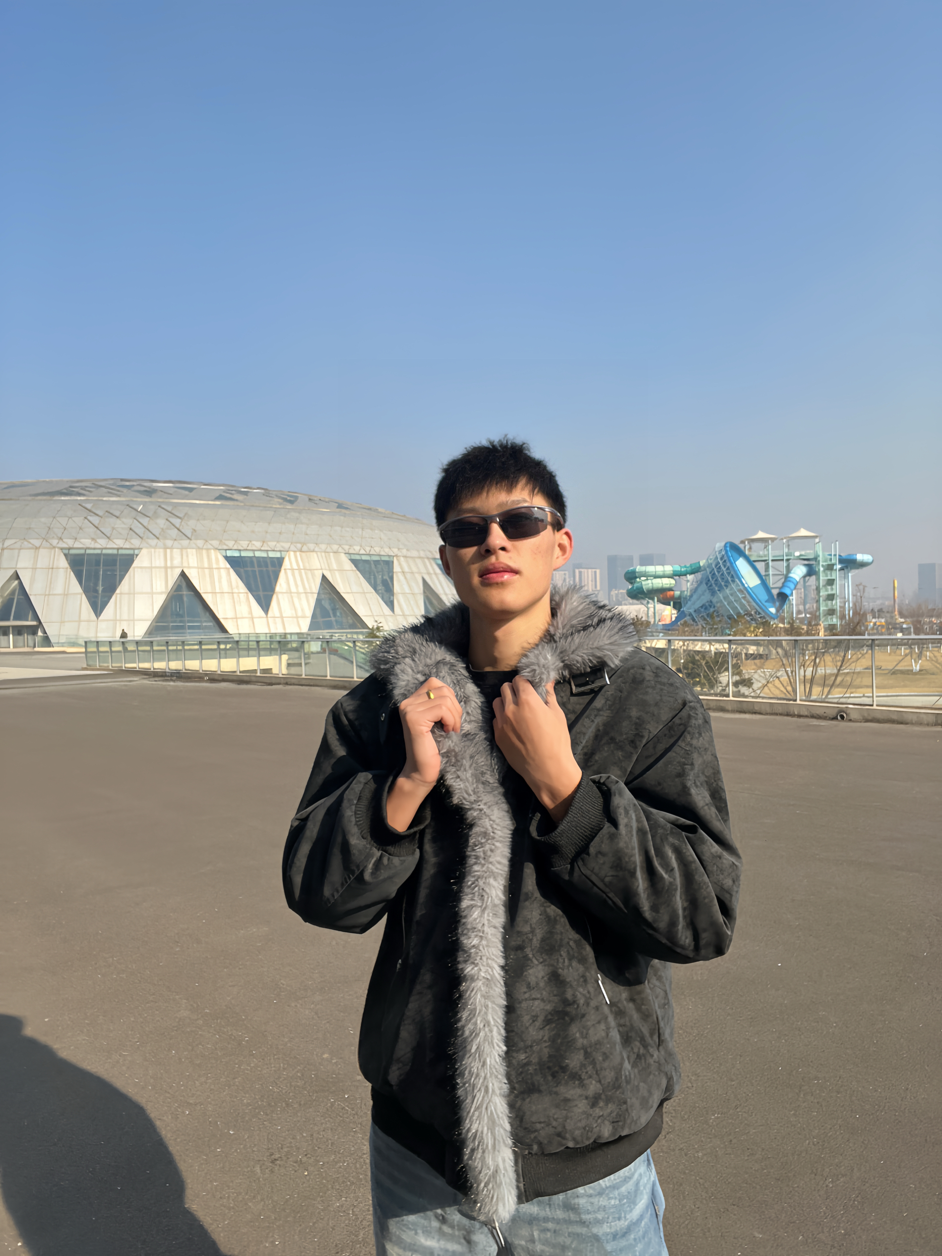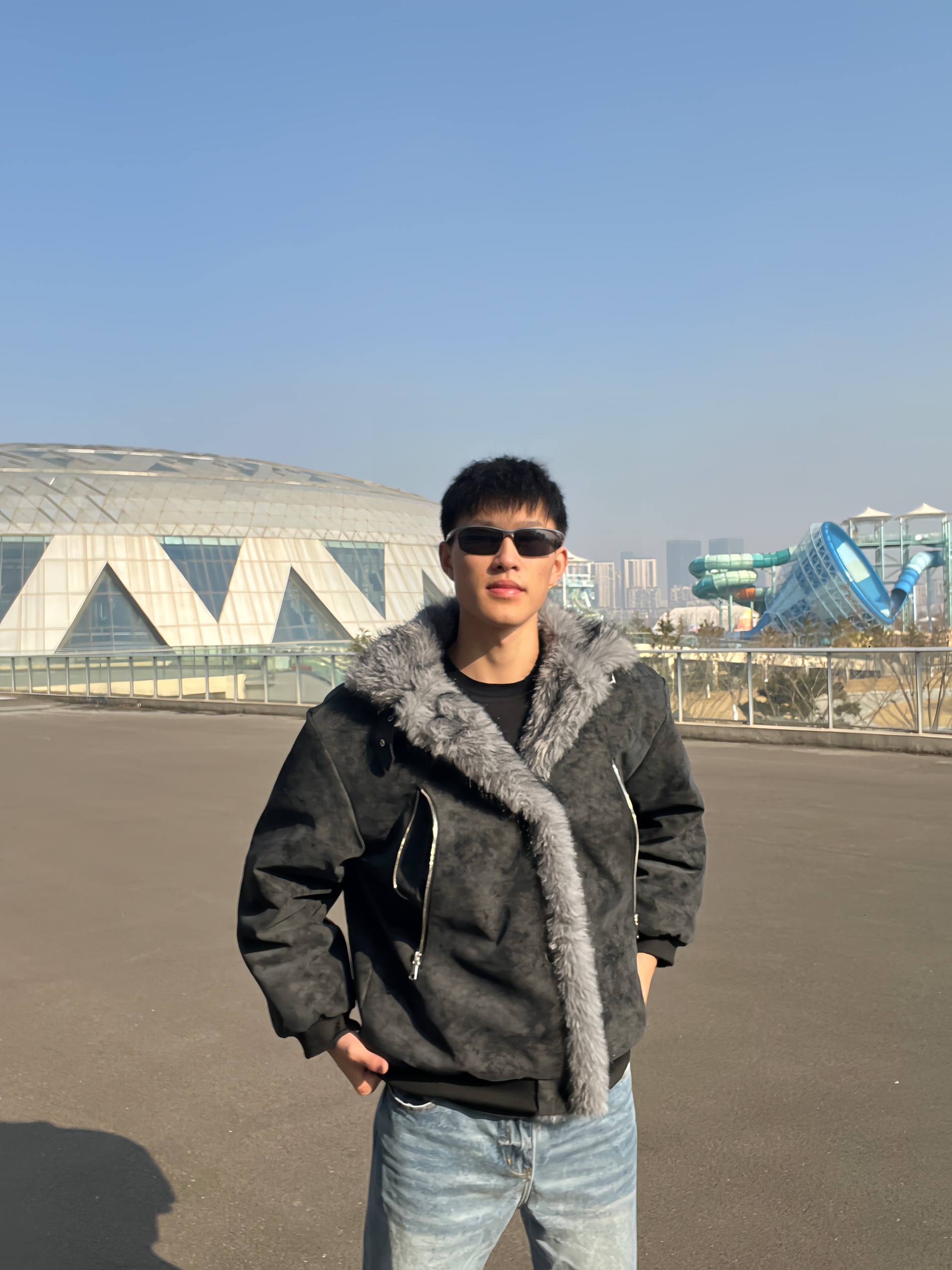 冬日氛围感穿搭来啦✨ 做旧灰麂皮质感外套,大毛领设计超有范儿, 内里毛绒绒的,保暖又显质感。 金属拉链细节拉满,版型宽松不挑身材。 内搭简单黑T,配浅蓝直筒牛仔裤, 整套就是又酷又松弛,出街回头率拉满。