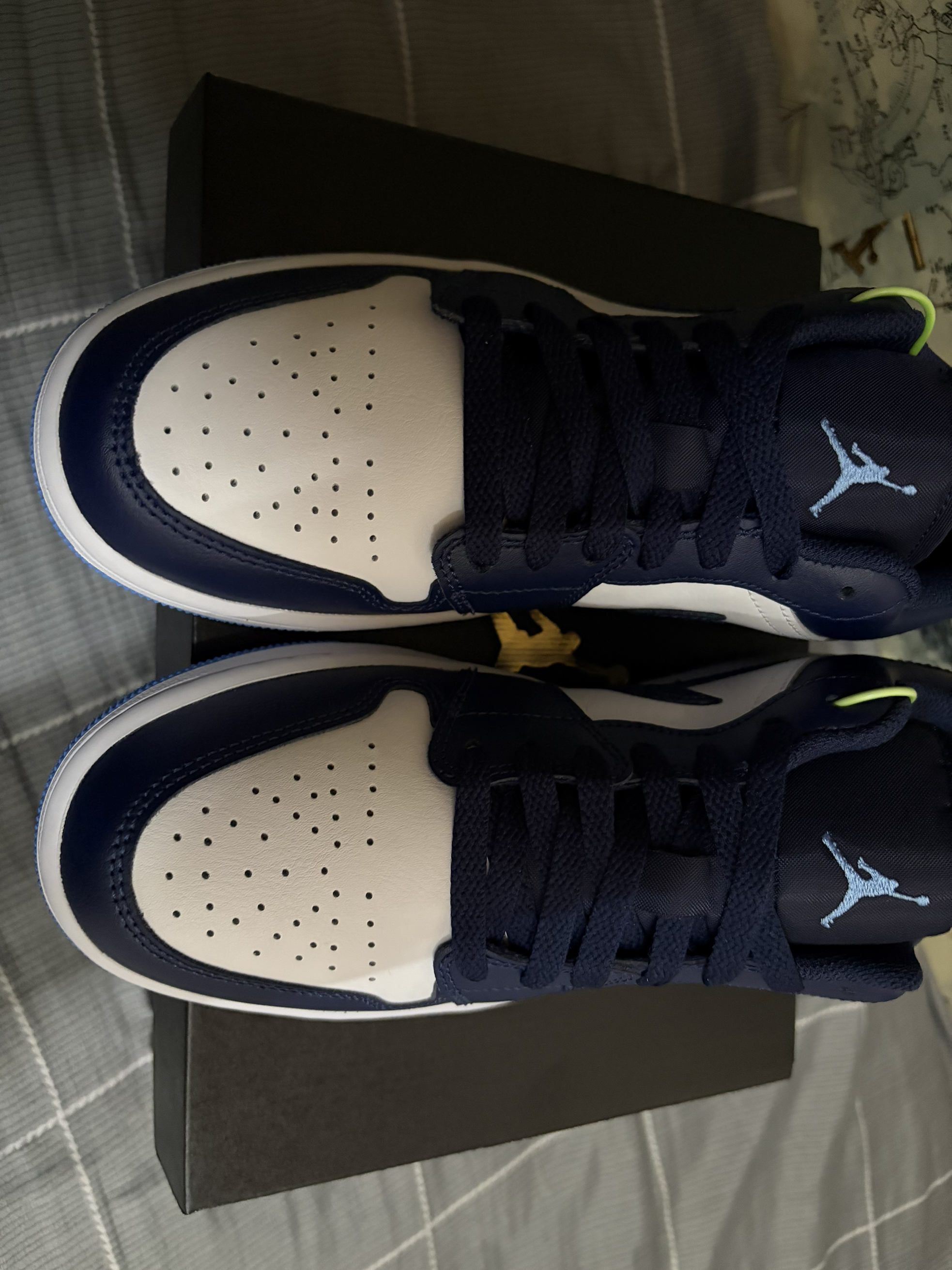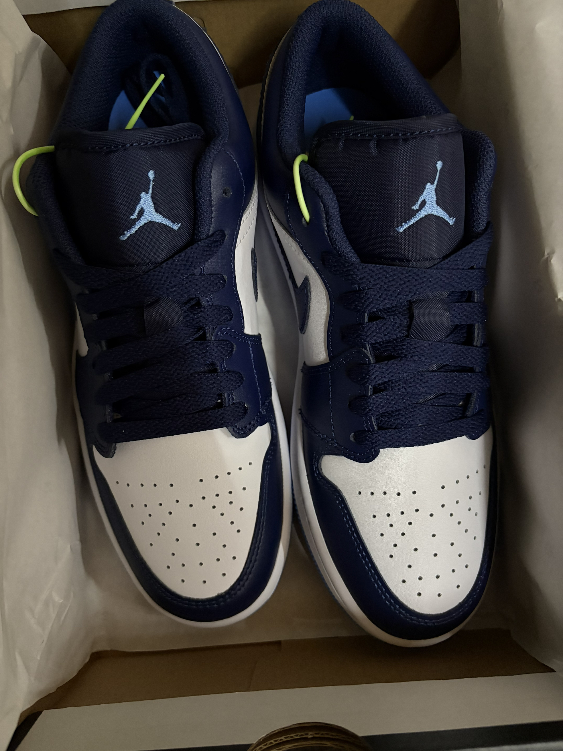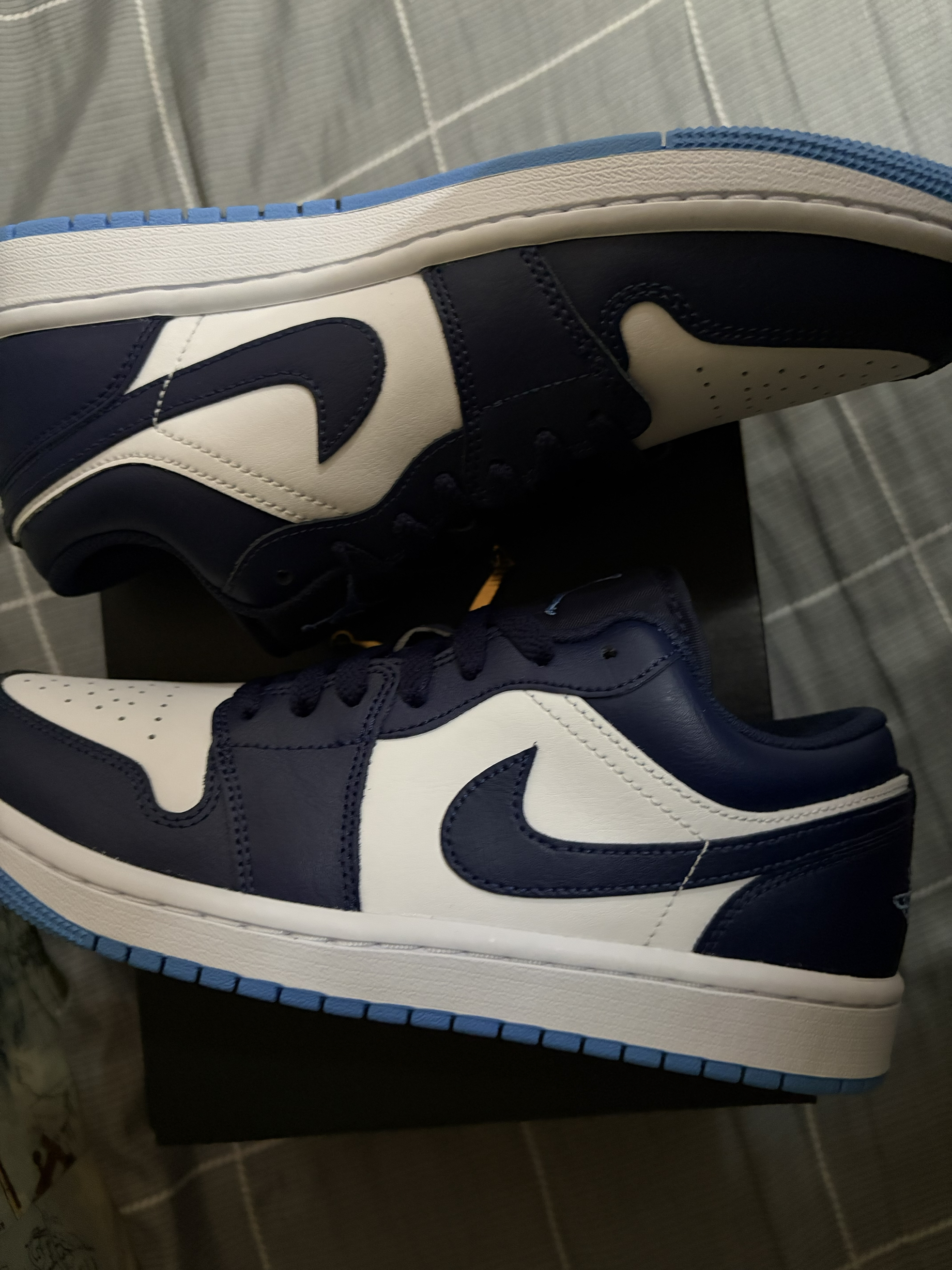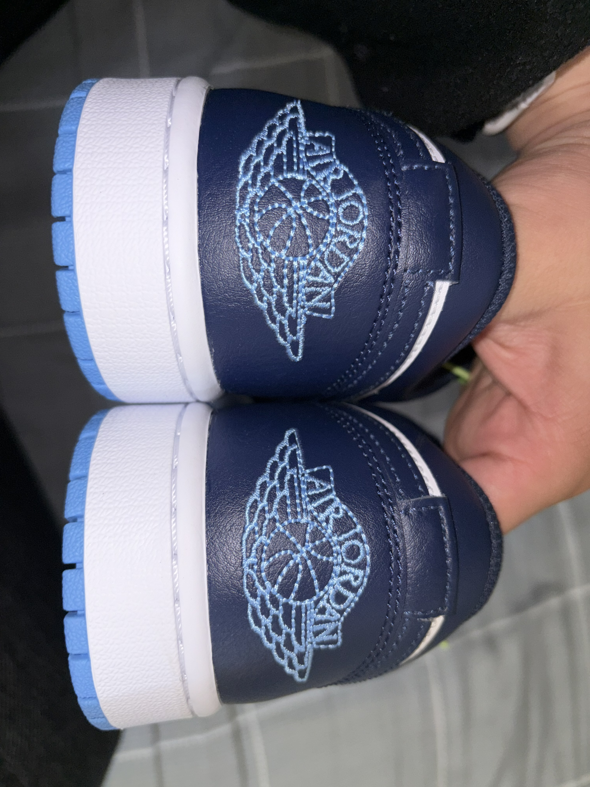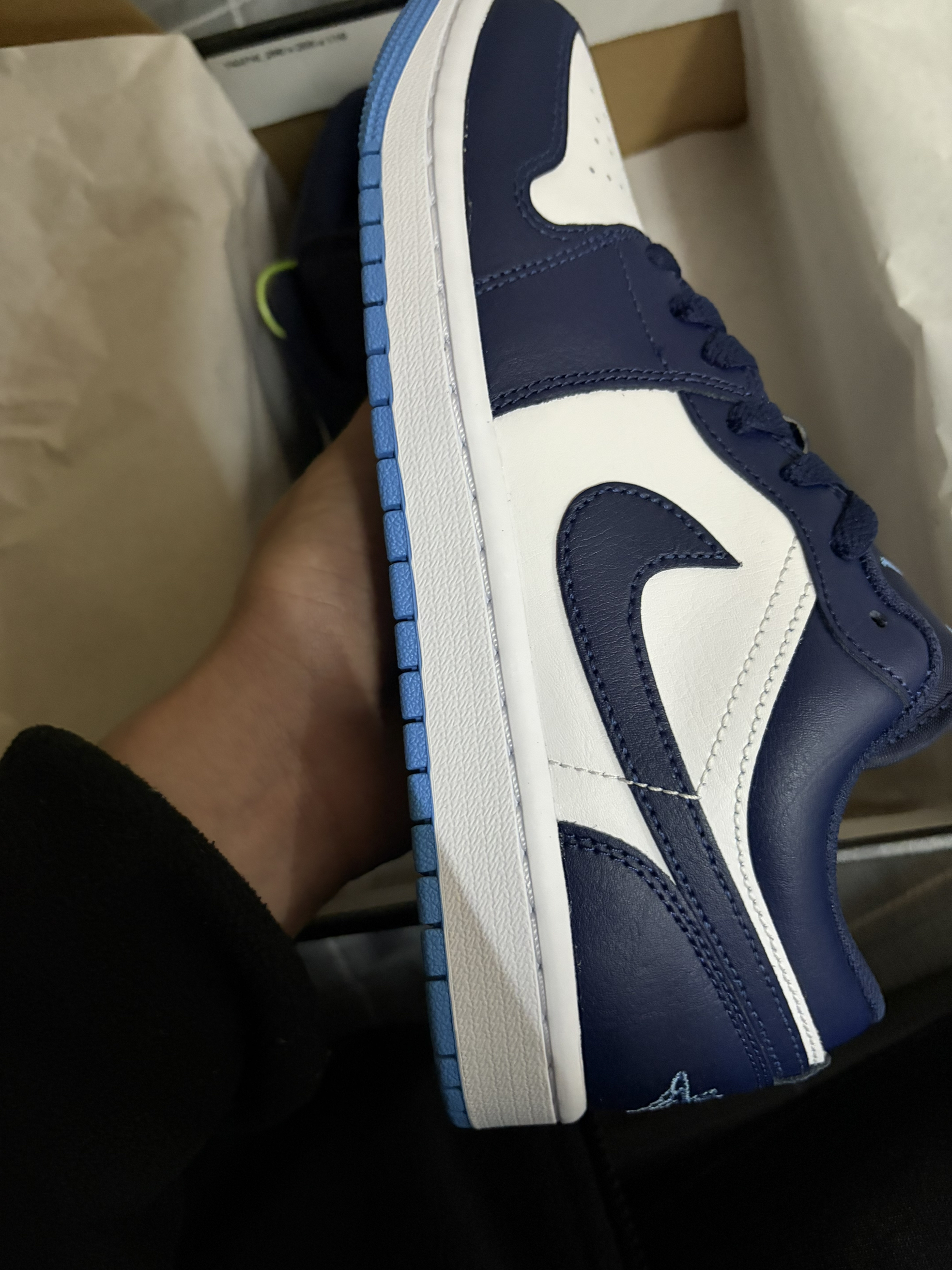 被这双AJ1 Low海军蓝狠狠拿捏了!🤍 经典的黑白蓝配色永不过时,低帮版型更适合日常,走路久了也不会累。 鞋头透气孔设计,夏天穿也不闷脚,细节做工都很到位,飞人刺绣清晰,外底的北卡蓝点缀太加分了。 不管是学生党还是打工人,这双都能hold住各种风格,性价比超高!