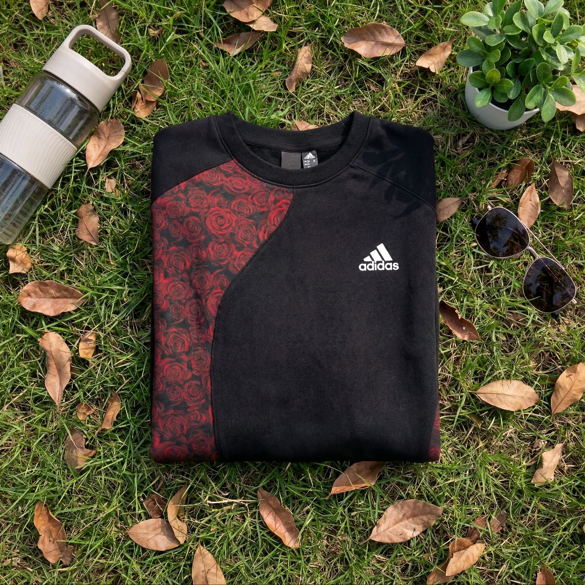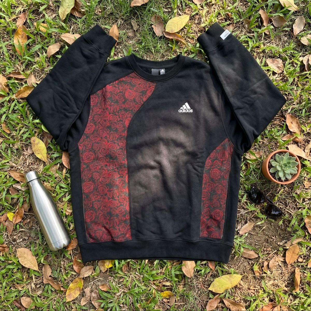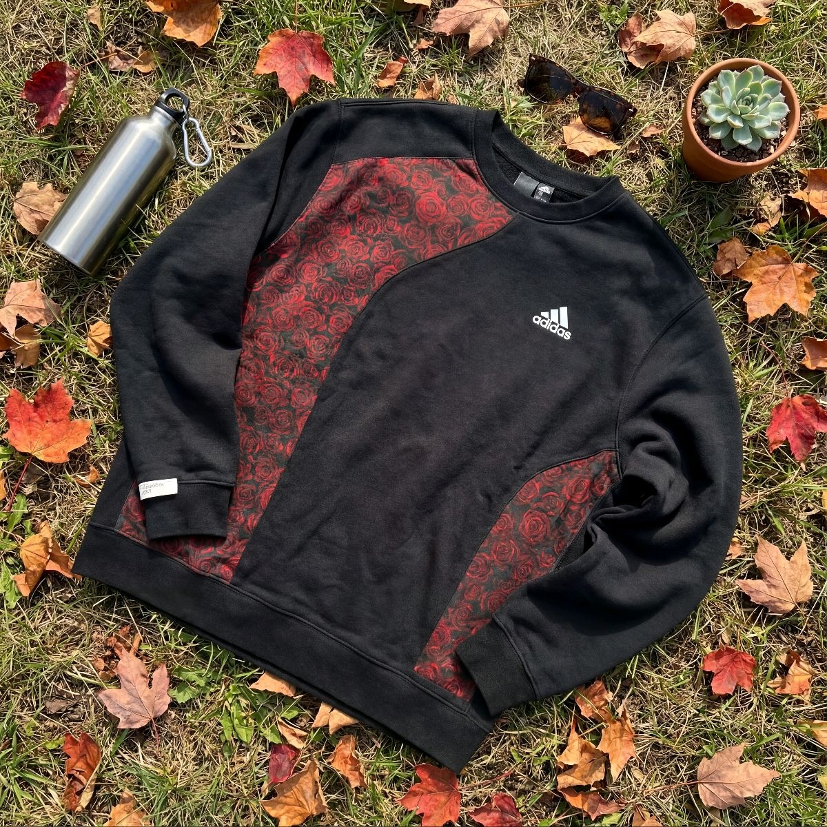 这件黑底红玫瑰的卫衣,看着就很有个性,不会太花哨。 面料是那种厚实的棉质,摸起来软软的,贴身穿也舒服,春秋单穿刚好,冬天里面搭个打底衫也不冷。 版型是宽松的,不挑身材,肚子和胳膊上的小肉肉都能遮住,穿着自在又显精神。 侧边的玫瑰拼接设计很特别,和阿迪的logo搭配起来,休闲又带点酷感,配牛仔裤、运动裤都好看,出门逛街、上班通勤都合适,耐脏又好打理,脏一点也看不出来。