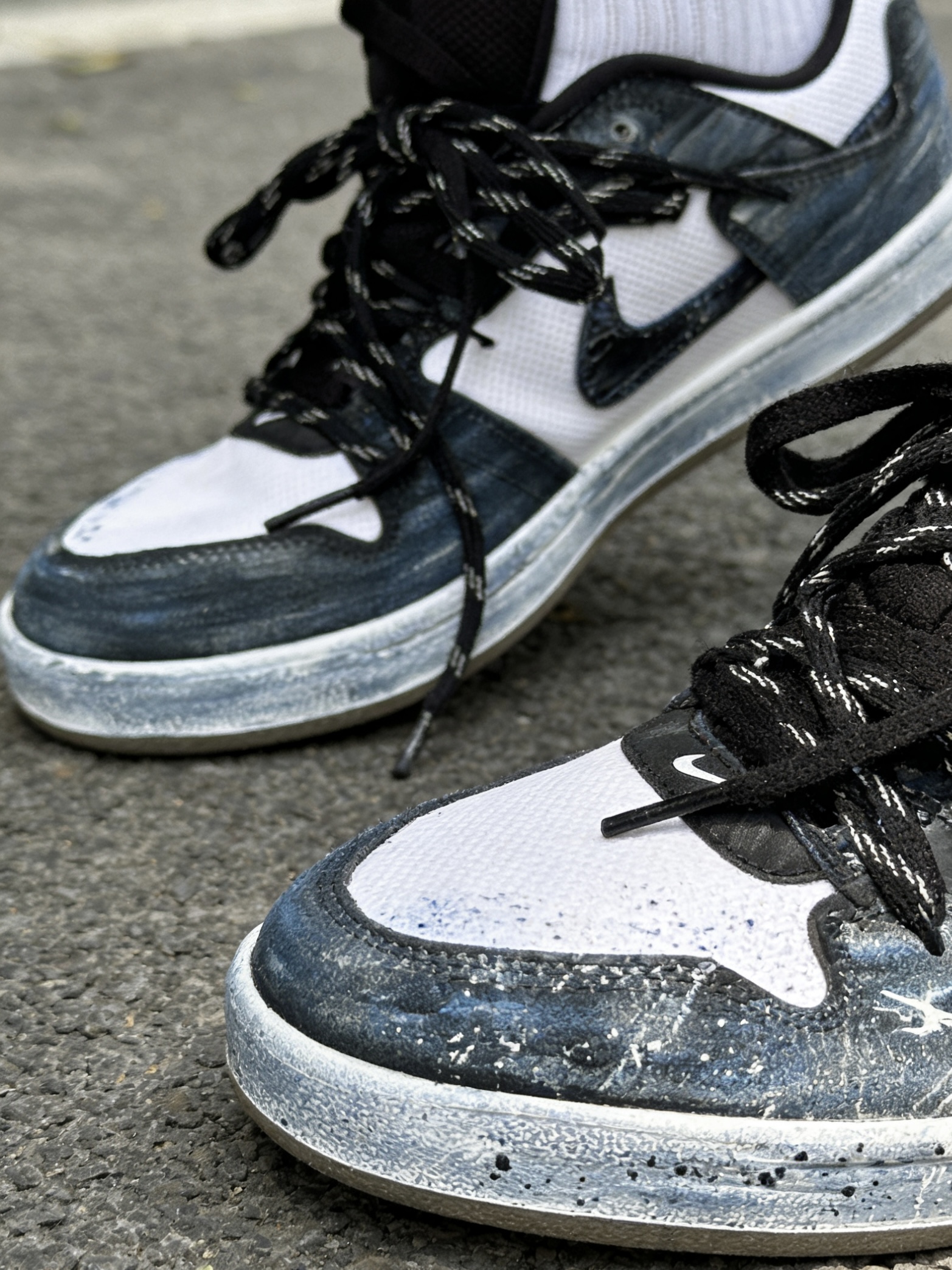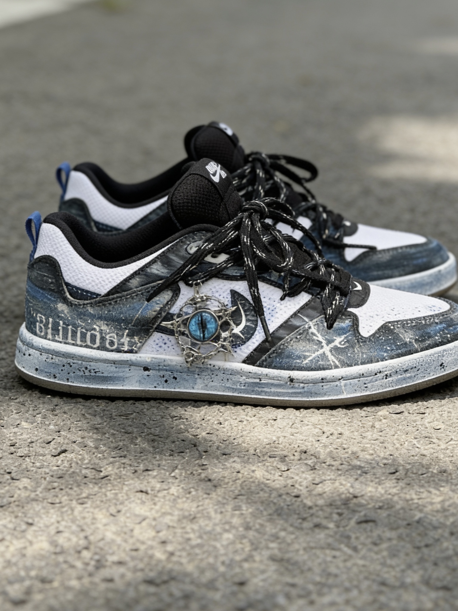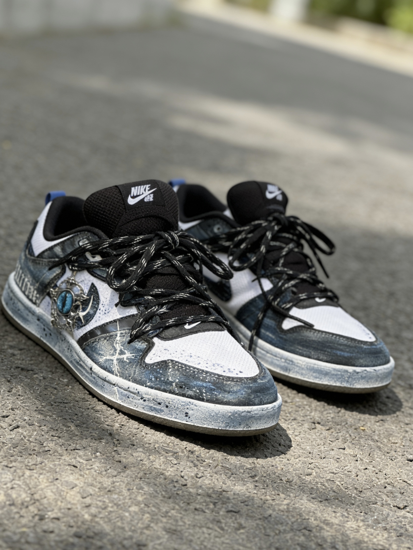 被这双定制鞋的细节戳中了!Nike SB Alleyoop 基础款改造,蓝黑做旧泼墨质感,搭配金属恶魔眼挂饰和哥特字体,暗黑复古感拉满。 粗麻绳鞋带提升辨识度,鞋底防滑耐磨,日常出街或滑板都合适。