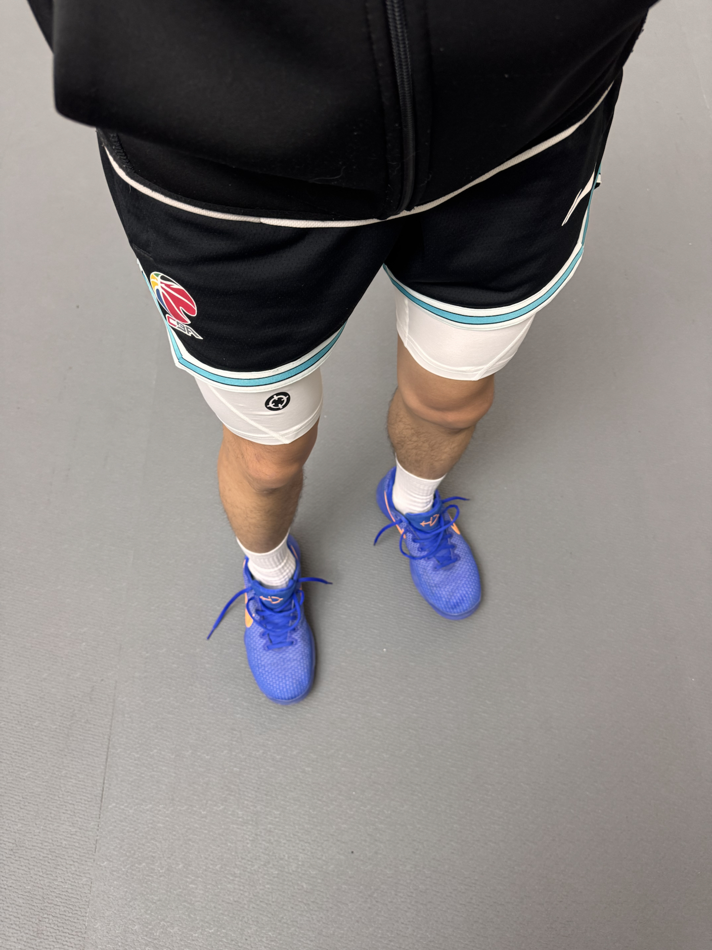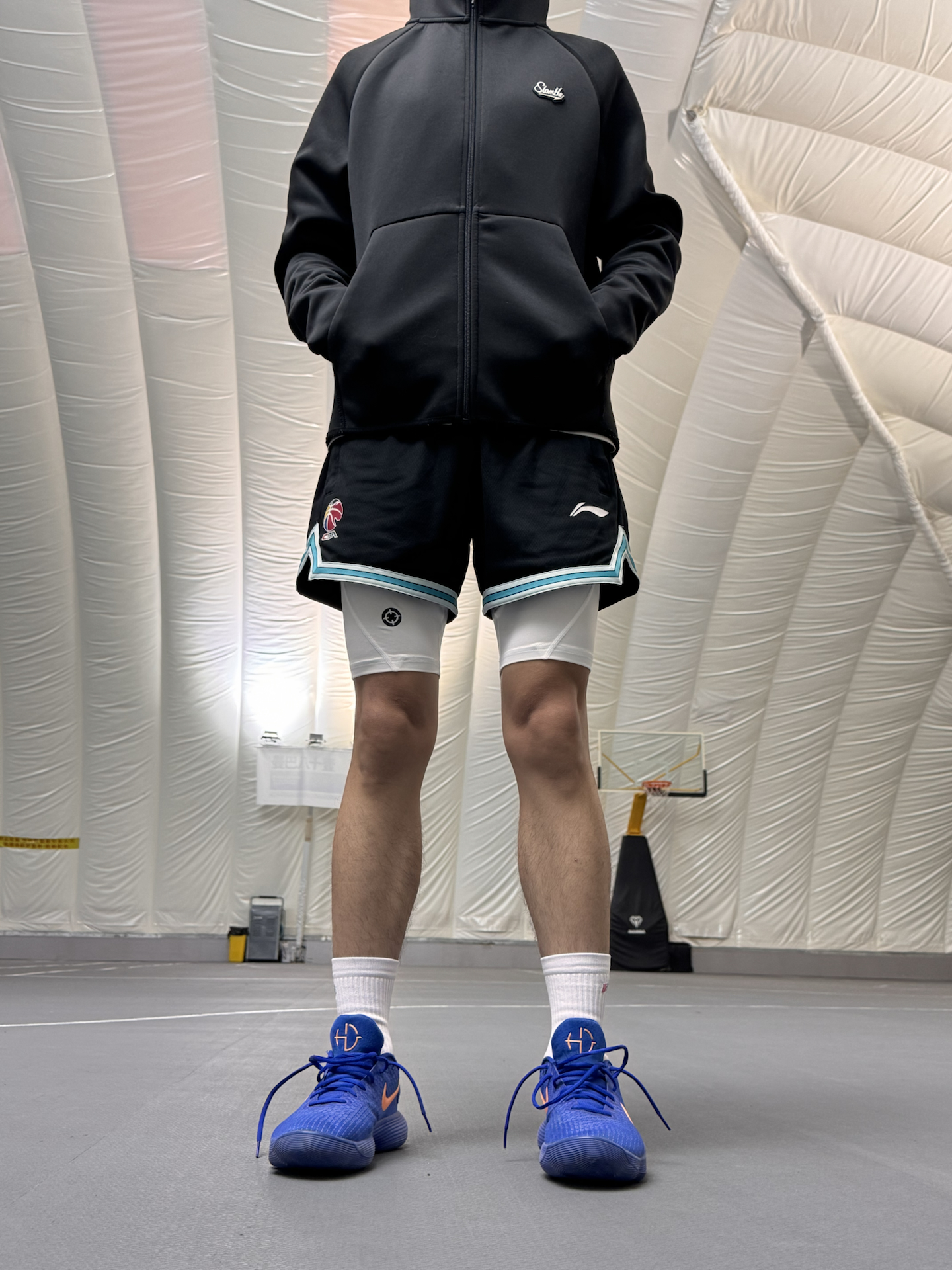 #我的球鞋日记 这一身搭配,是为球场而生的实战美学。黑色连帽卫衣简约利落,胸前“Slamble”标志低调点睛,内搭白色紧身运动裤,勾勒出力量感十足的腿部线条。短裤是李宁CBA系列的美式四分裤,黑色主调配以浅蓝与白色滚边,左腿CBA标志醒目,右腿李宁Logo彰显专业身份。脚踩Nike Hyperdunk 2017 Low蓝橙配色实战篮球鞋,低帮设计兼顾灵活性与支撑性,鞋身透气网面与橙色Swoosh形...