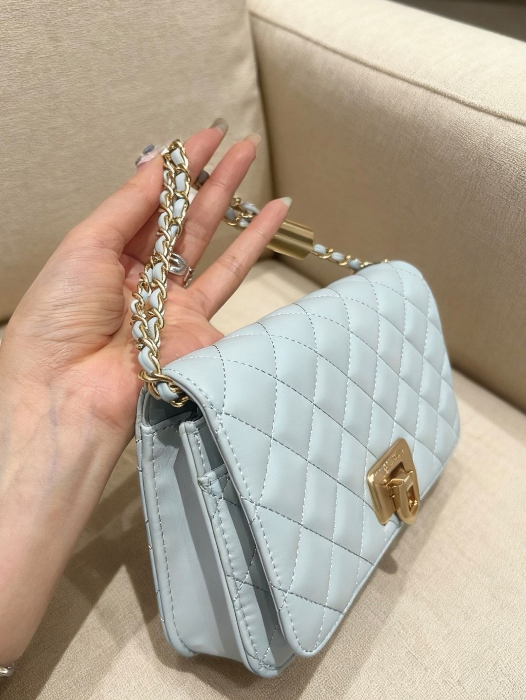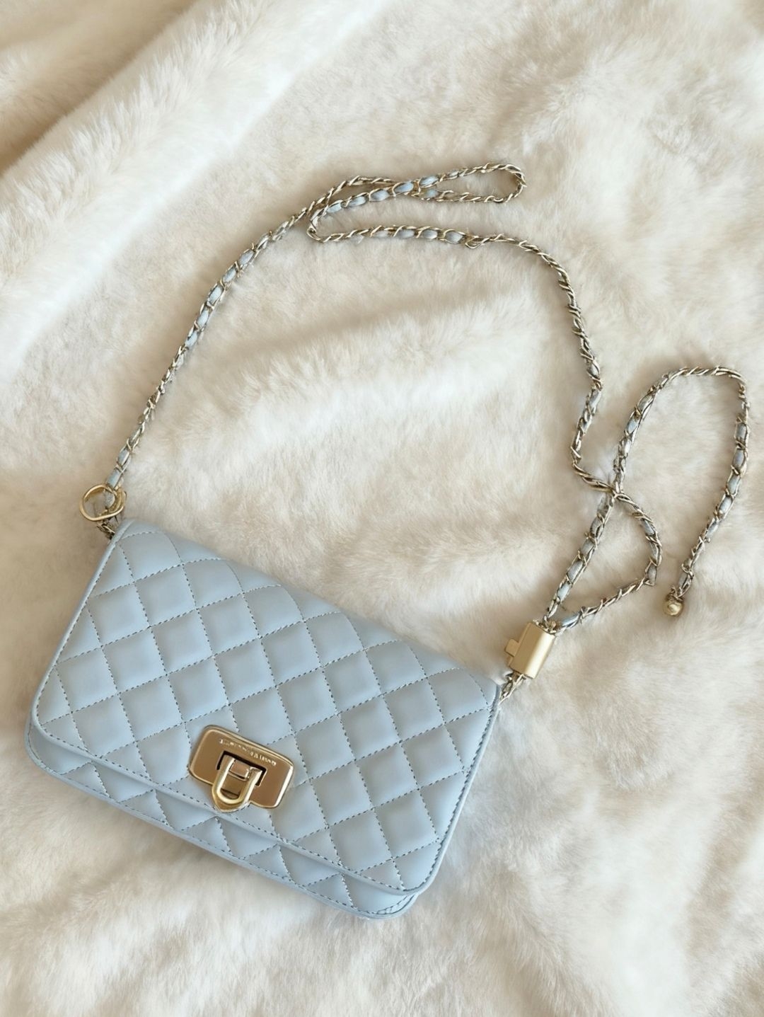 小CK海盐蓝小香风菱格包太好看了,海盐蓝菱格b蓝,好清新的颜色,实物细节真的很有质感光线充足的时候会偏白,正常光线下就是奶呼呼的蓝色,斜背手提都可以,容量放下手机和粉饼补妆的东西,