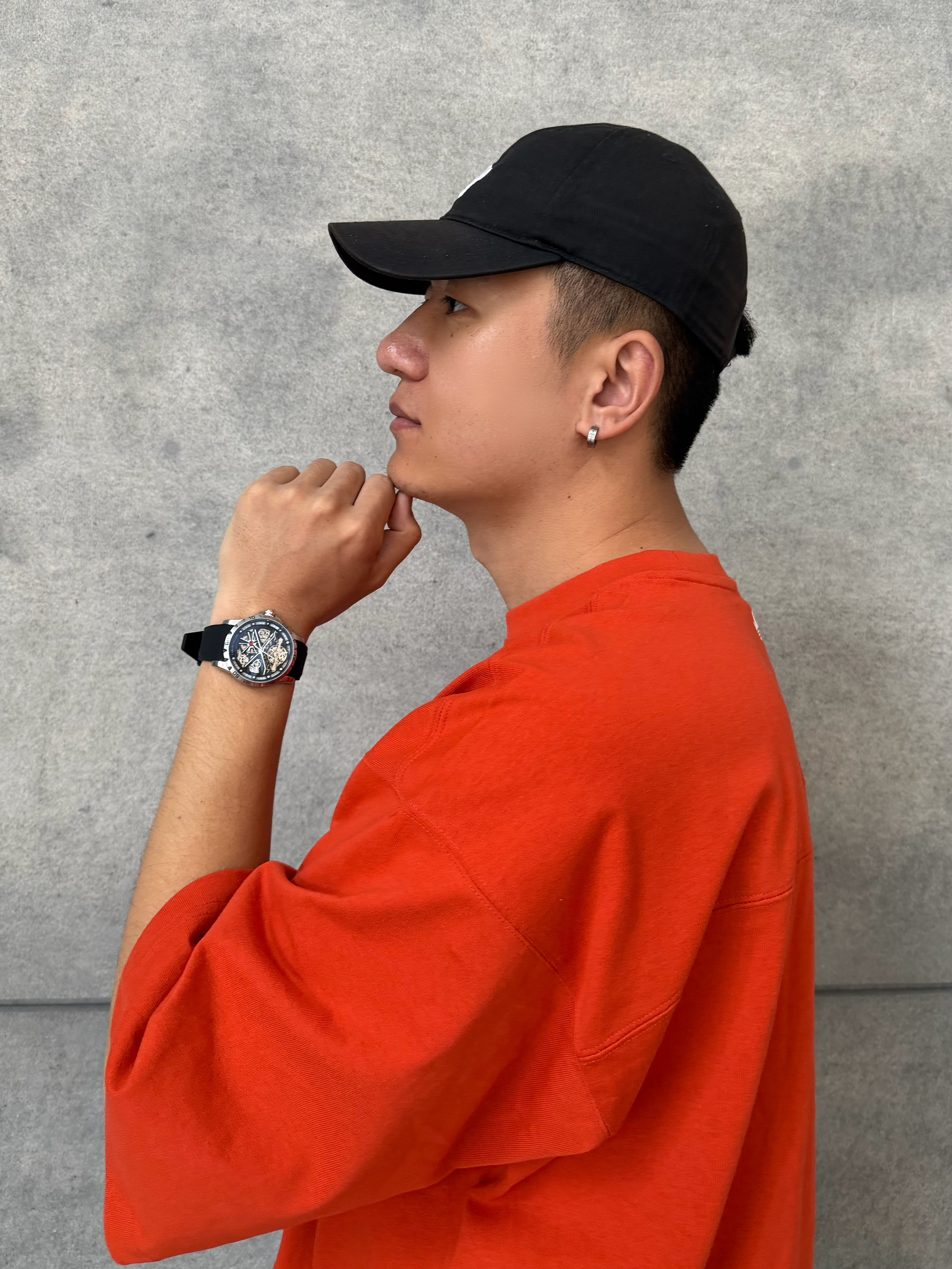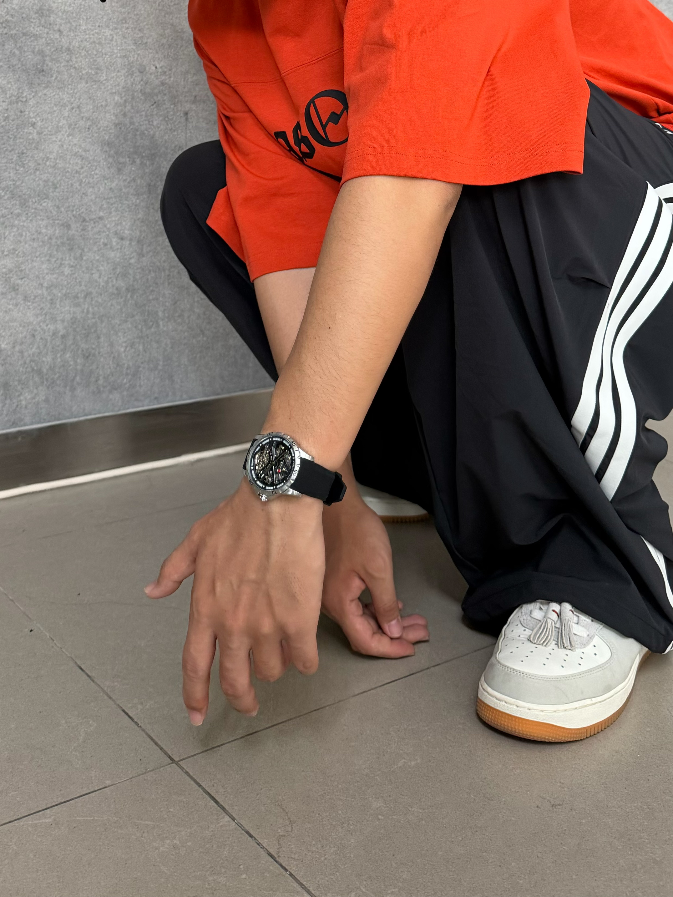 咱就是说,美式潮男的精髓真被这块表拿捏住了🤯 橘色短袖+黑色伞兵裤,本来就已经够帅了 搭配这块CARLIECULLEN X系列,整体层次感很强✨ 双面镂空+自动机械机芯, 黑色表盘配橡胶表带,运动休闲都能hold住 穿搭还得是配饰增加氛围感, 个人感觉这块表戴上手,整体更酷了😎