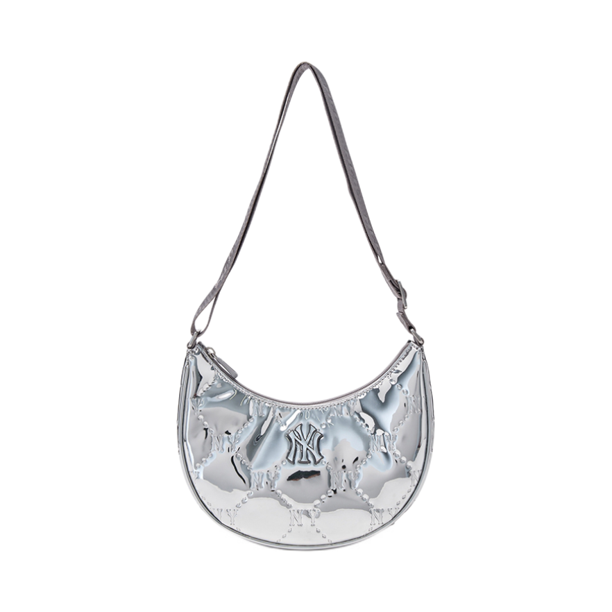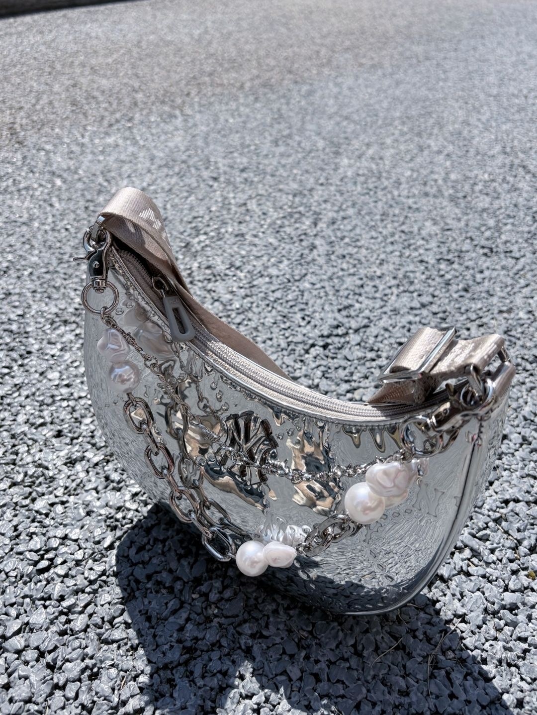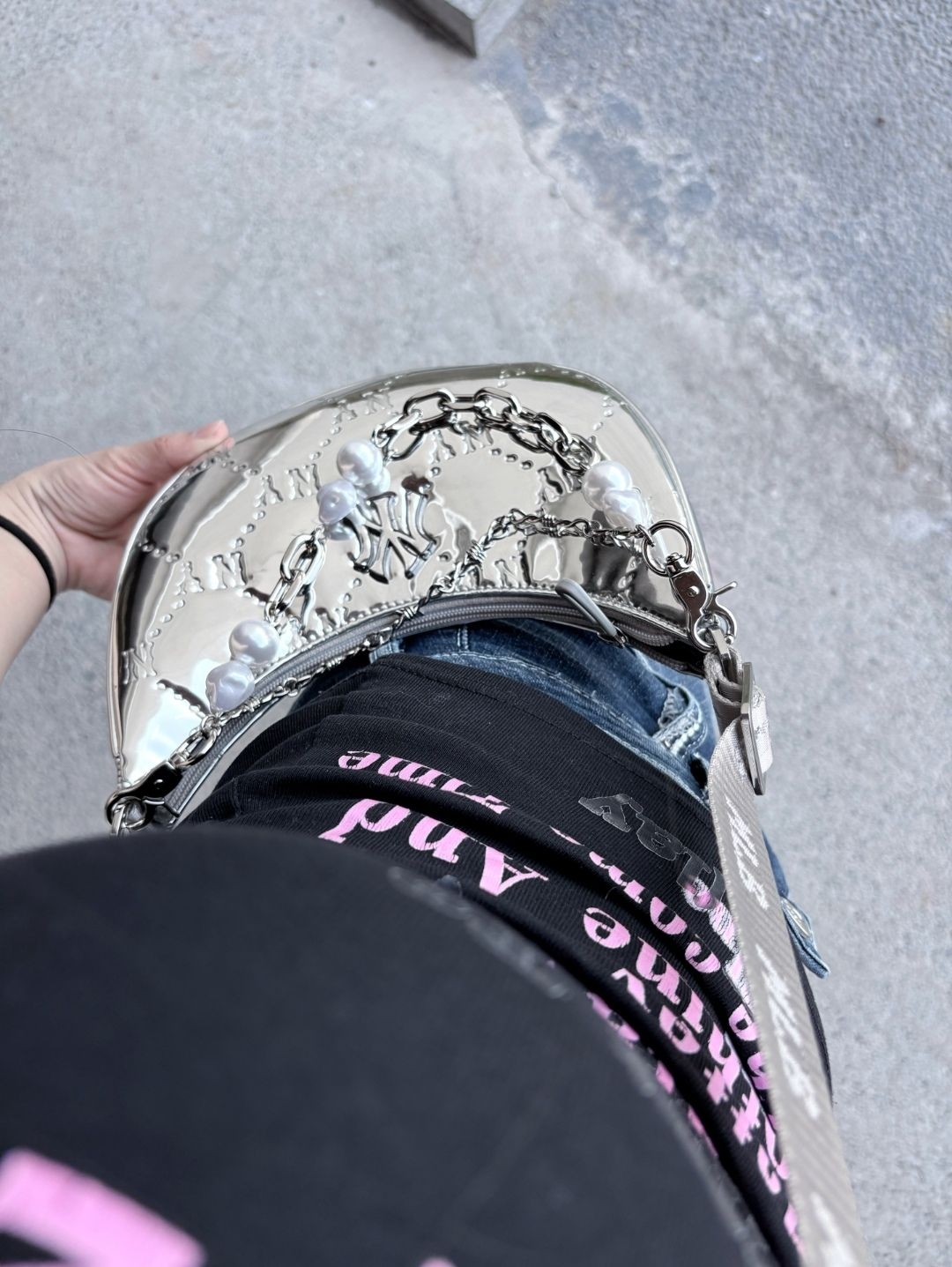 谁懂啊!原本简约的MLB银色月牙腋下包,加上这条珍珠链条改造后直接变时髦单品! 亮面镜面皮质自带未来感,月牙造型利落显气质,日常单肩背就很飒。 改造后多了层温柔感,珍珠+金属链的混搭刚好中和了镜面的冷调,容量够装下手机、口红和粉饼,搭配甜酷风穿搭都很适配,小众不撞款~