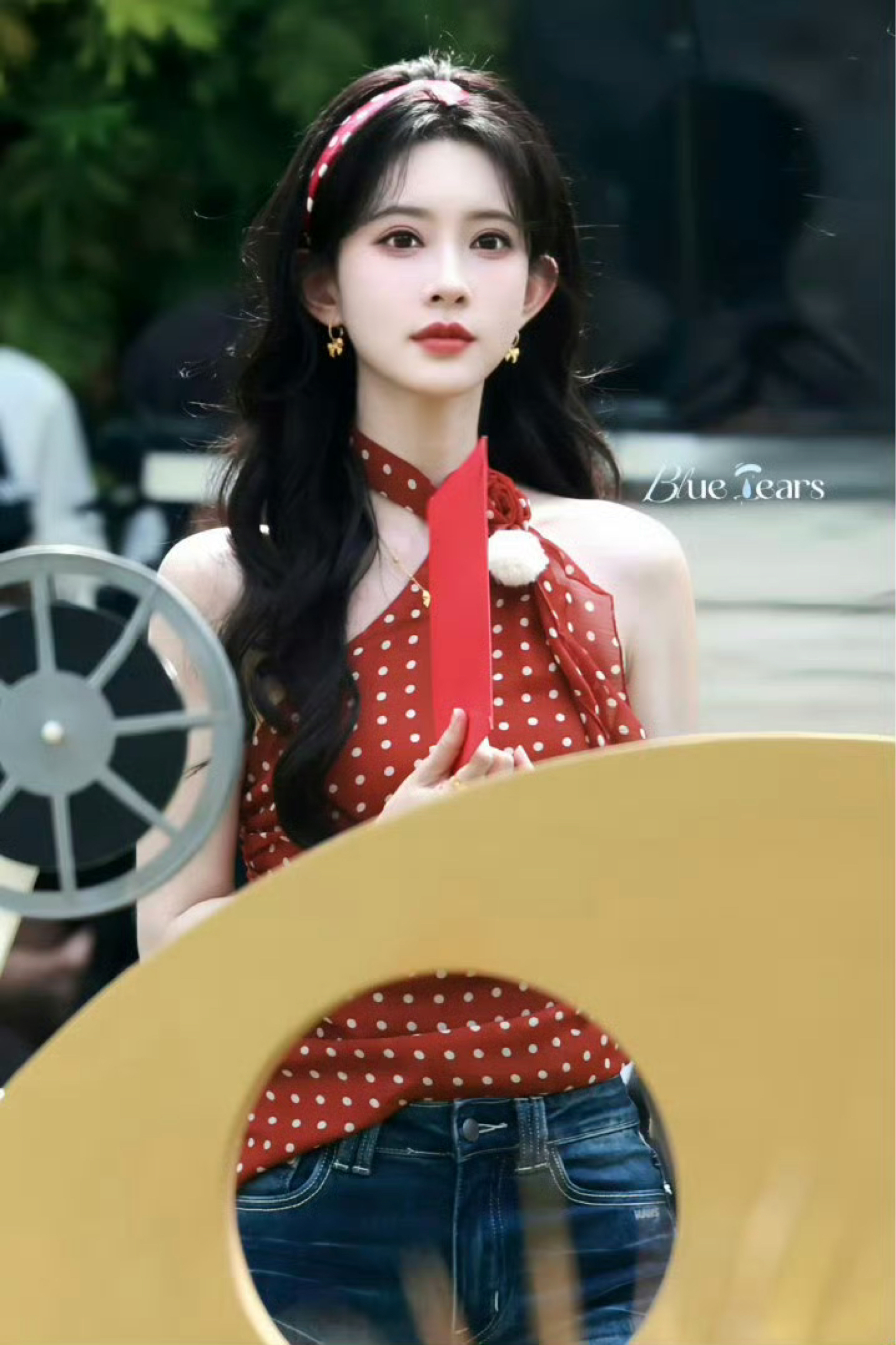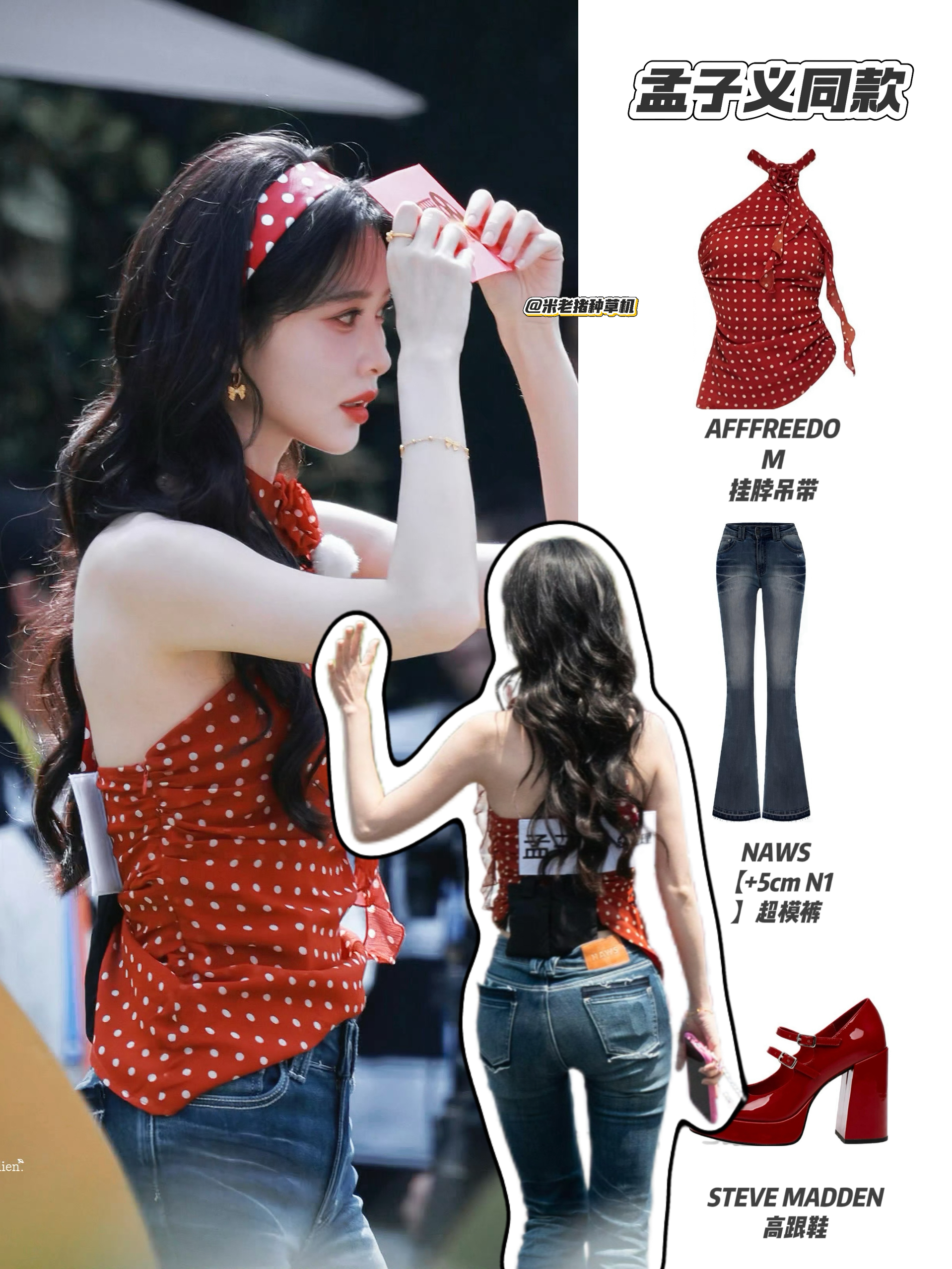 这套孟子义同款穿搭把复古港风拿捏得恰到好处✨ 酒红波点挂脖吊带自带复古滤镜,搭配同色系波点发箍,明艳又娇俏,高腰微喇牛仔裤拉长比例,红色玛丽珍高跟鞋点亮整体,衬得双腿纤细修长。 妆造明艳大气,卷发蓬松慵懒,红唇与红调单品呼应,复古又灵动,美得张扬又有韵味。