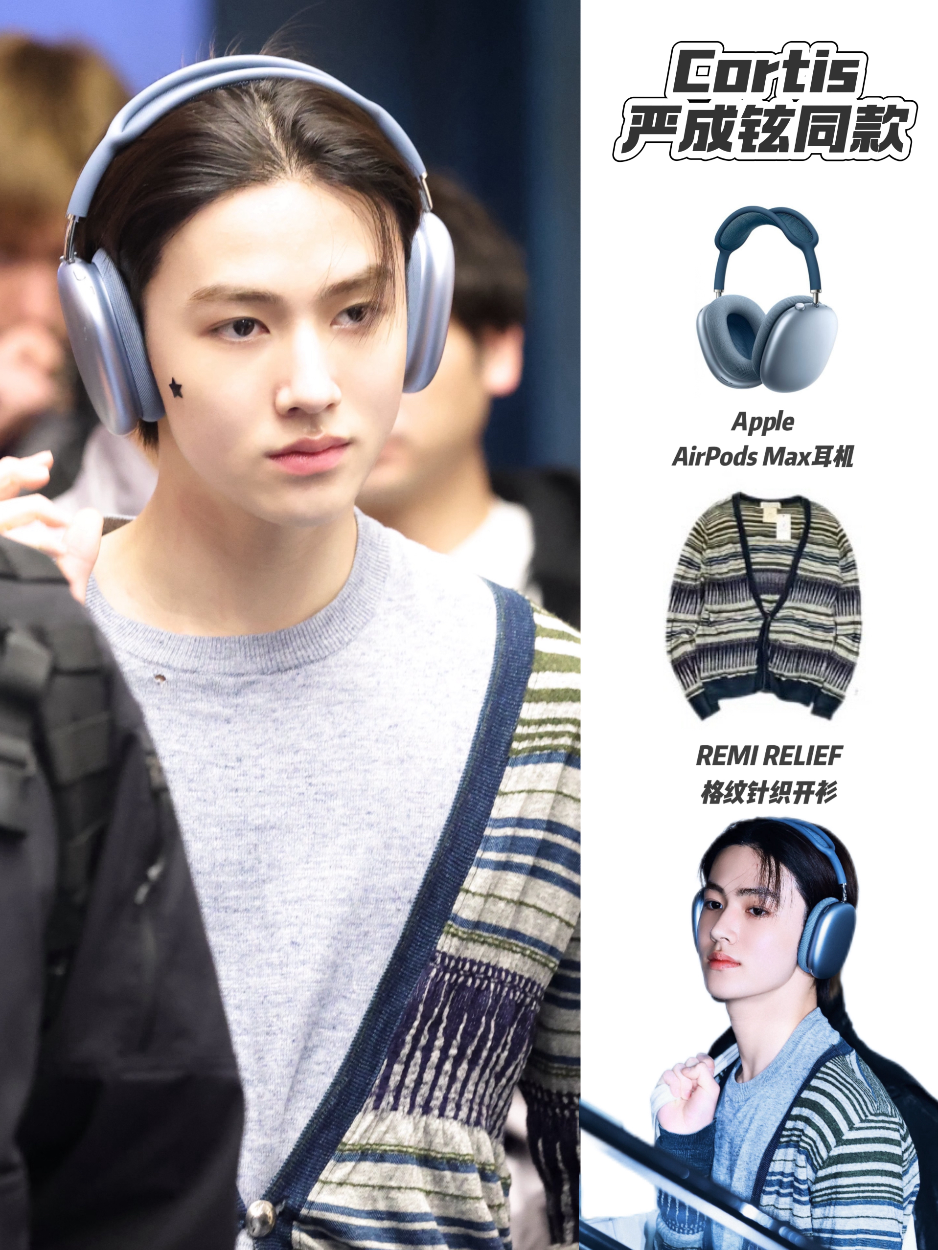 盐盐这套穿搭把数码单品与复古针织的氛围感拉满了✨ 雾霾蓝AirPods Max耳机作为视觉焦点,柔和色调中和了格纹开衫的复古感,与内搭浅灰针织衫形成温柔色系呼应,层次分明又清爽。 数码单品不再是工具,而是穿搭的点睛之笔,慵懒随性又充满少年感,完美诠释了“耳机党”的时髦感。
