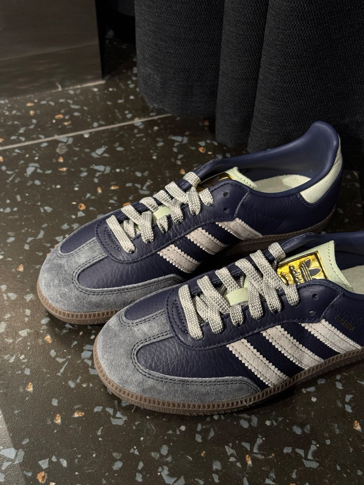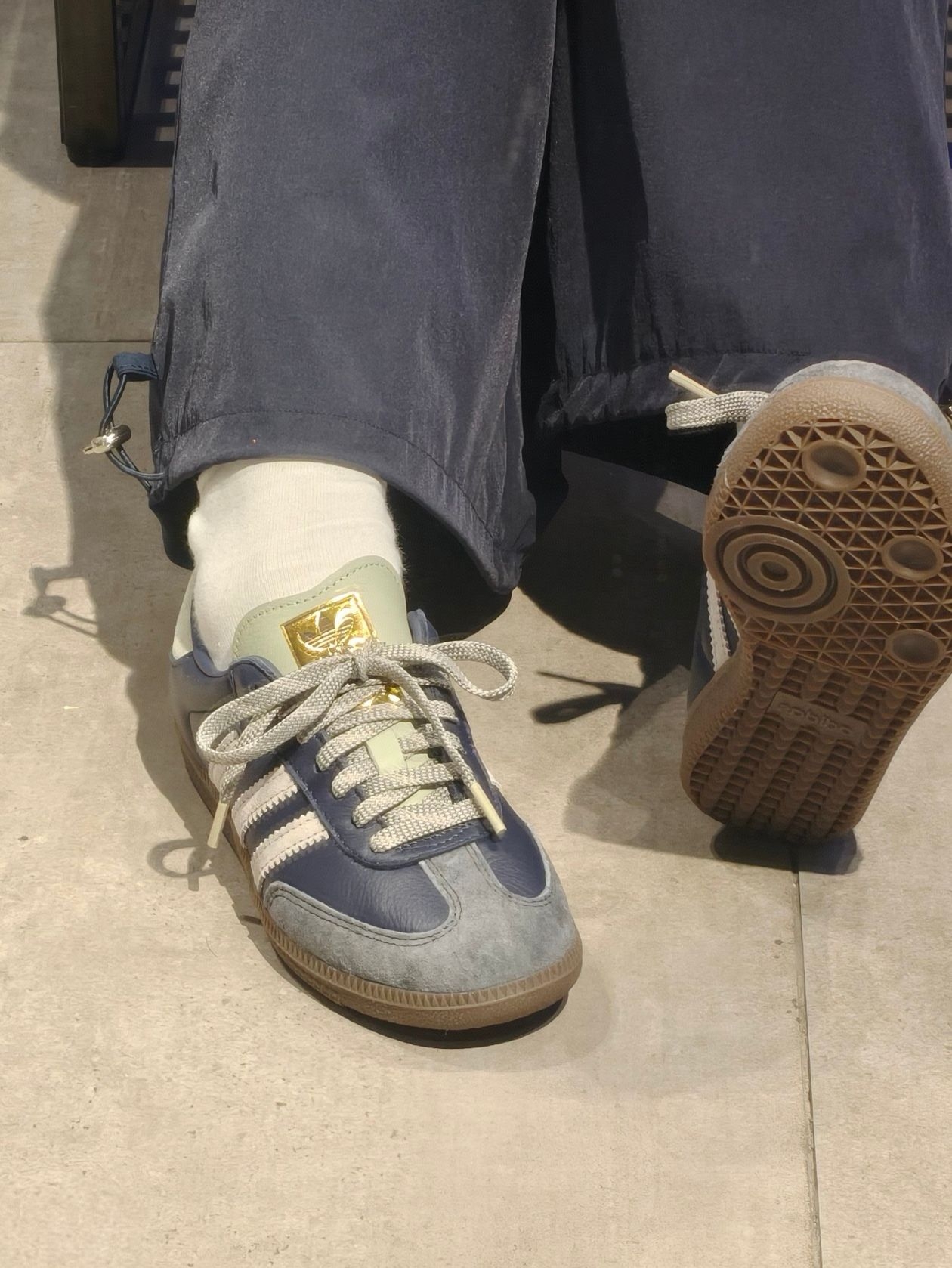 蓝色皮革➕雾霾蓝麂皮结合 绝绝子✨ 鞋绳还是双色编织的 真的细节感满满💯 最吸引我的还是鞋舌的大金标😻 阿迪真的太会设计了😋 鞋子穿上也是软软的上脚很舒服😌 这个蓝色我真的狂喜啊🤩
