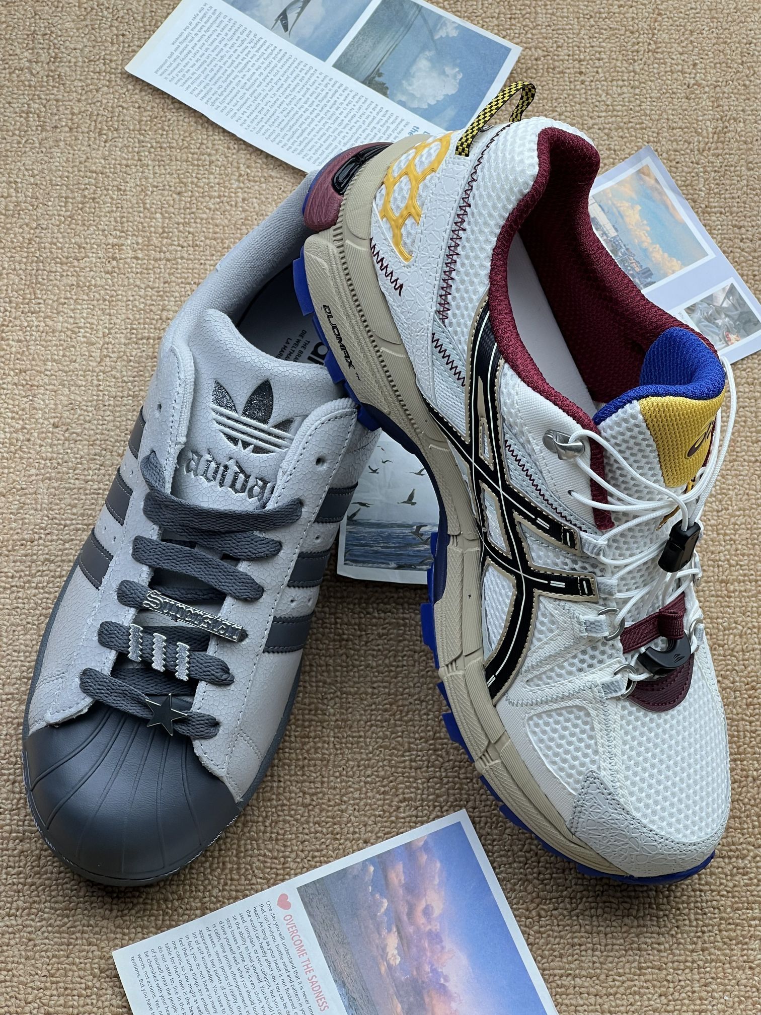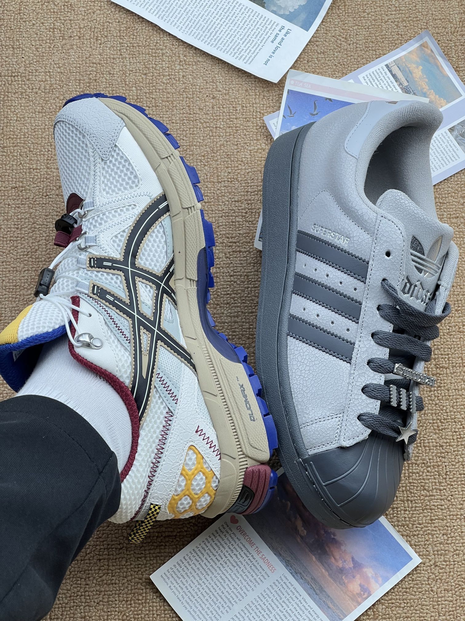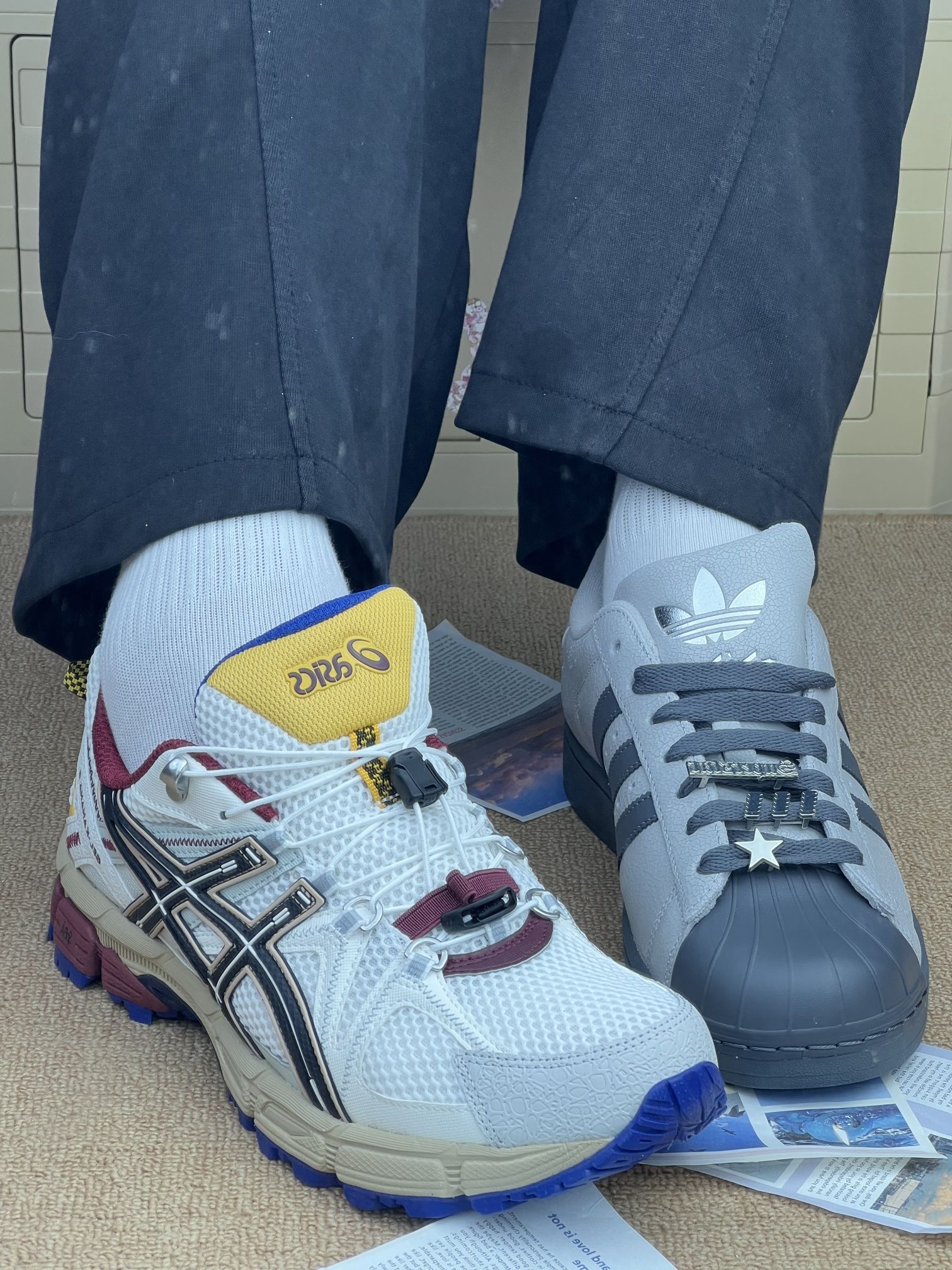 - adidas Superstar:爆裂纹皮面+贝壳头,复古感拉满,搭牛仔裤很顺眼。但鞋型偏硬,刚上脚磨脚踝,厚底走路久了脚底板会酸,爆裂纹容易积灰,清洁起来有点麻烦。✨ - Asics 户外款:网面透气,夏天穿不闷脚,鞋带扣设计很省心,不用反复系。不过鞋身偏重,走路会有点坠脚,配色太跳脱,日常搭配限制多,鞋底纹路深,容易卡小石子。💡 两双鞋各有取舍:Superstar 胜在百搭复古,却...